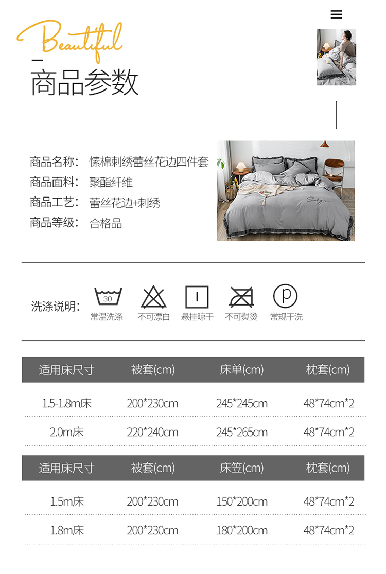 商品名称:金麦家纺 2020新款愫棉刺绣蕾丝花边四件套 浅灰