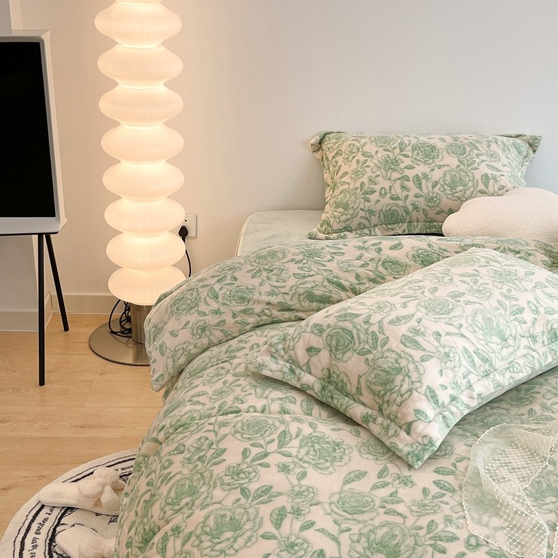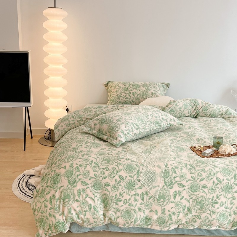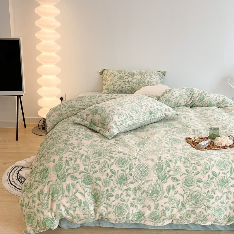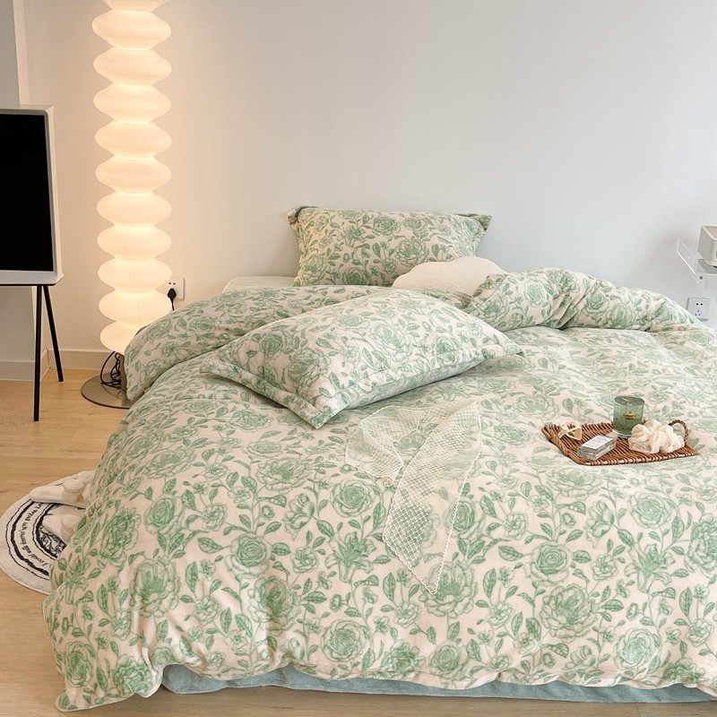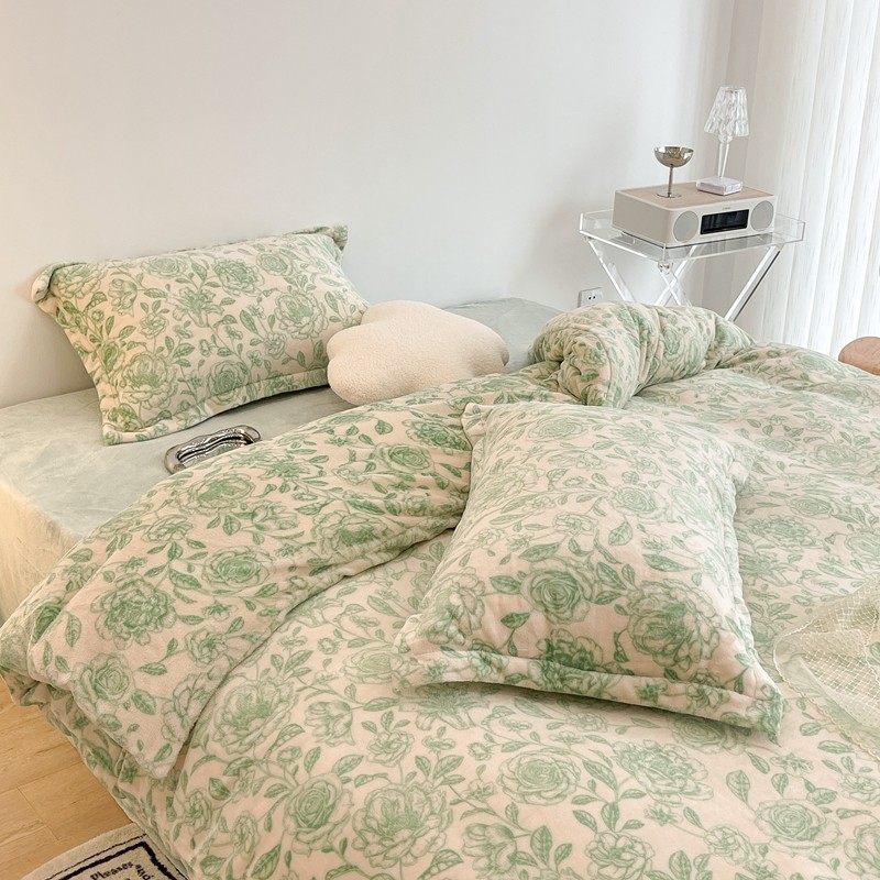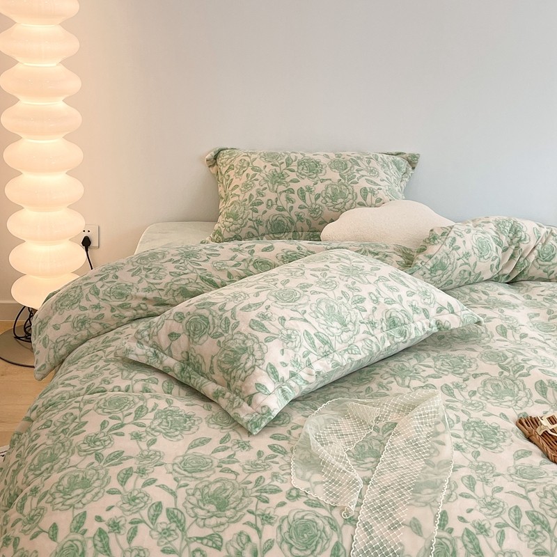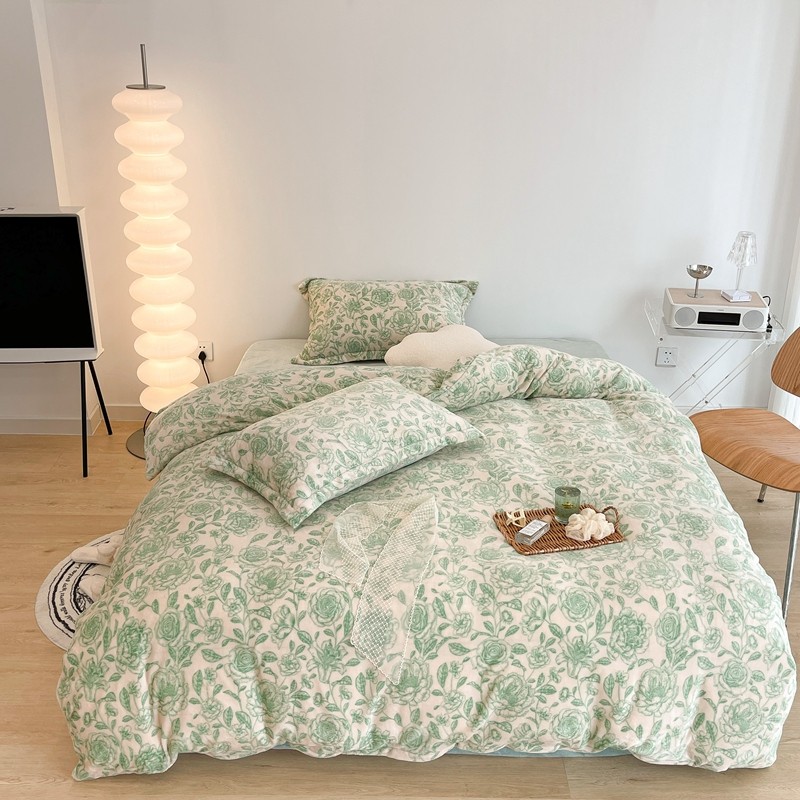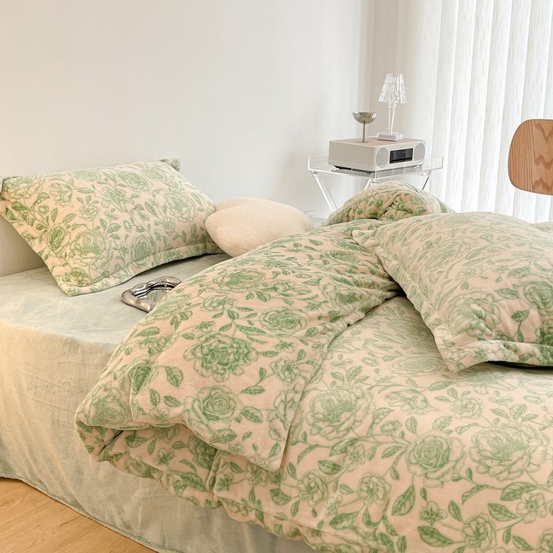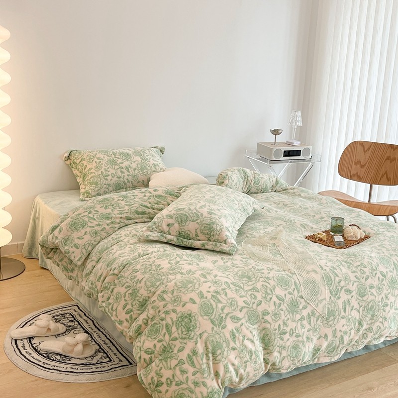 昔可家纺 2021新款牛奶绒四件套-二批 手绘山茶绿