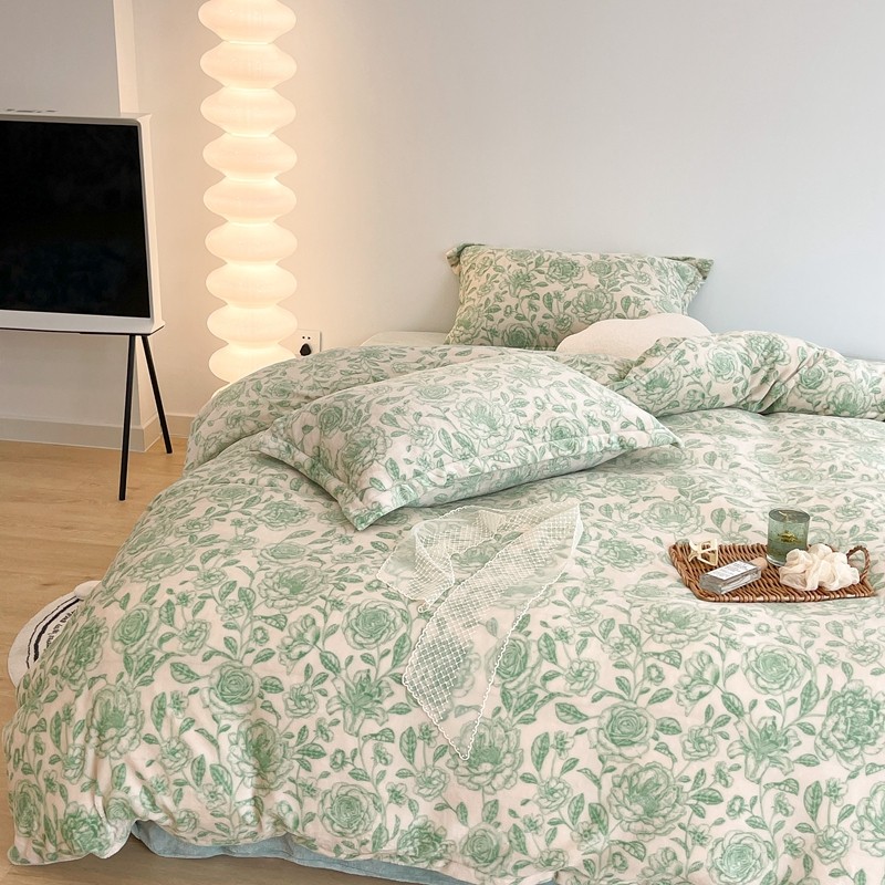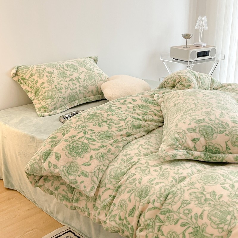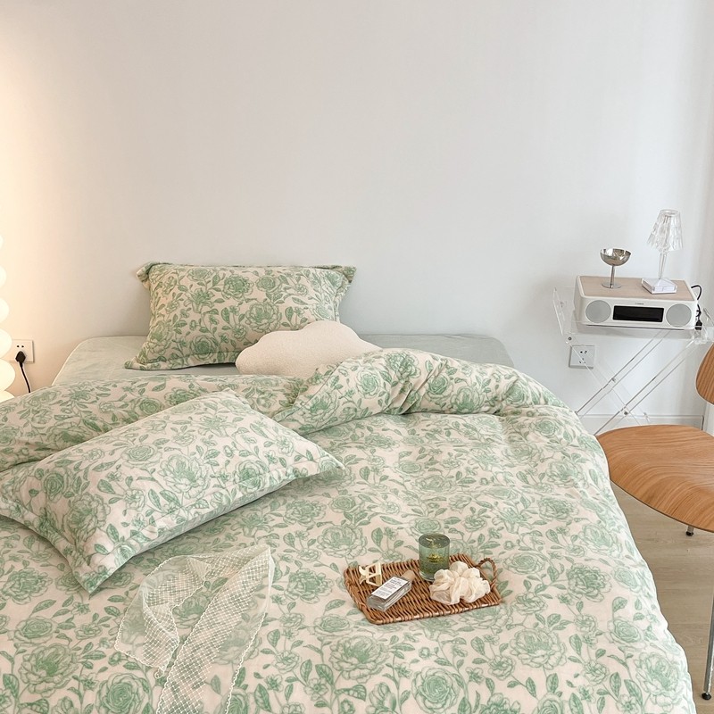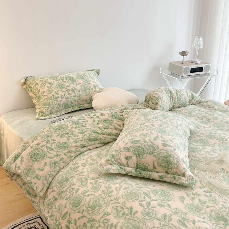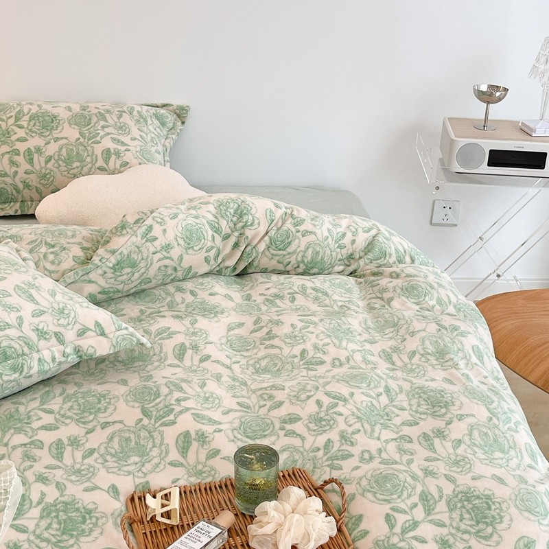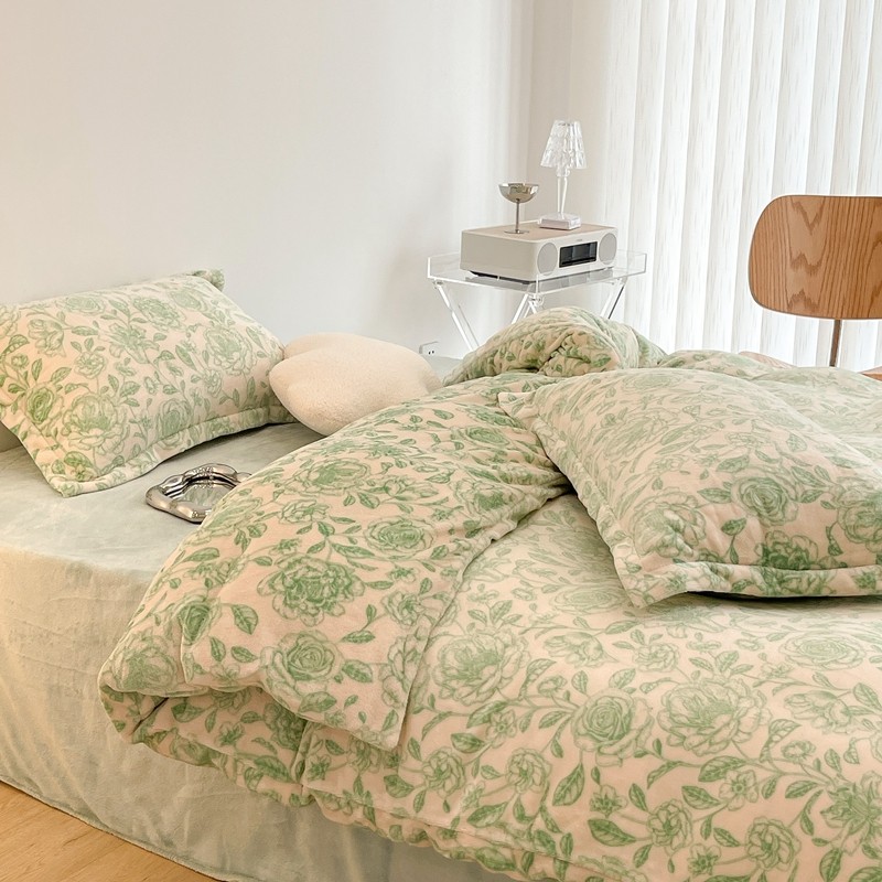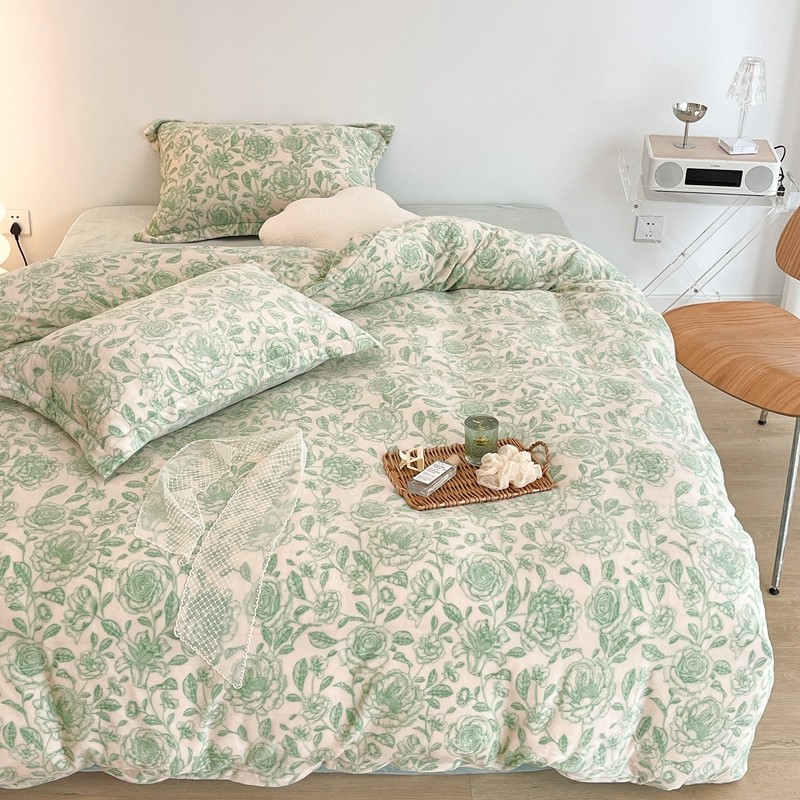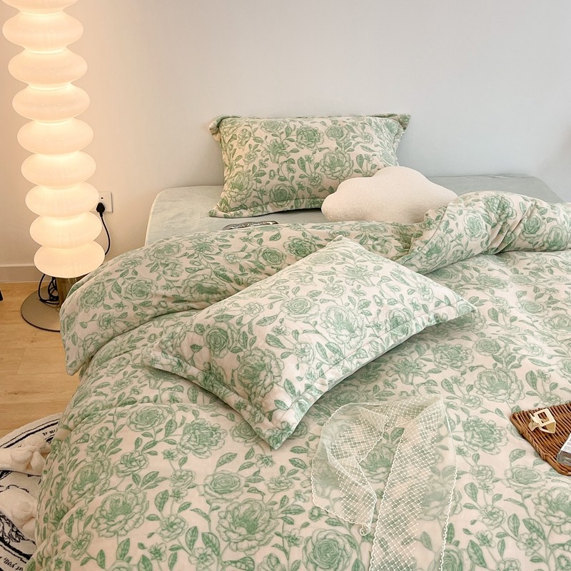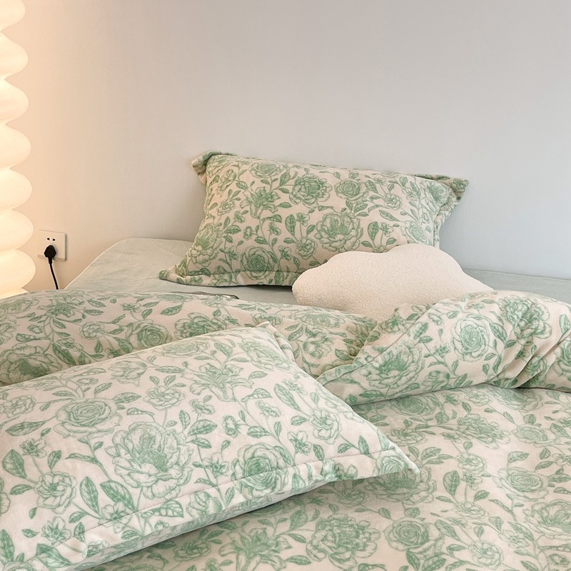 昔可家纺 2021新款牛奶绒四件套-二批 手绘山茶绿