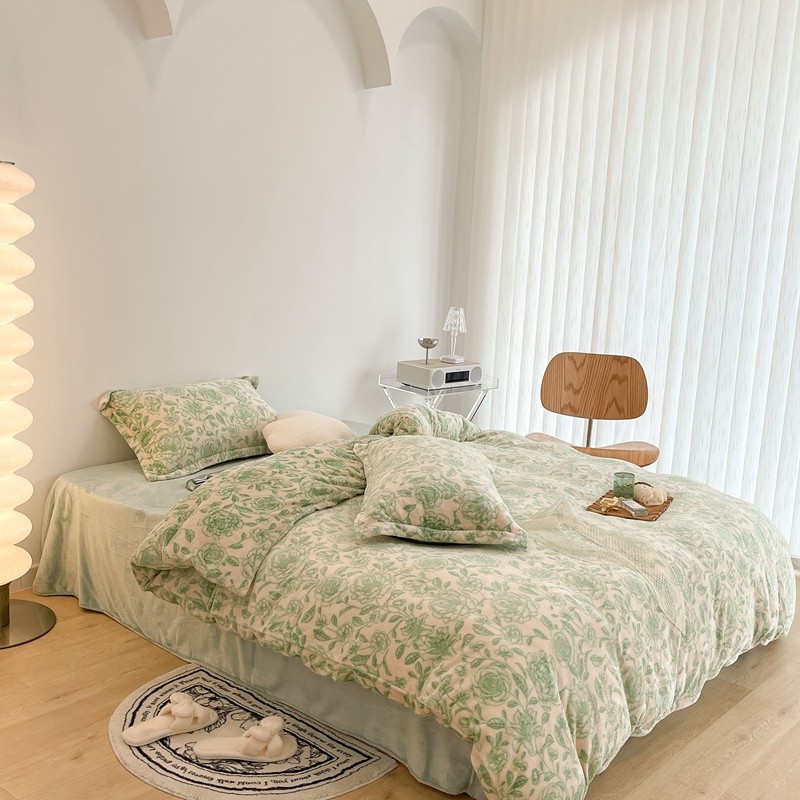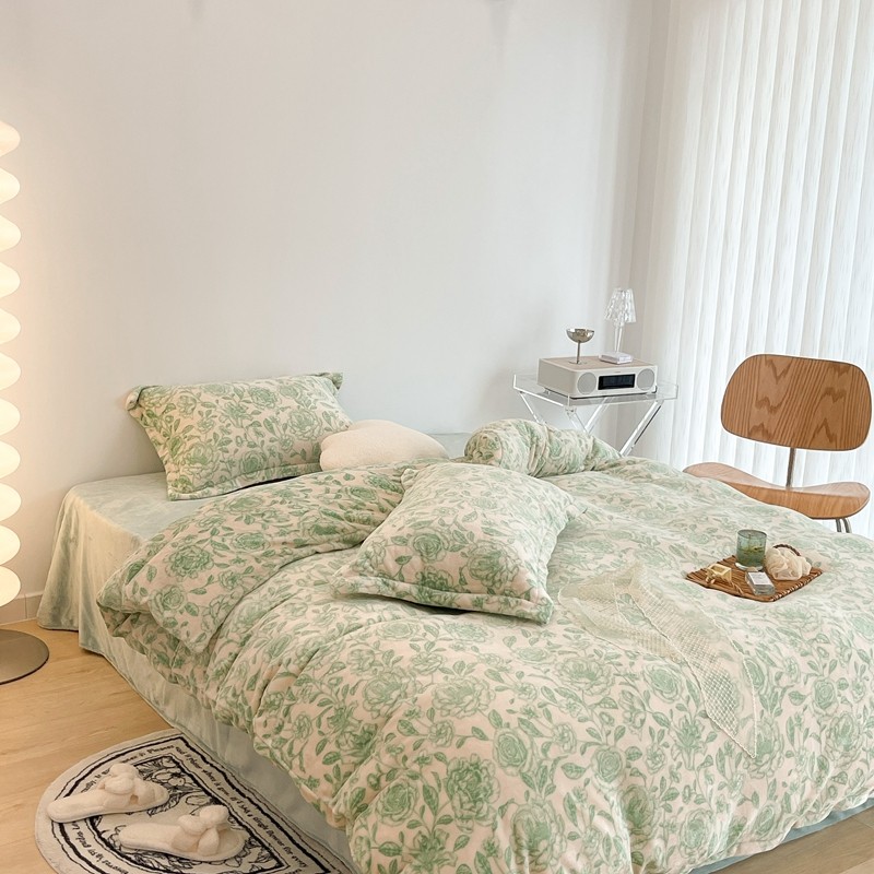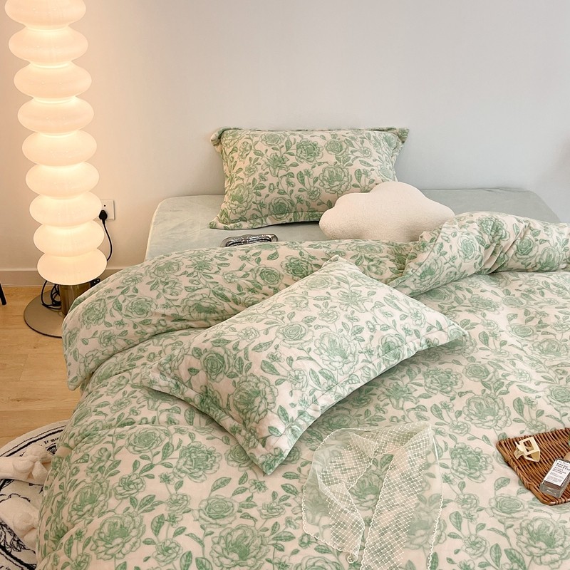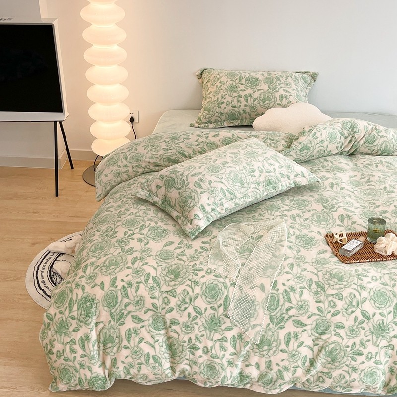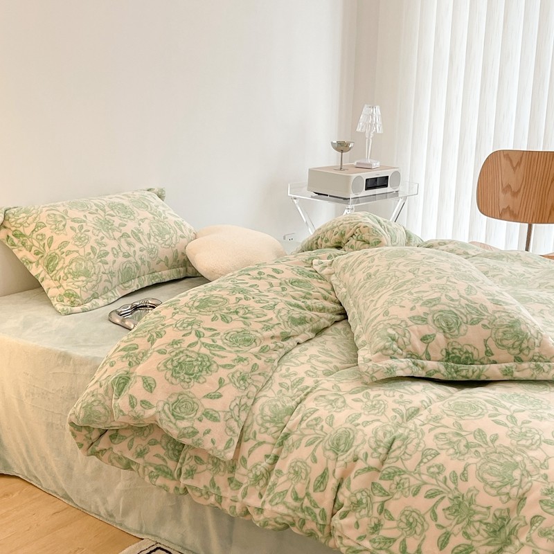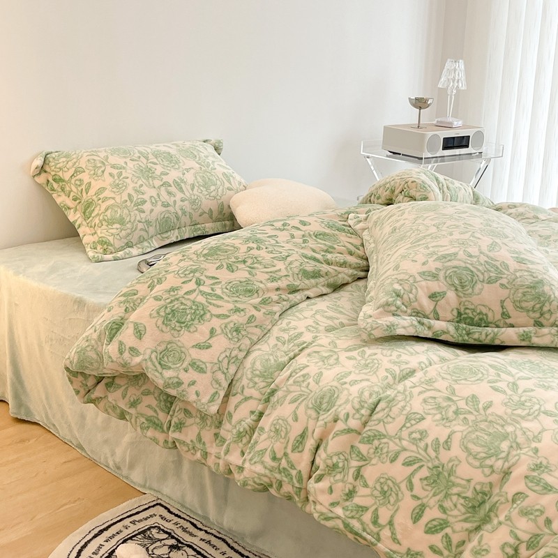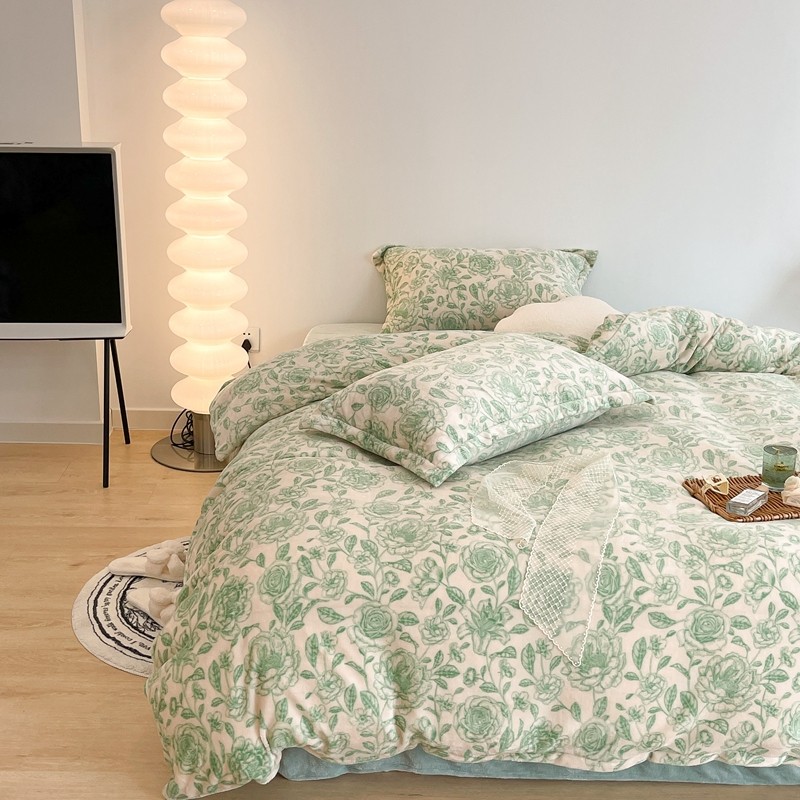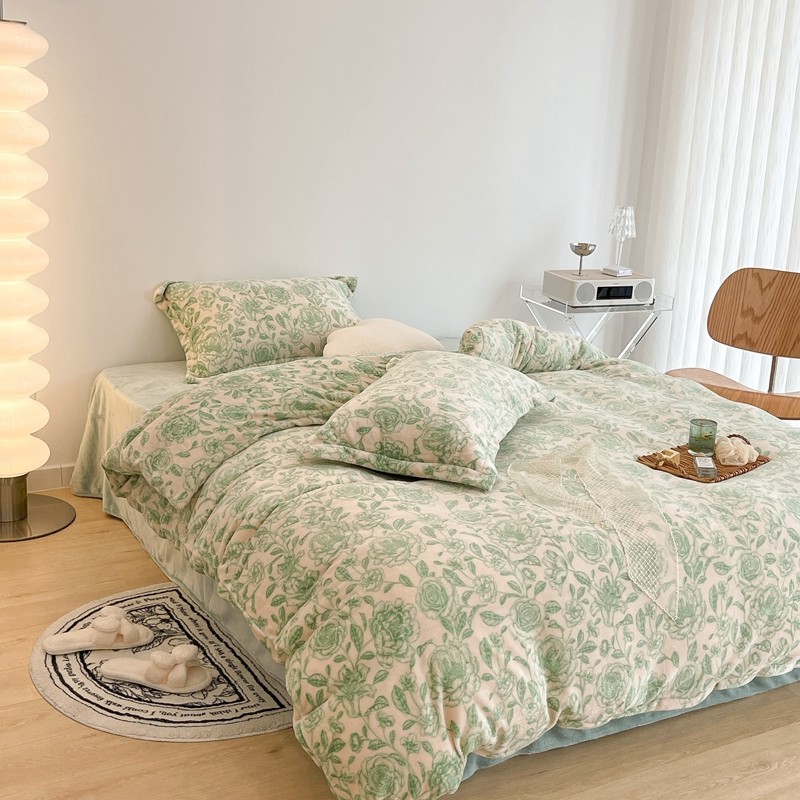 昔可家纺 2021新款牛奶绒四件套-二批 手绘山茶绿