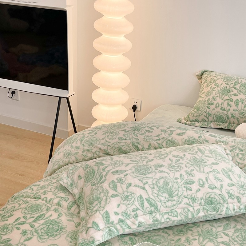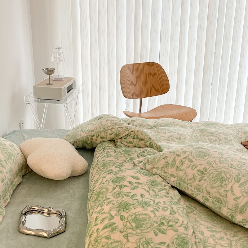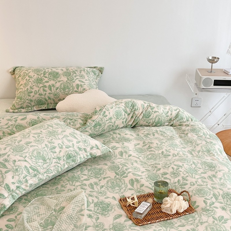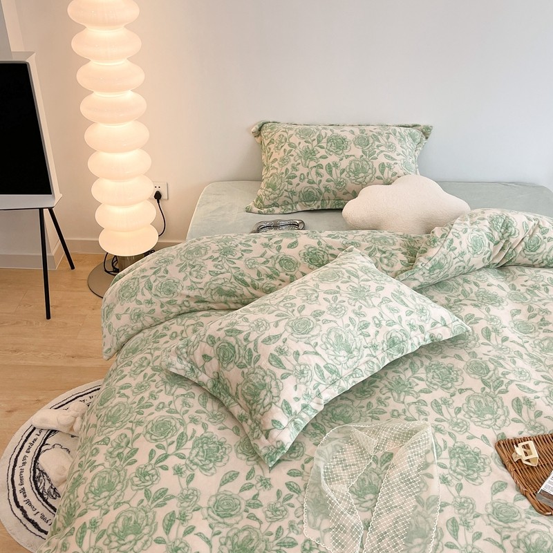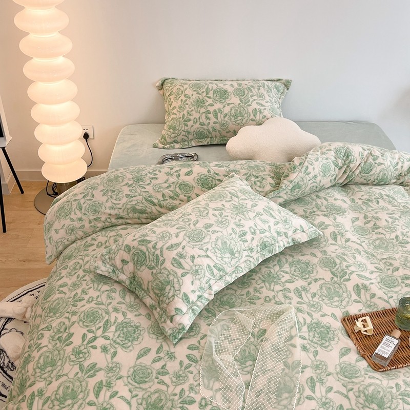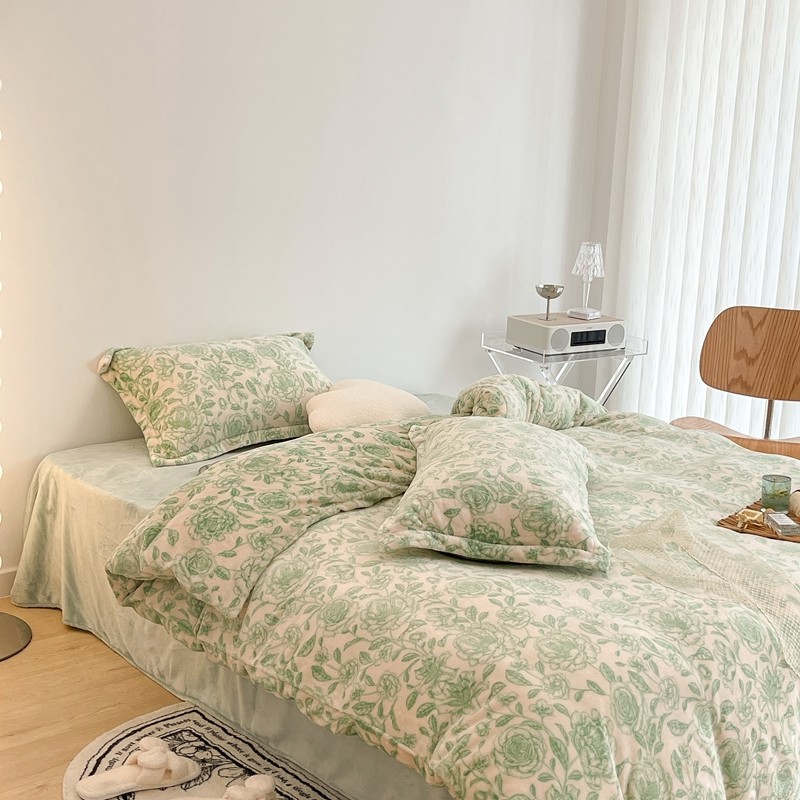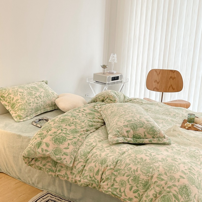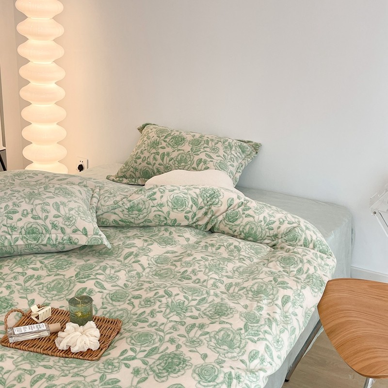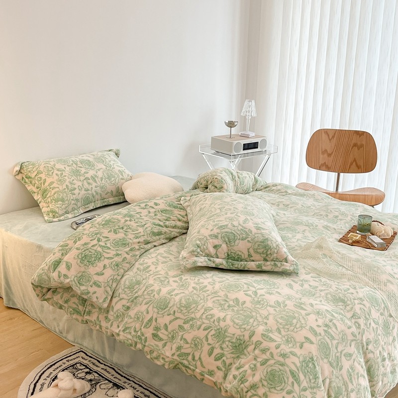昔可家纺 2021新款牛奶绒四件套-二批 手绘山茶绿