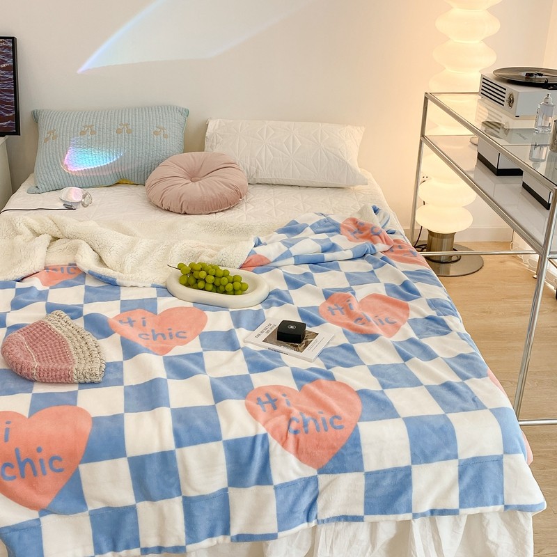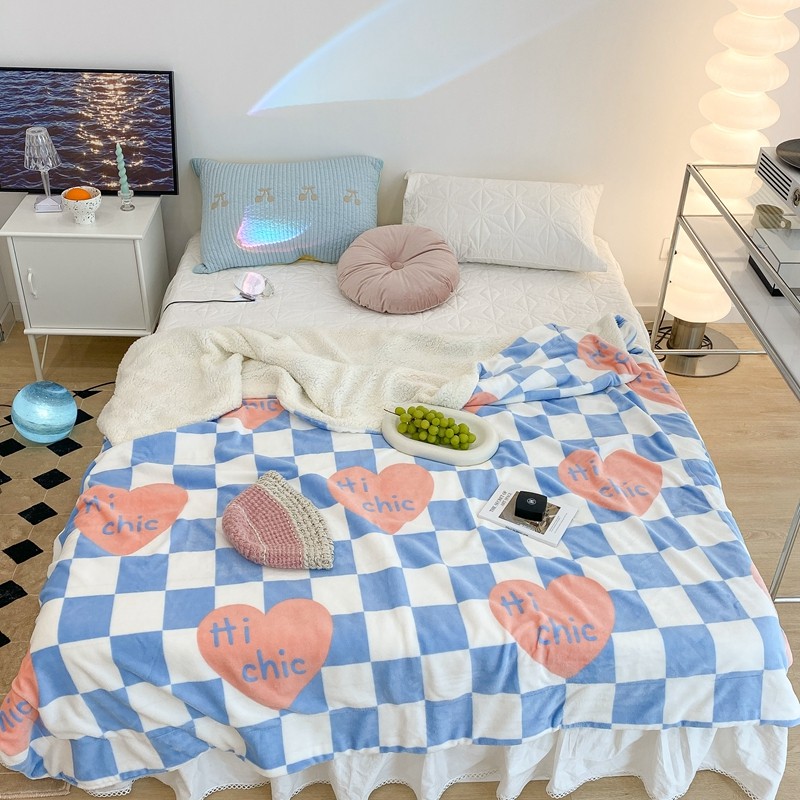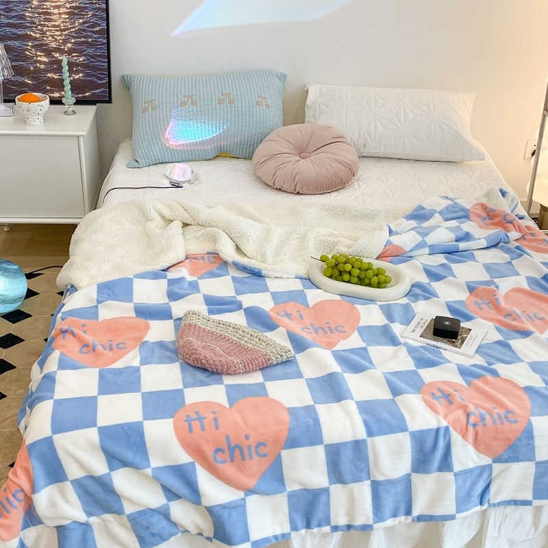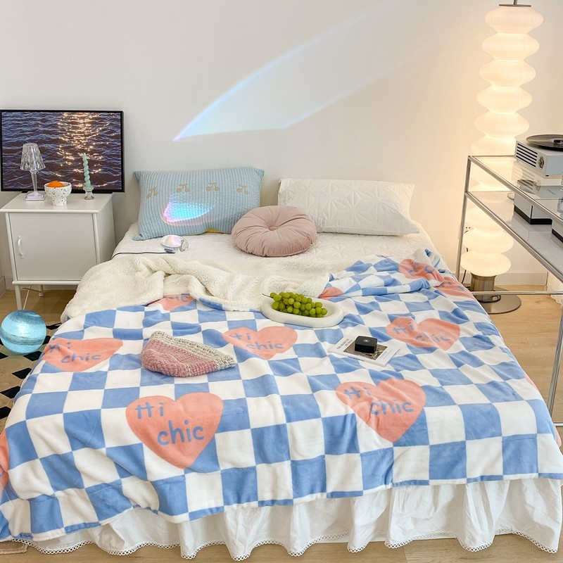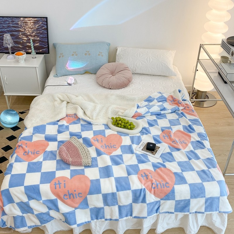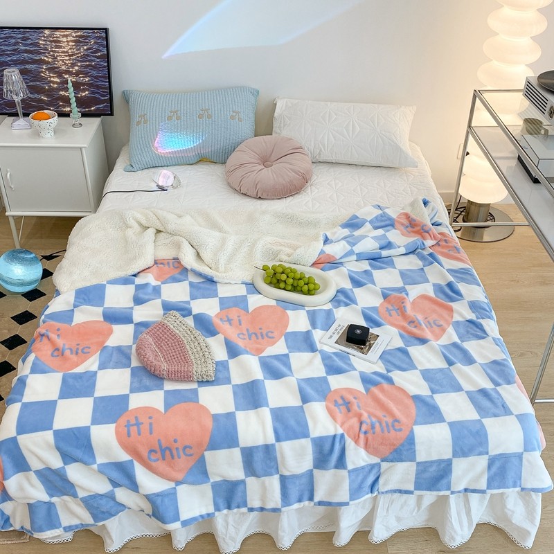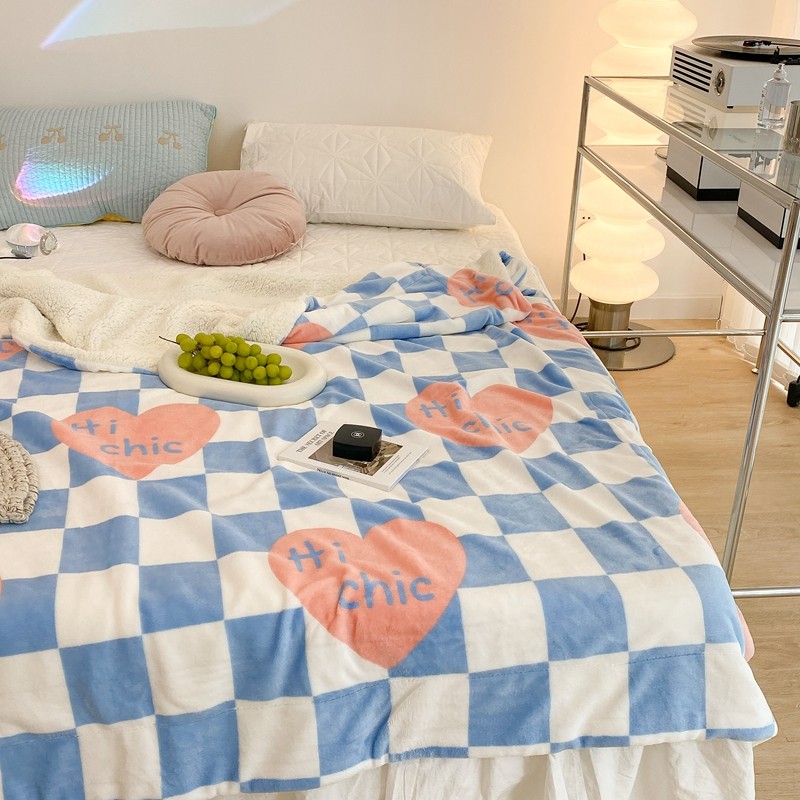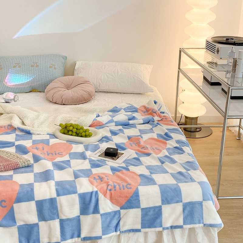 昔可家纺 2021新款牛奶羊羔绒印花毯 蓝棋盘爱心