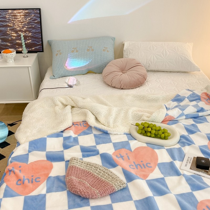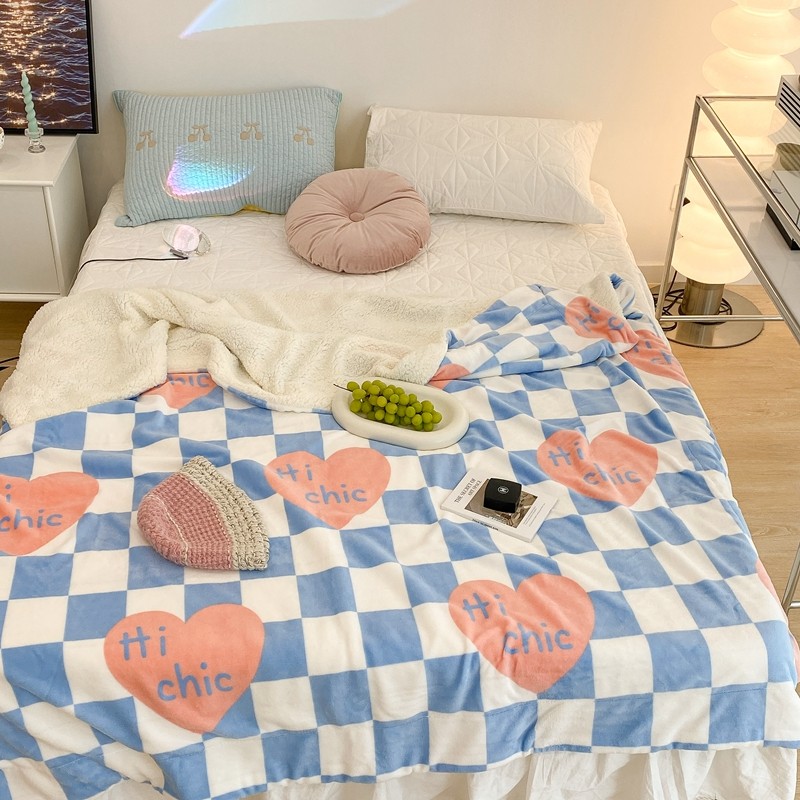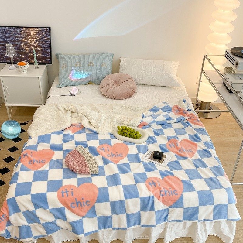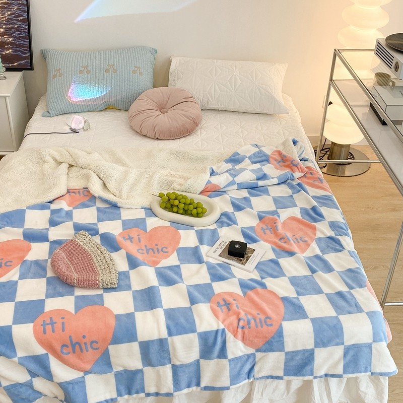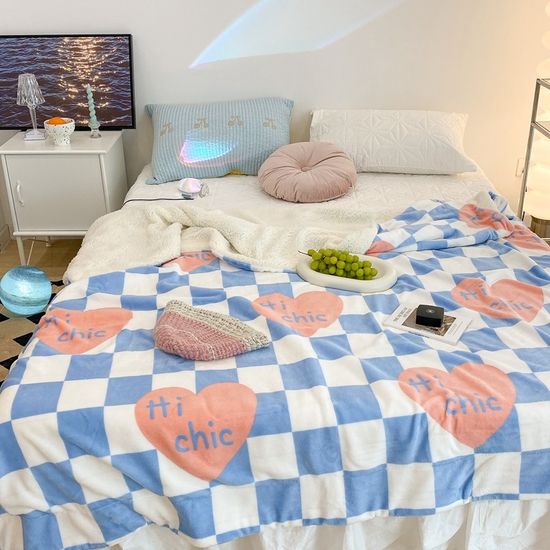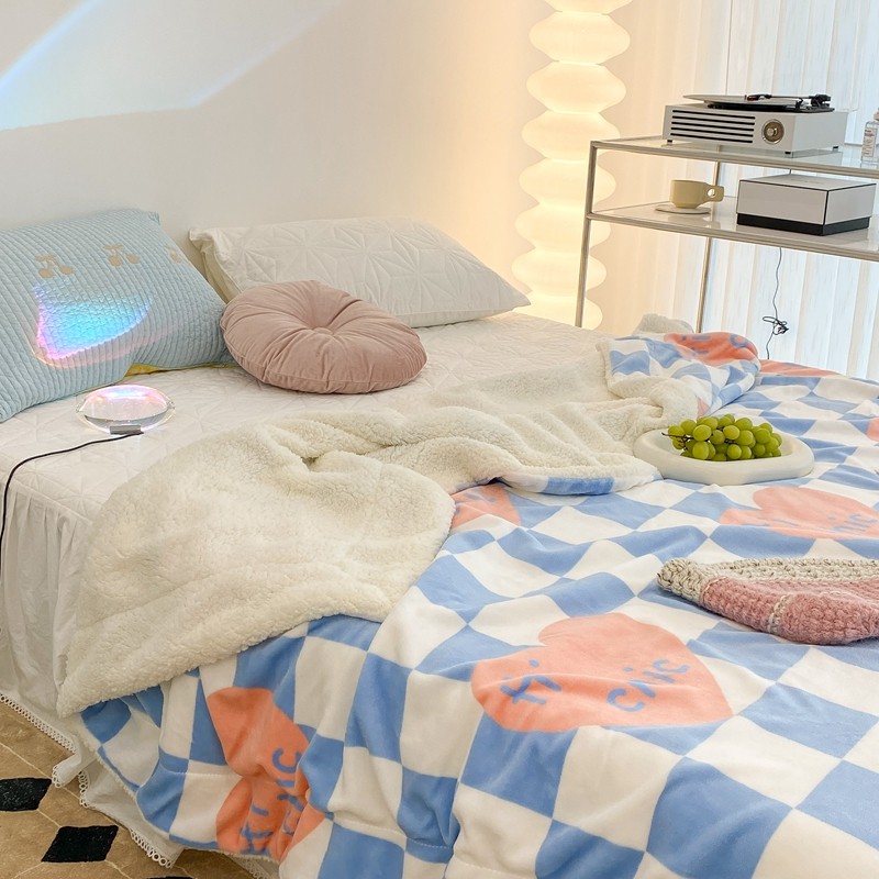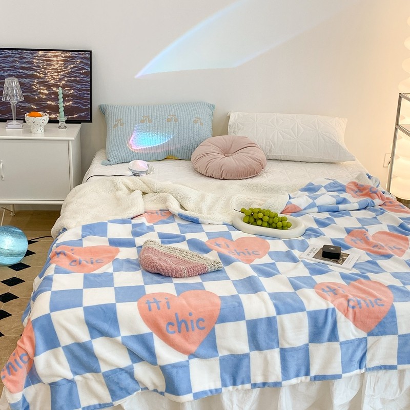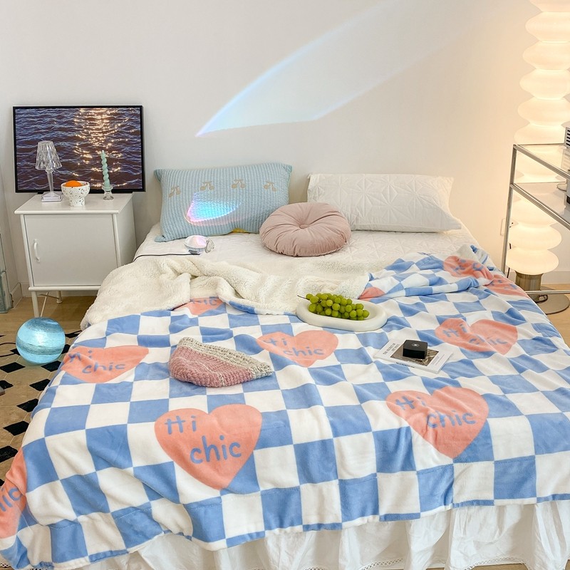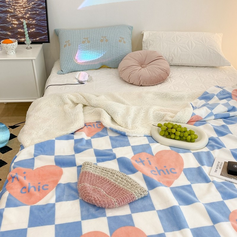 昔可家纺 2021新款牛奶羊羔绒印花毯 蓝棋盘爱心