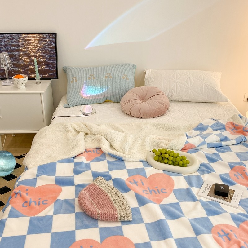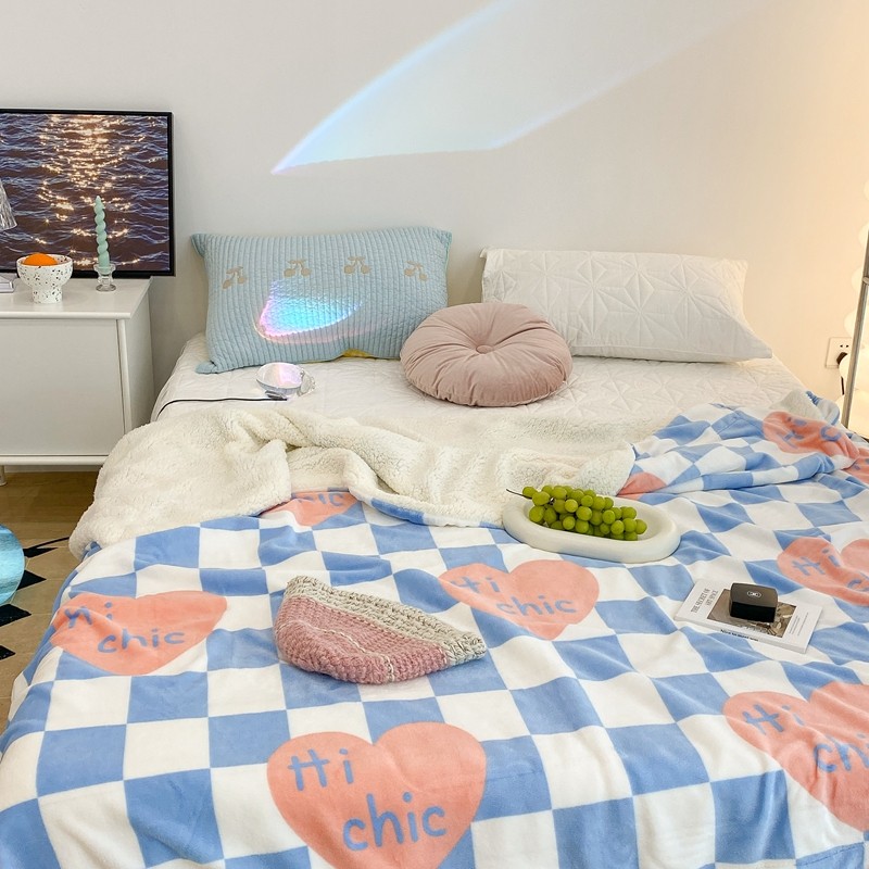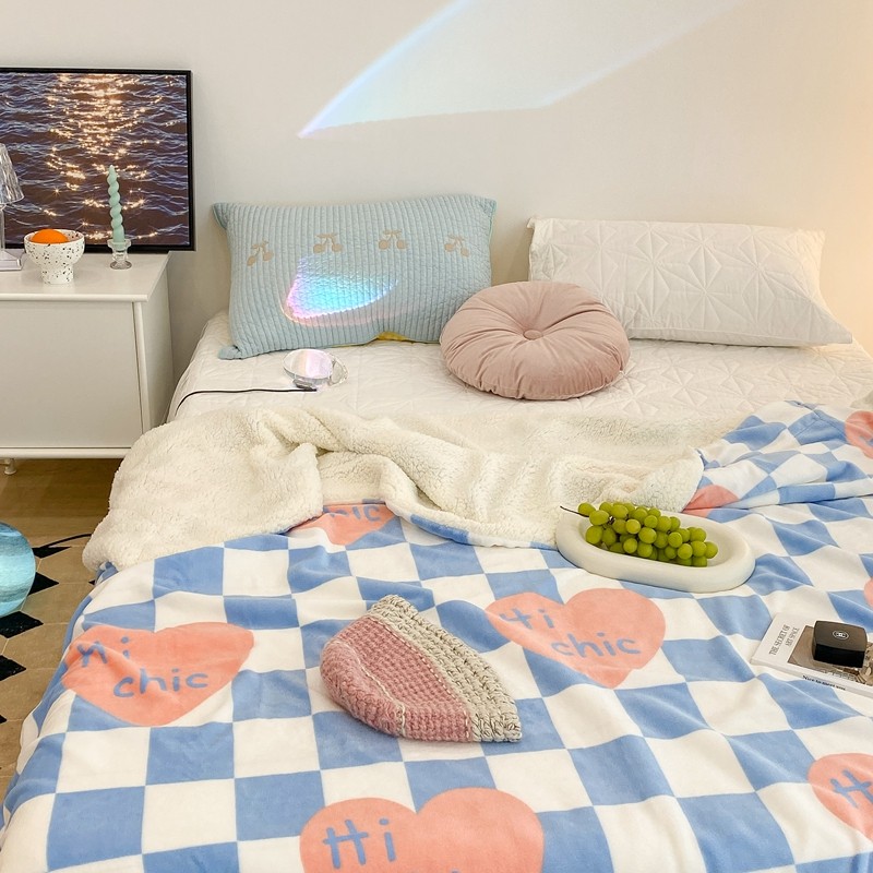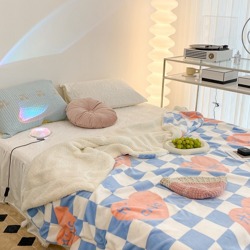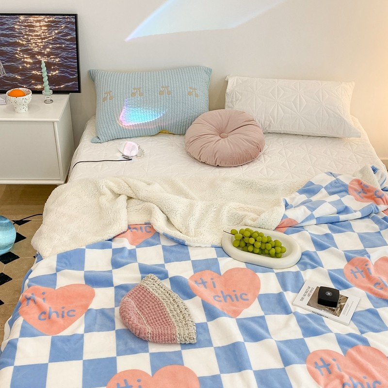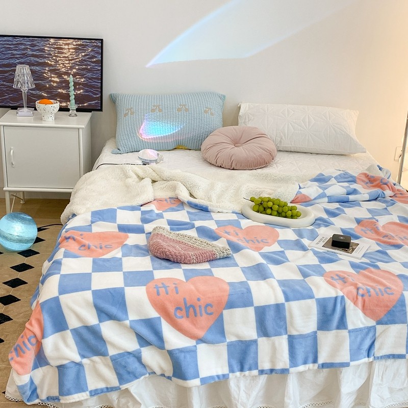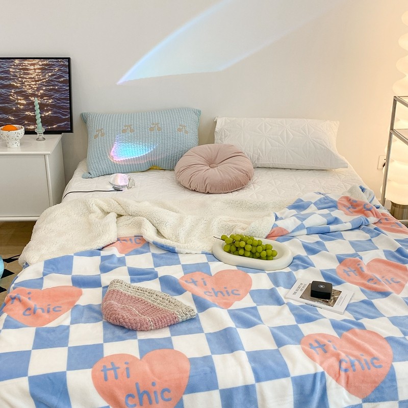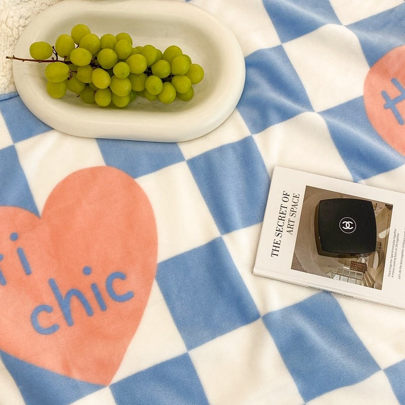 昔可家纺 2021新款牛奶羊羔绒印花毯 蓝棋盘爱心