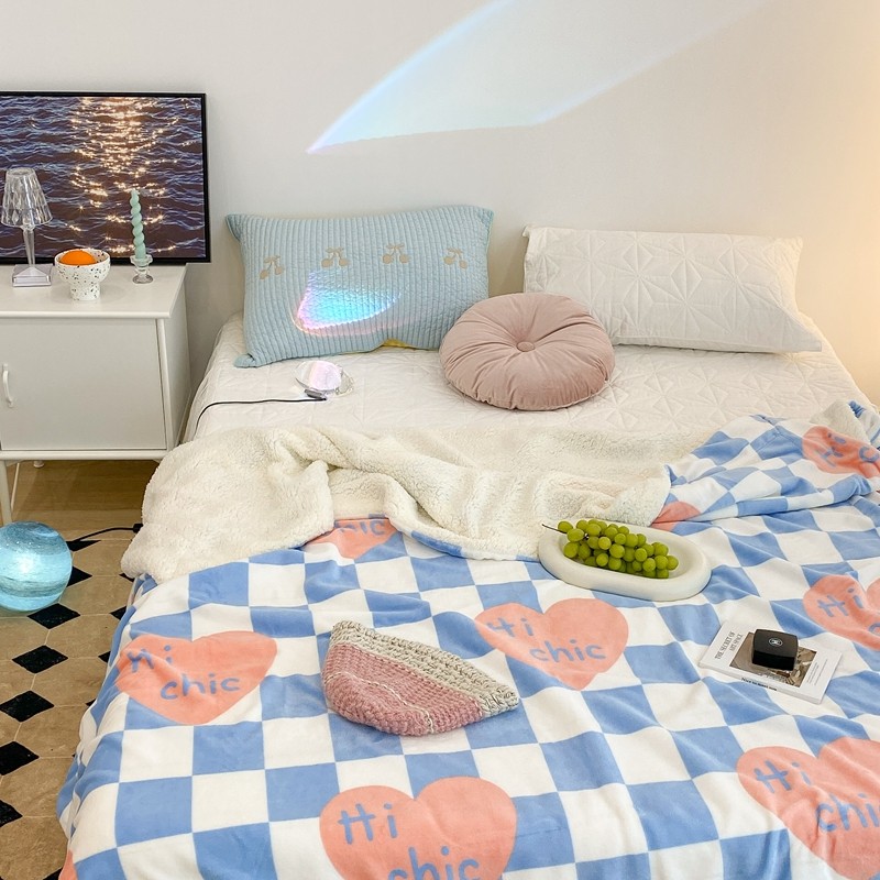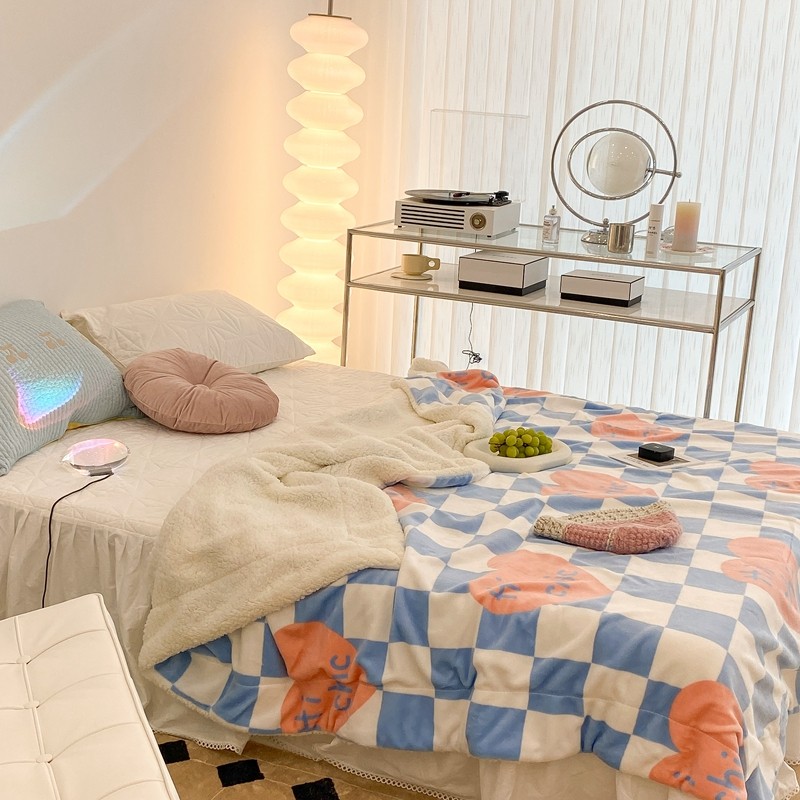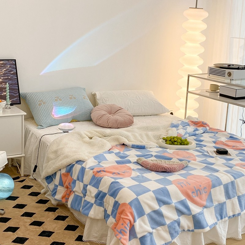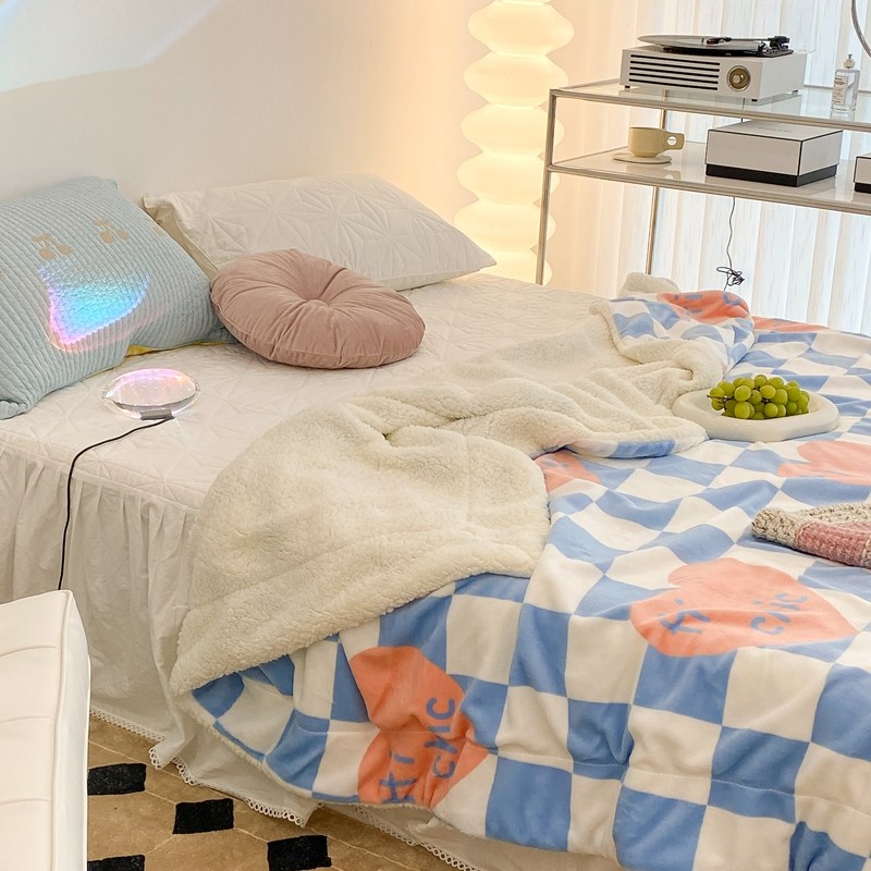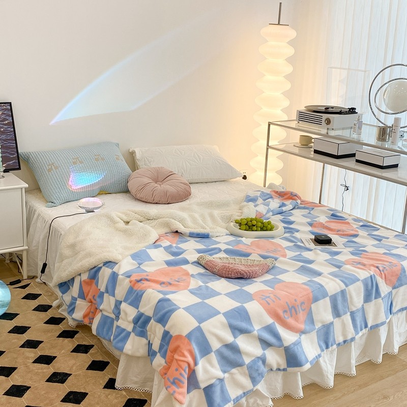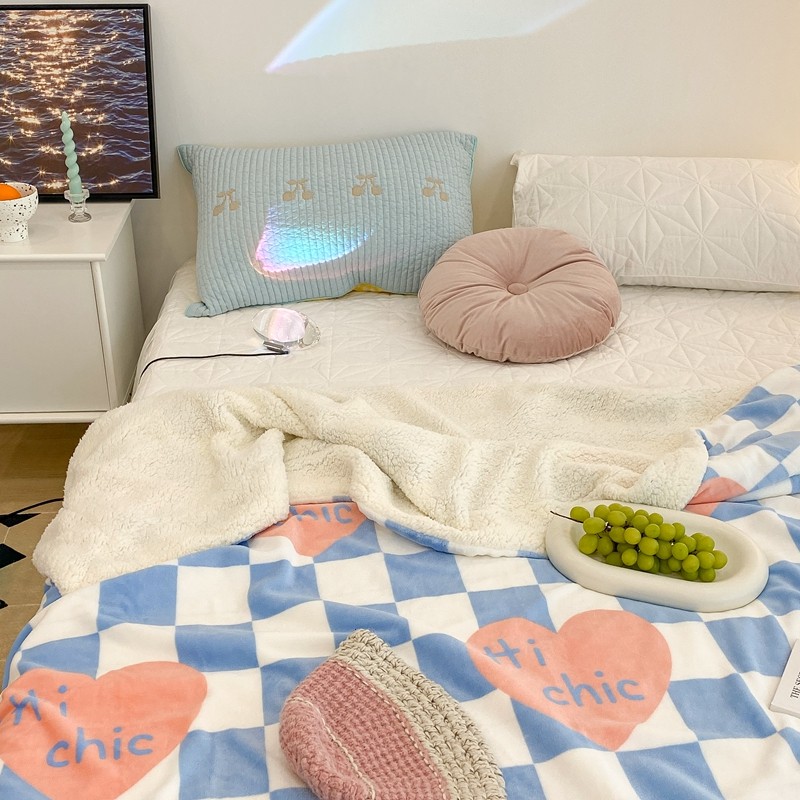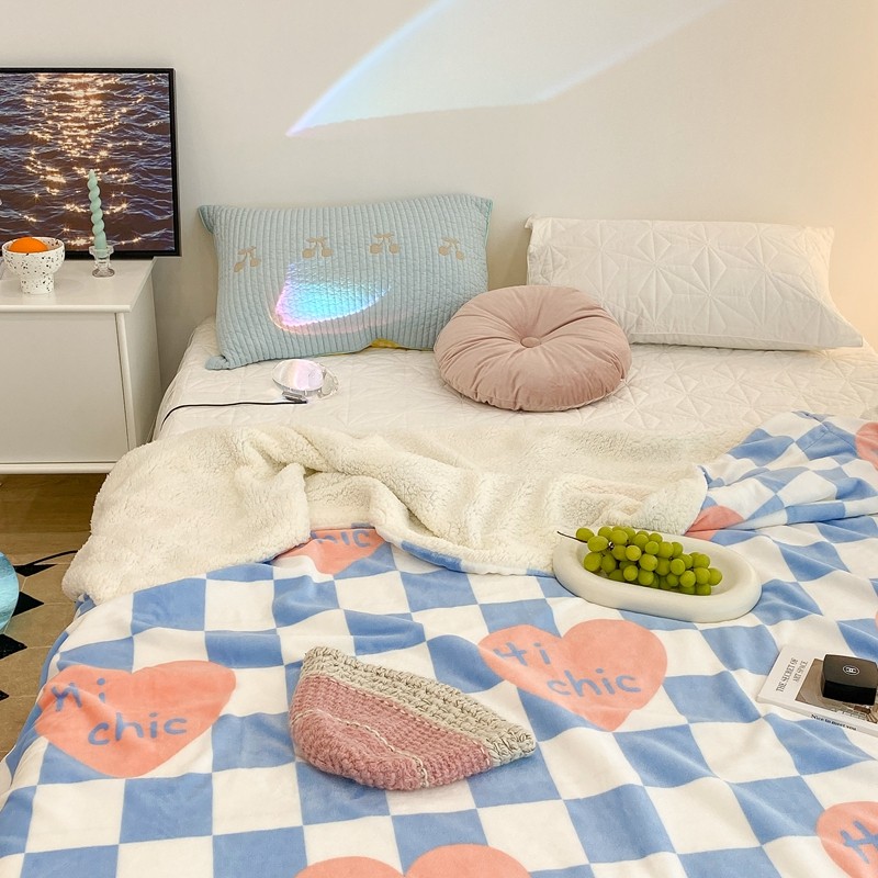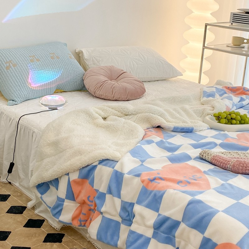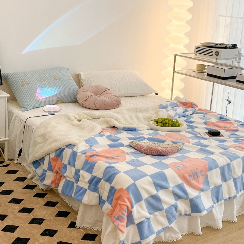 昔可家纺 2021新款牛奶羊羔绒印花毯 蓝棋盘爱心