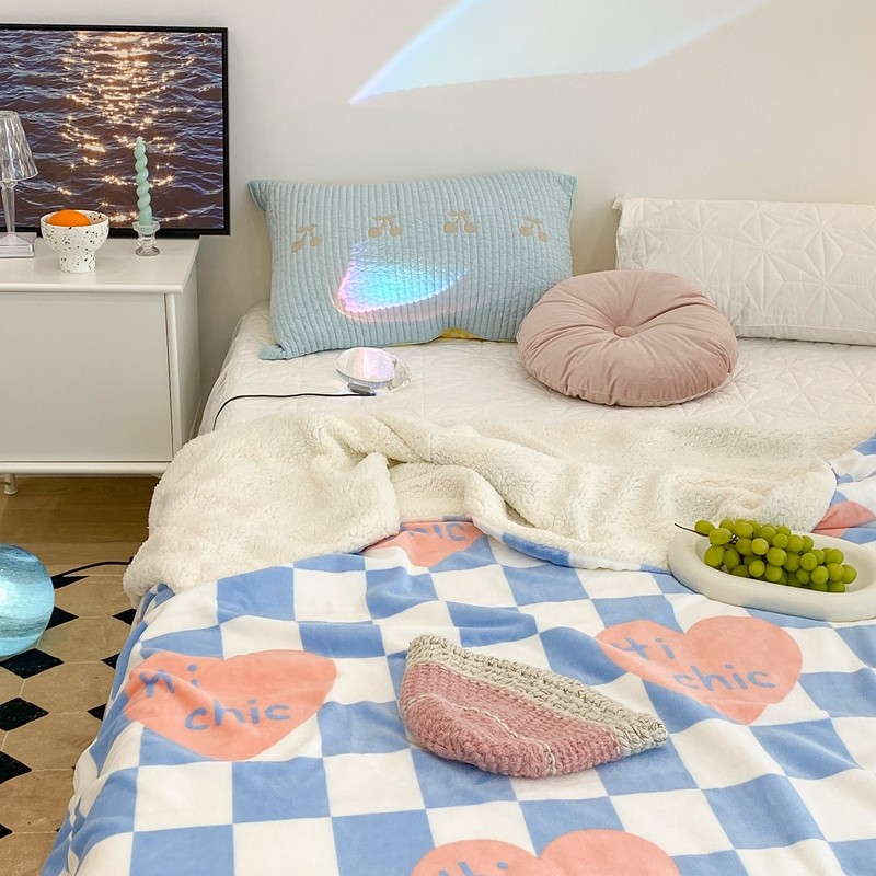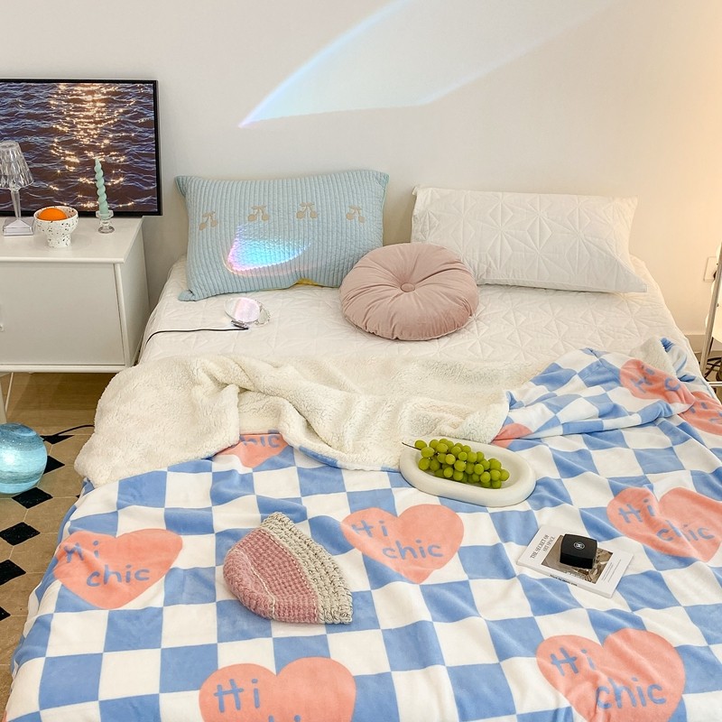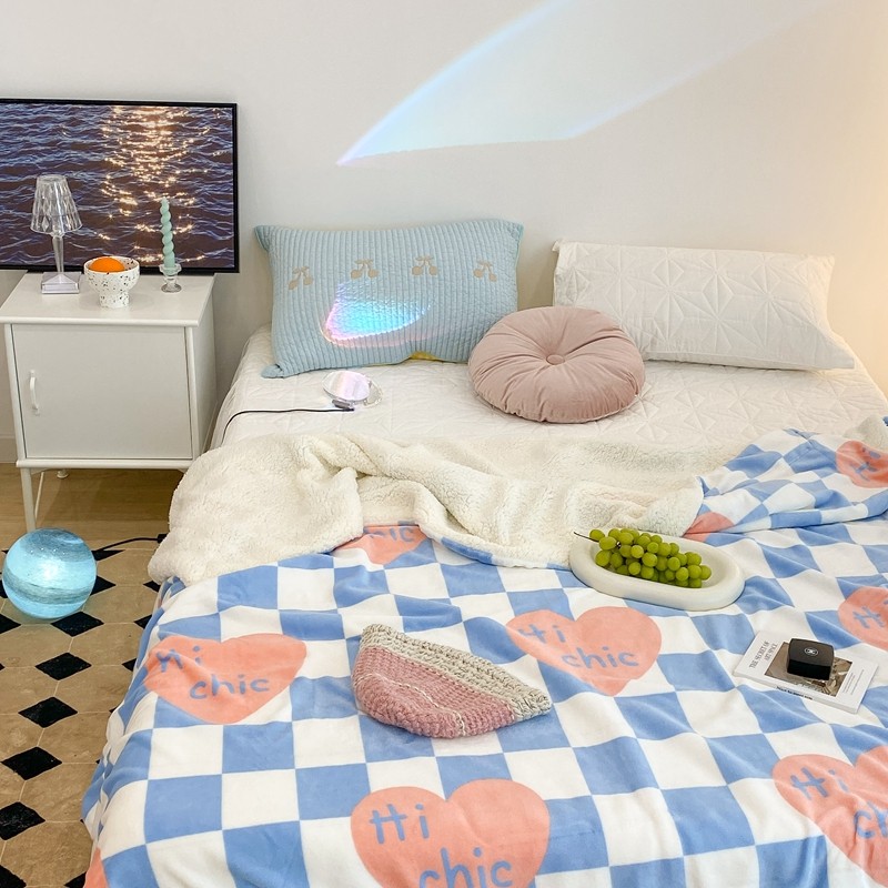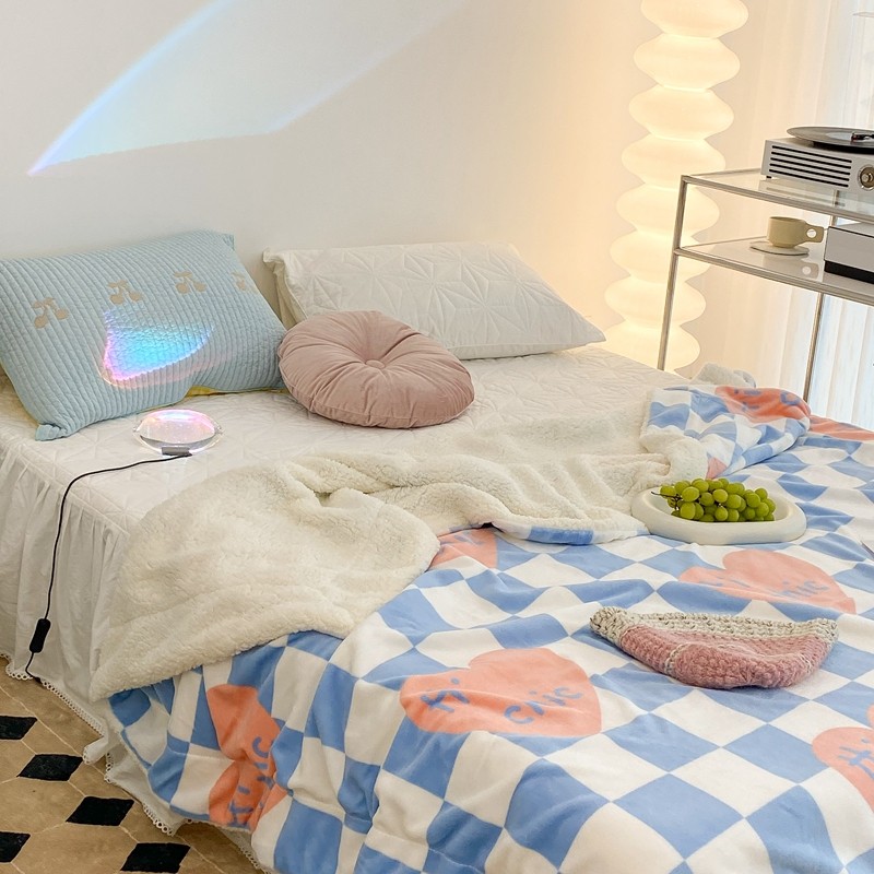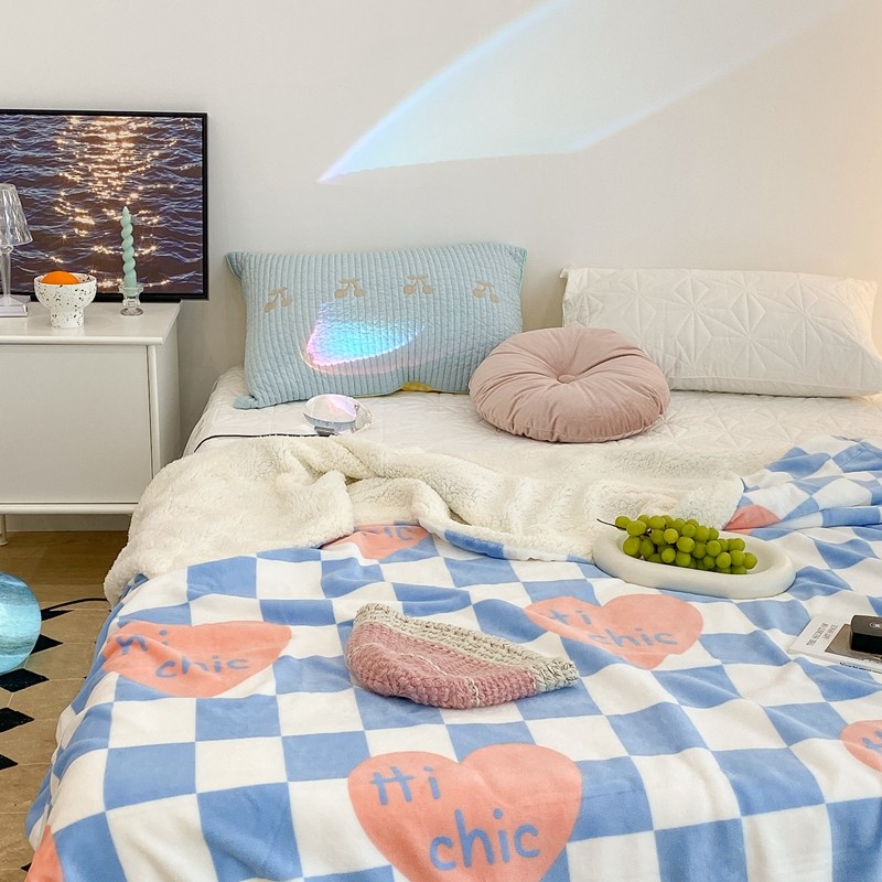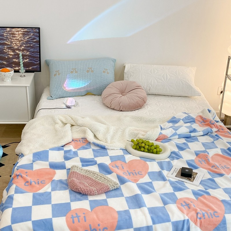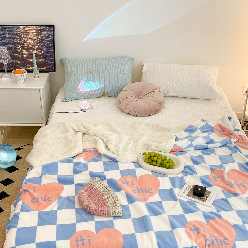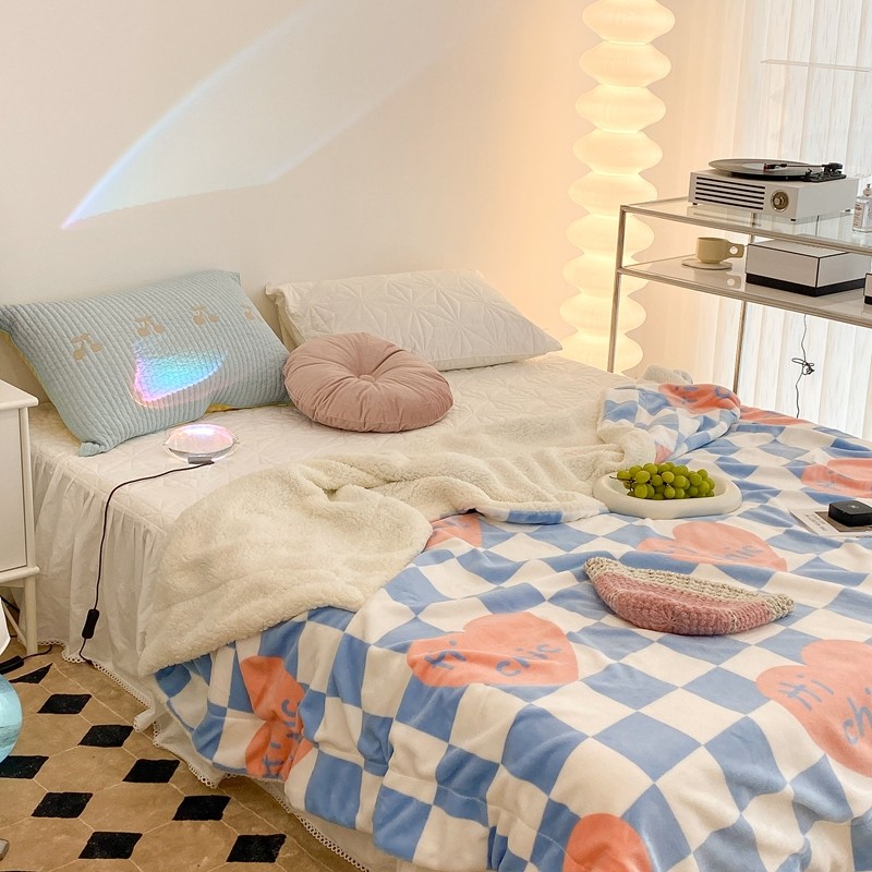 昔可家纺 2021新款牛奶羊羔绒印花毯 蓝棋盘爱心