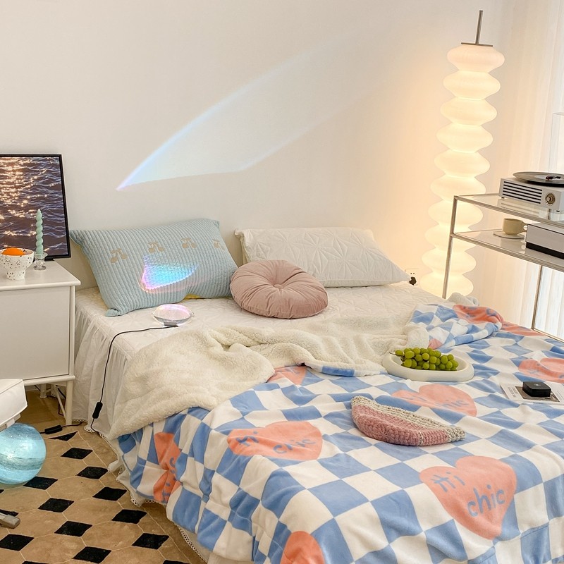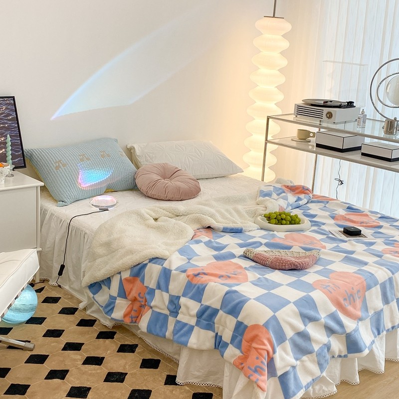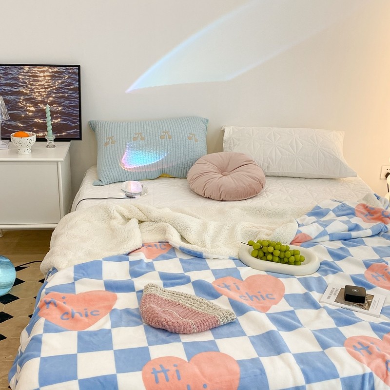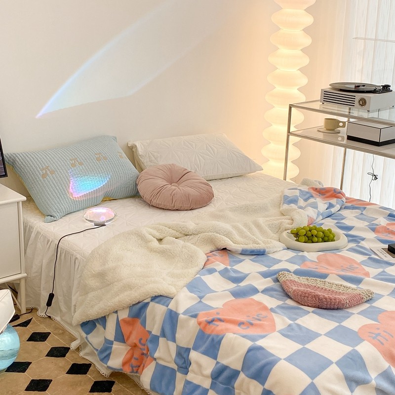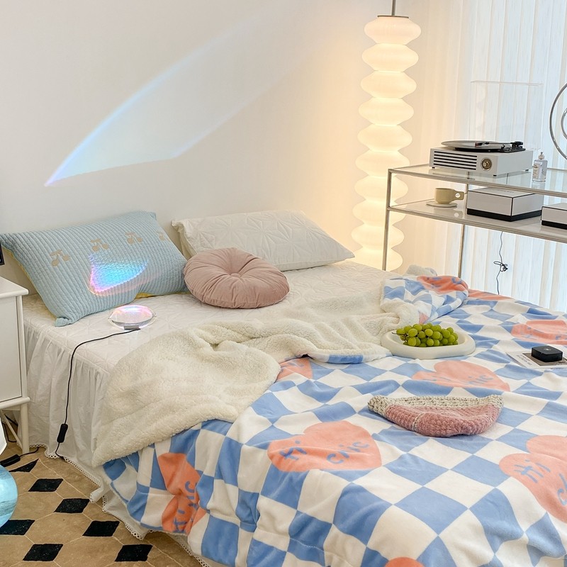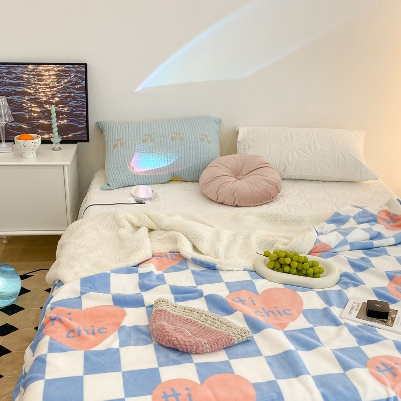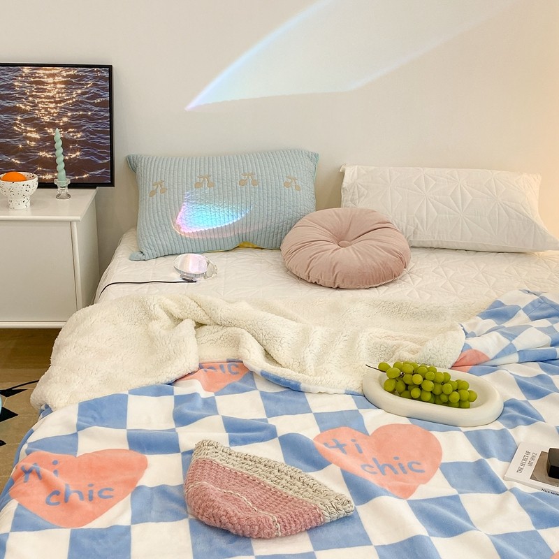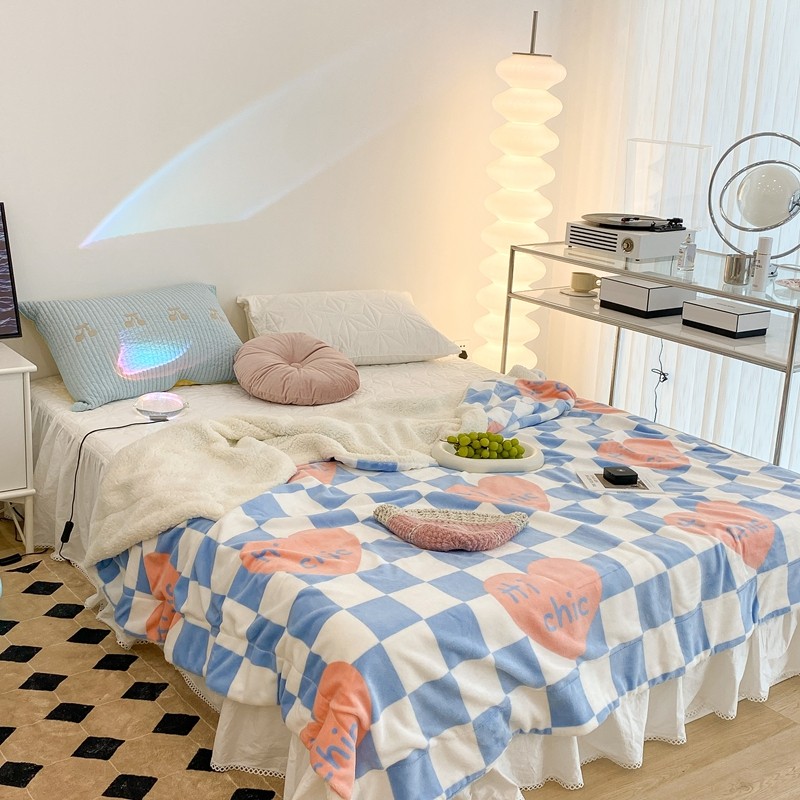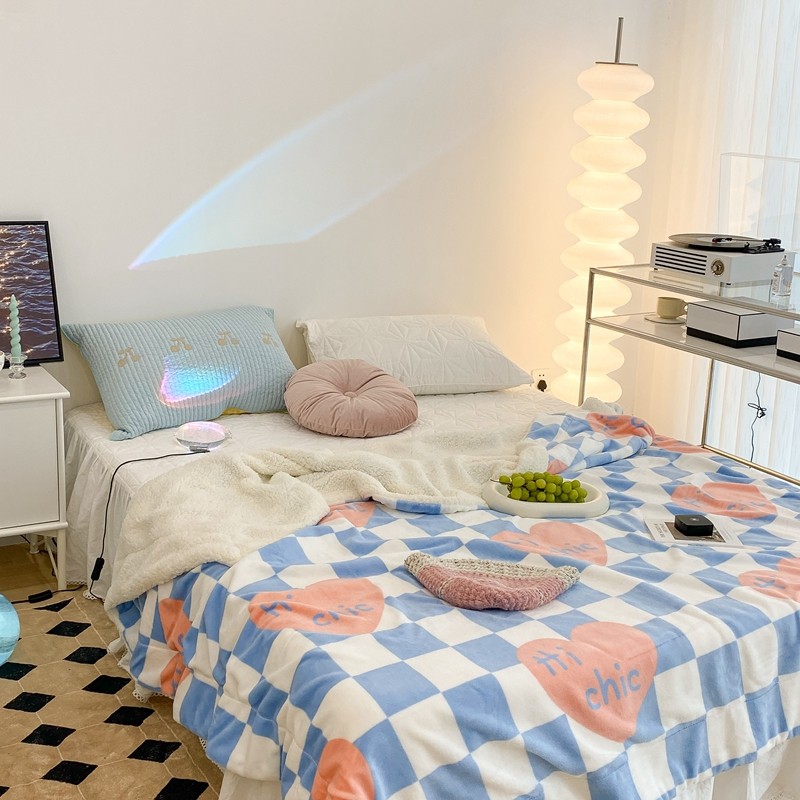 昔可家纺 2021新款牛奶羊羔绒印花毯 蓝棋盘爱心