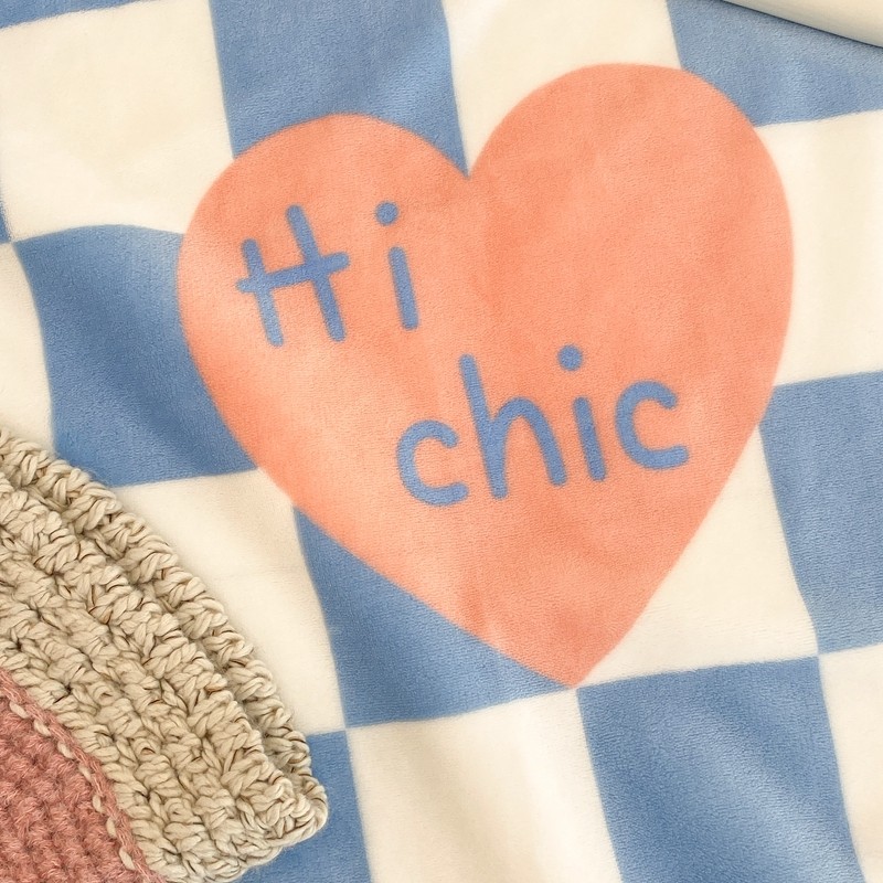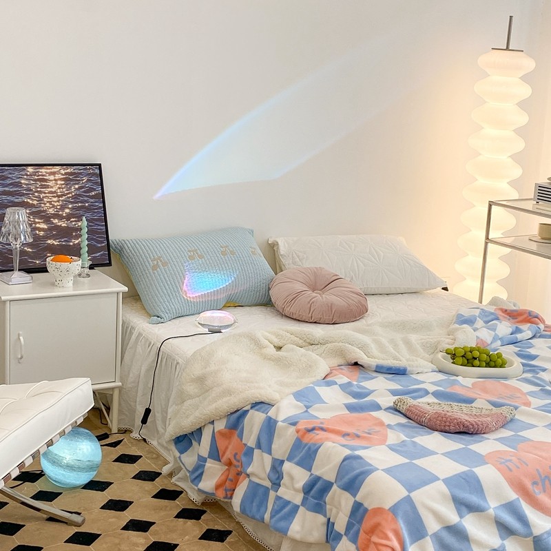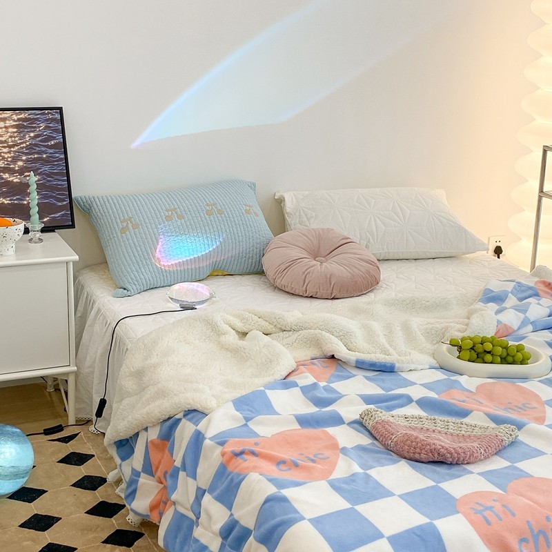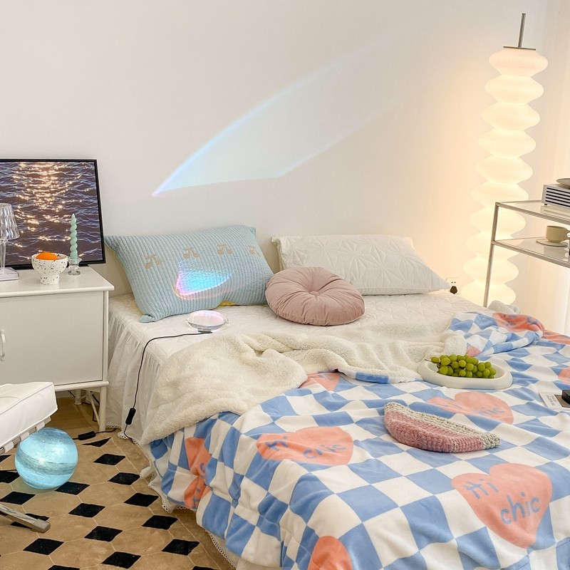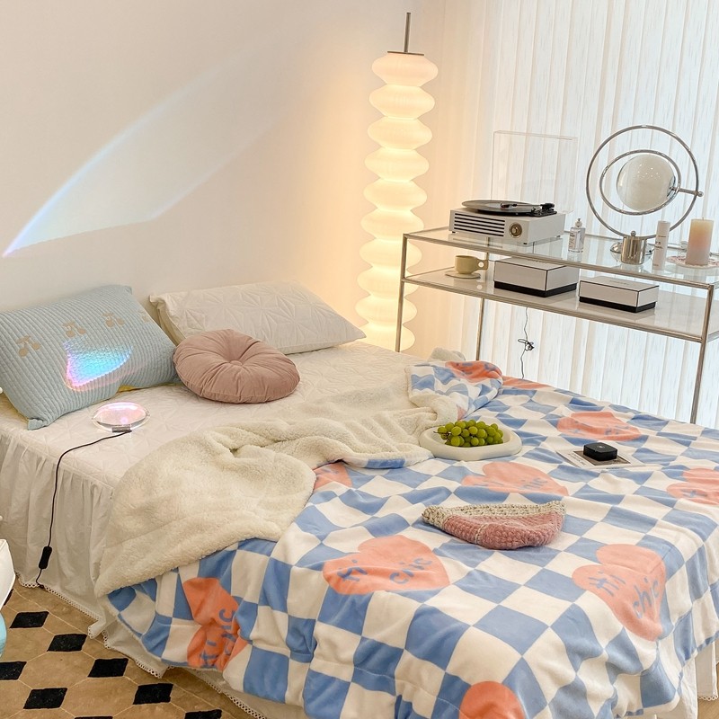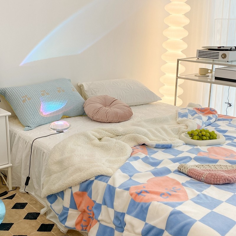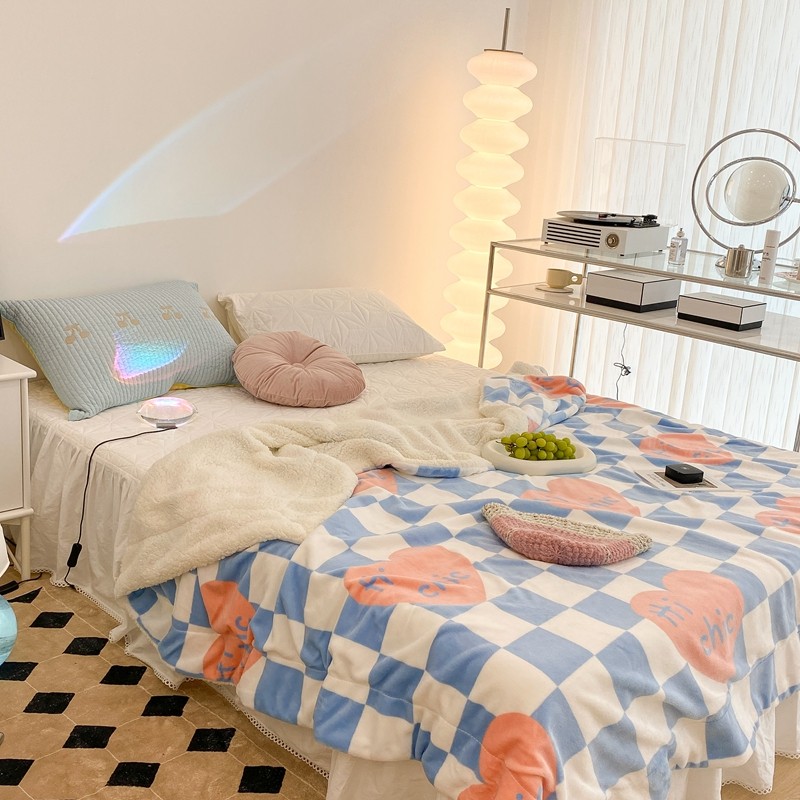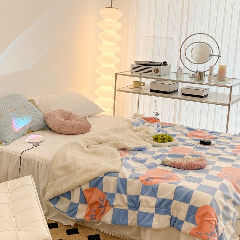 昔可家纺 2021新款牛奶羊羔绒印花毯 蓝棋盘爱心