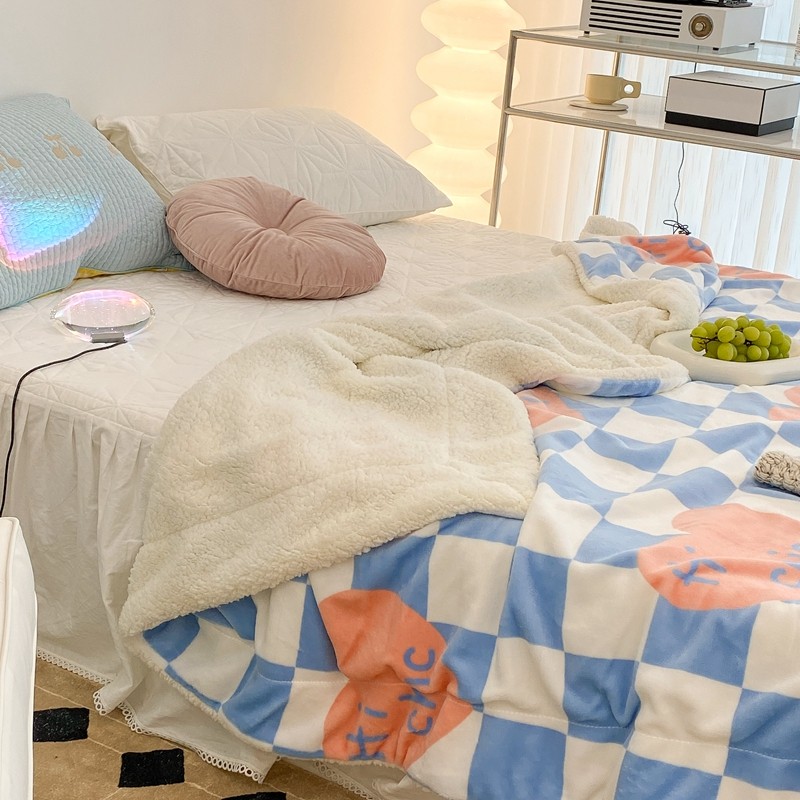 商品名称:昔可家纺 2021新款牛奶羊羔绒印花毯 蓝棋盘爱心