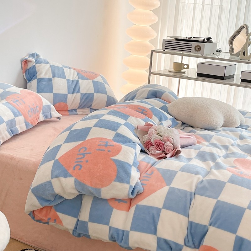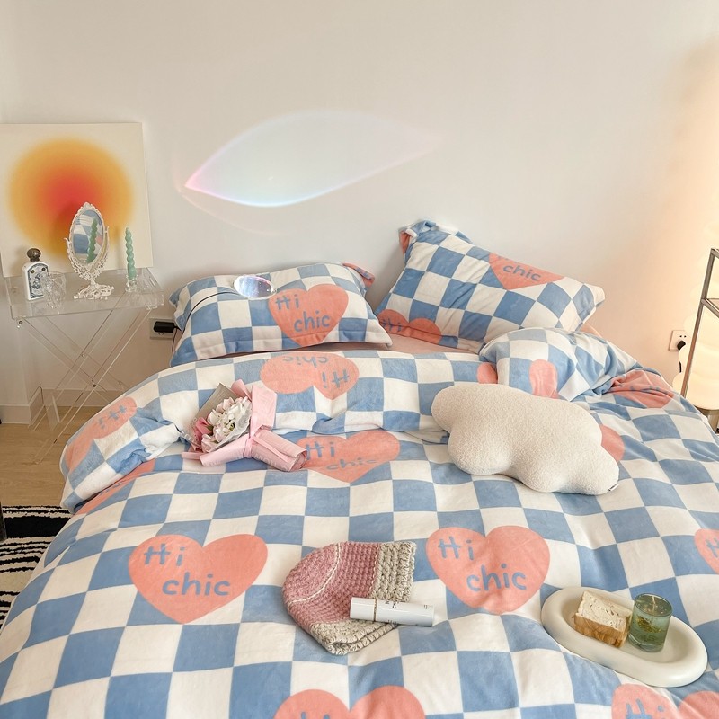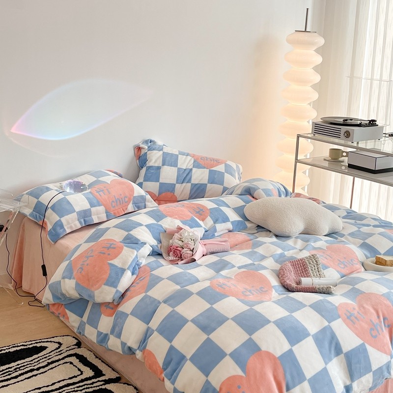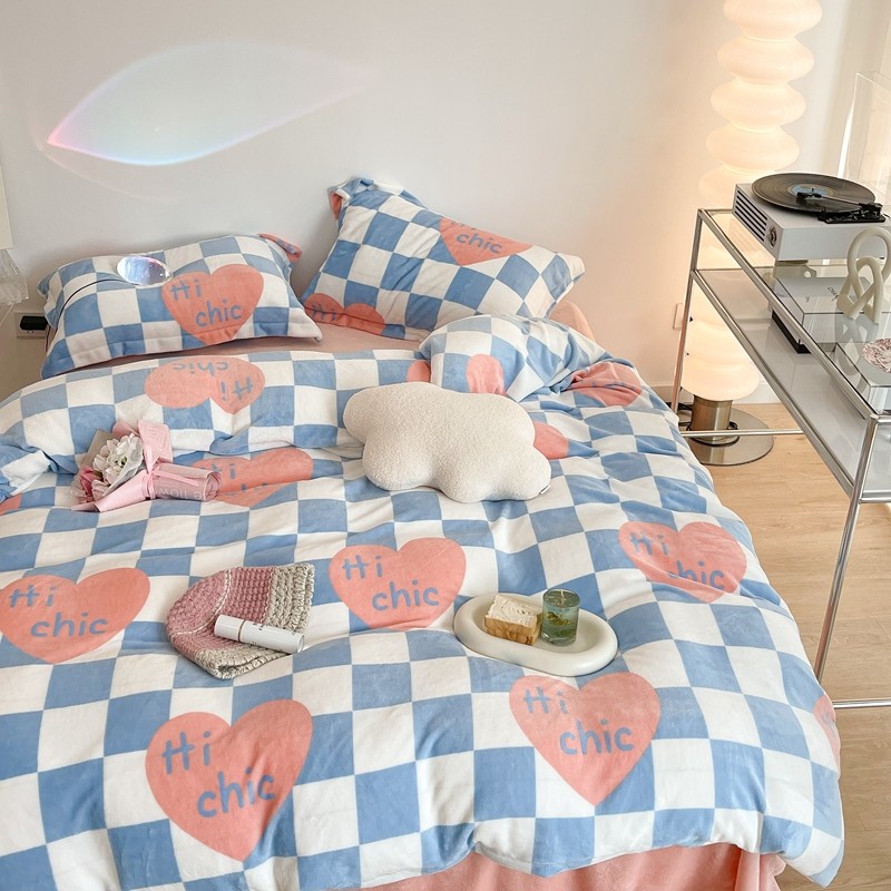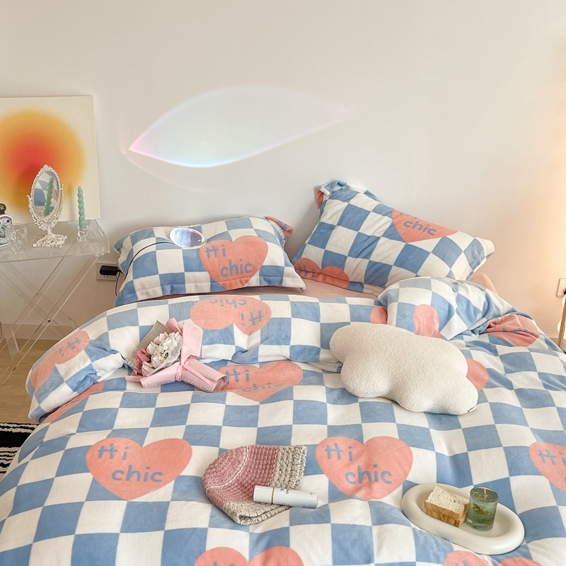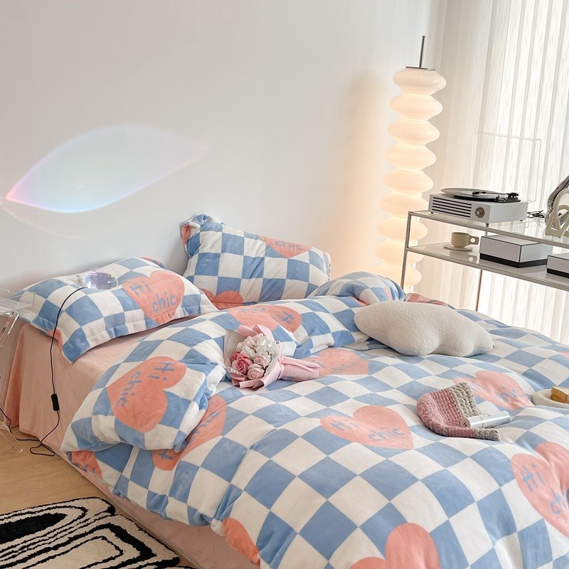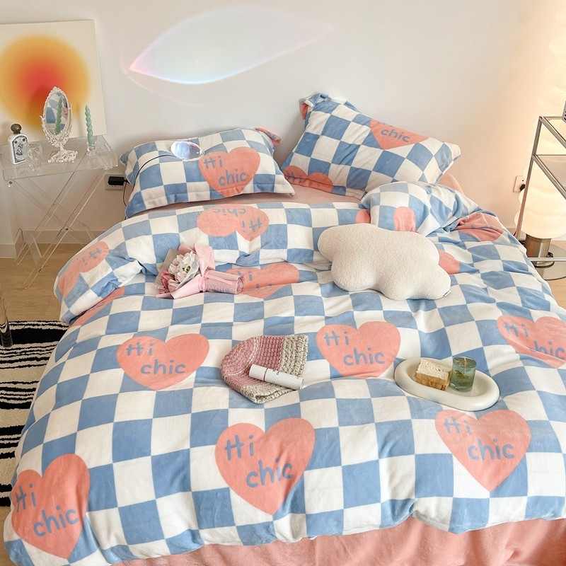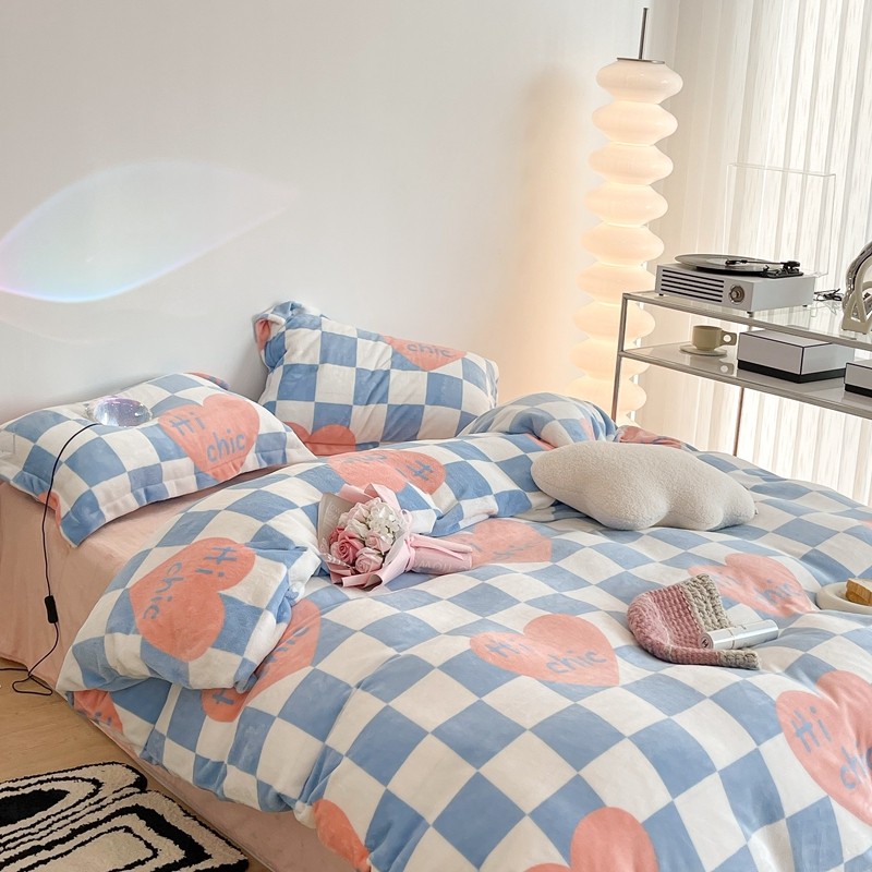 昔可家纺 2021新款牛奶绒四件套-老花色 蓝棋盘爱心