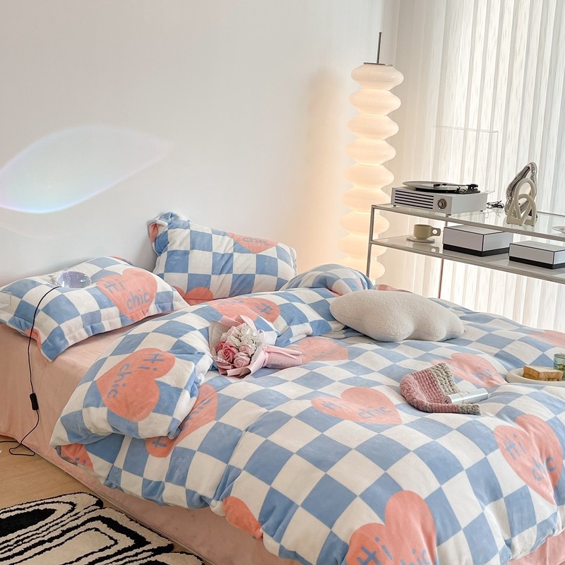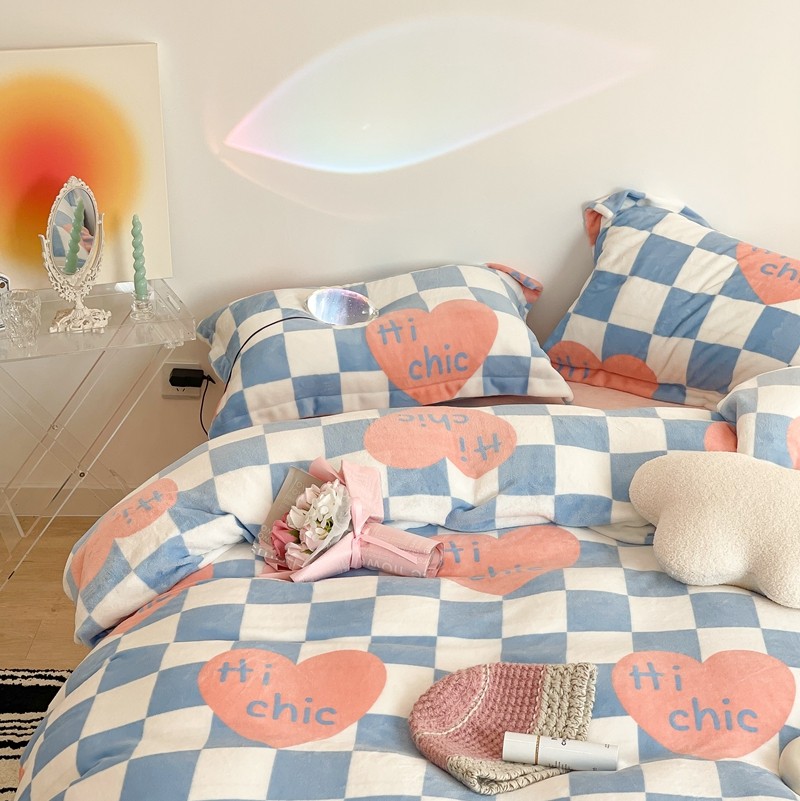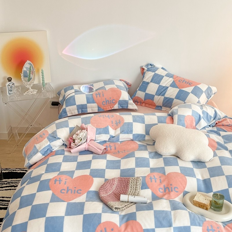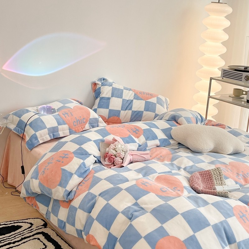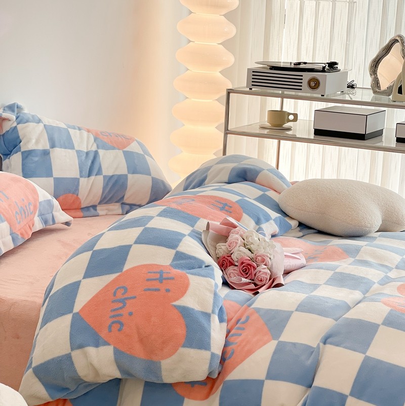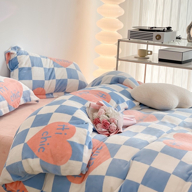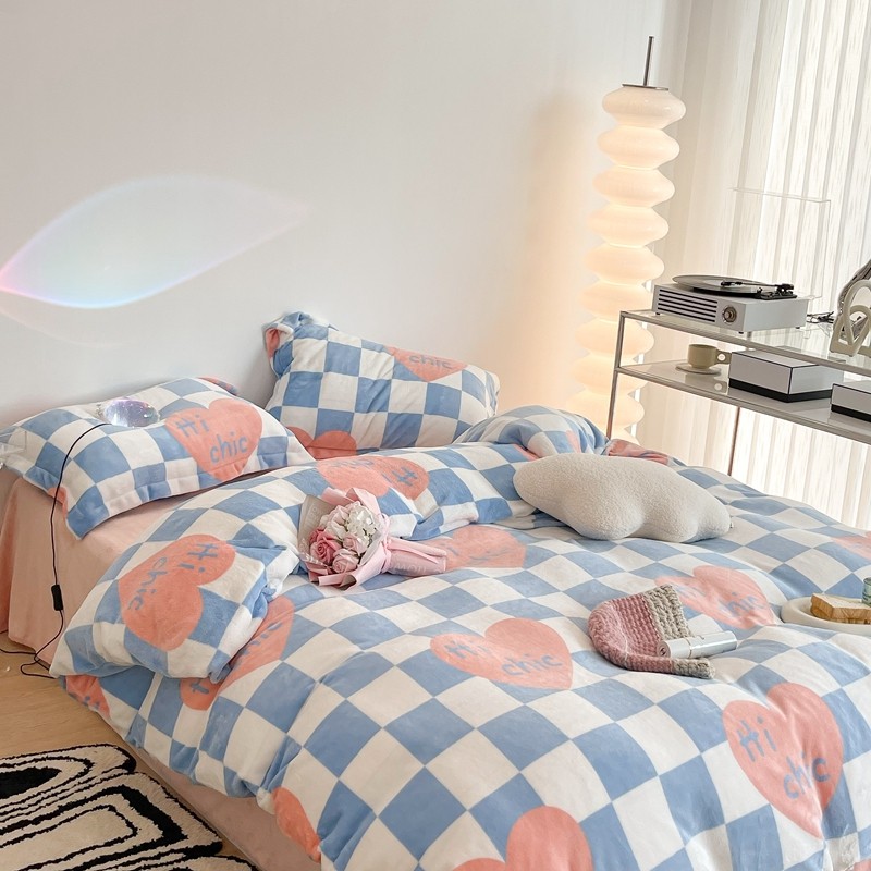 昔可家纺 2021新款牛奶绒四件套-老花色 蓝棋盘爱心