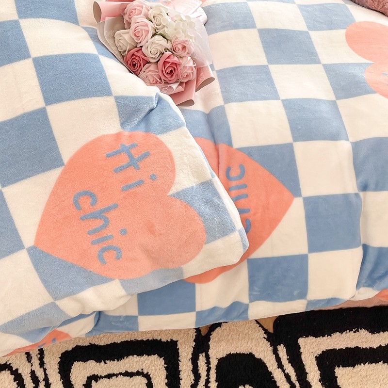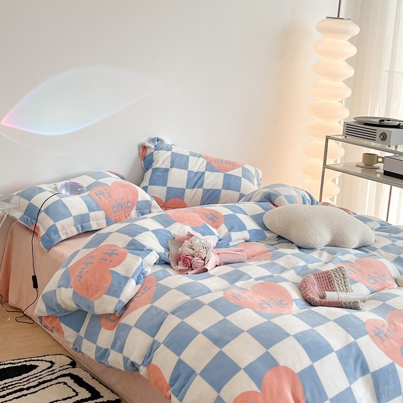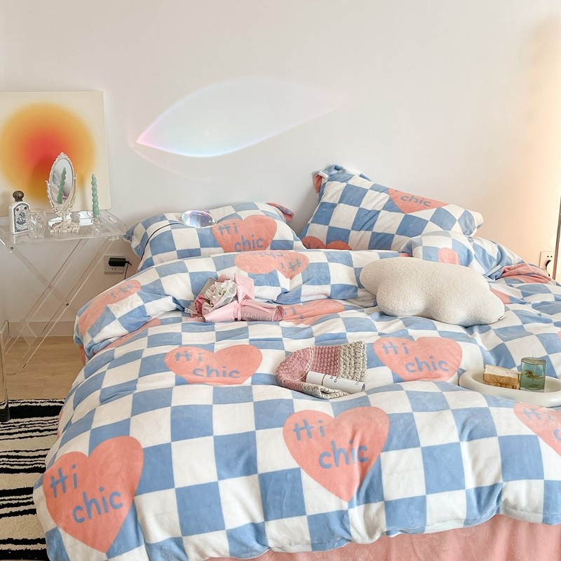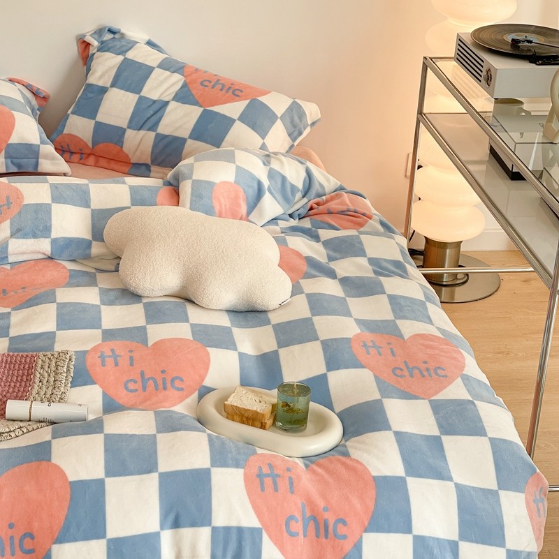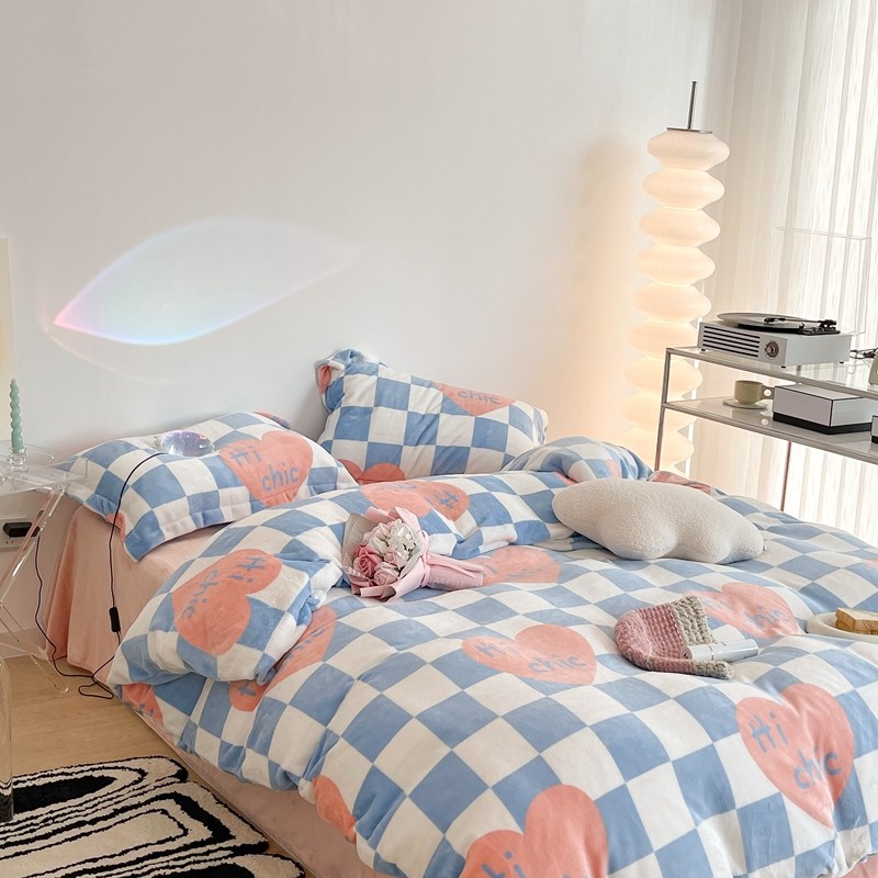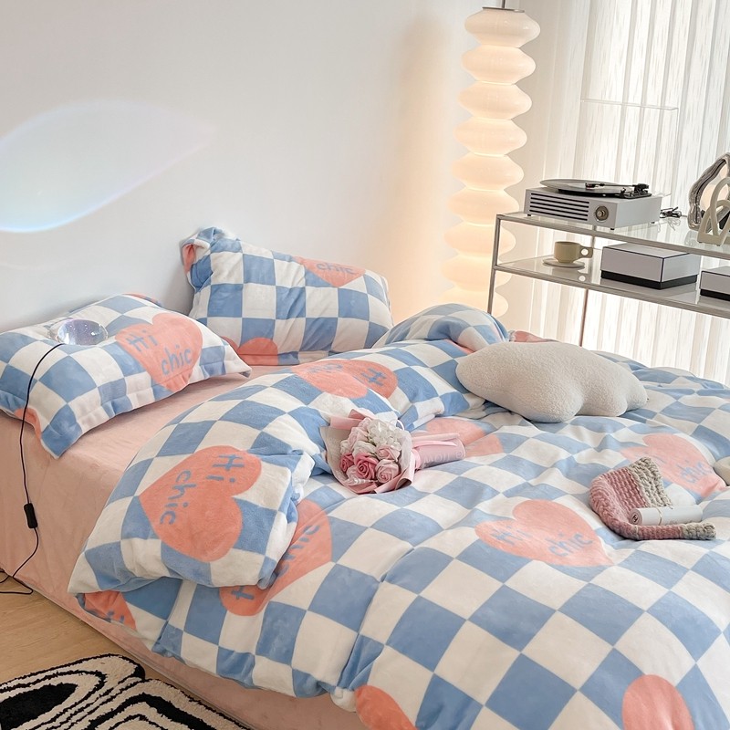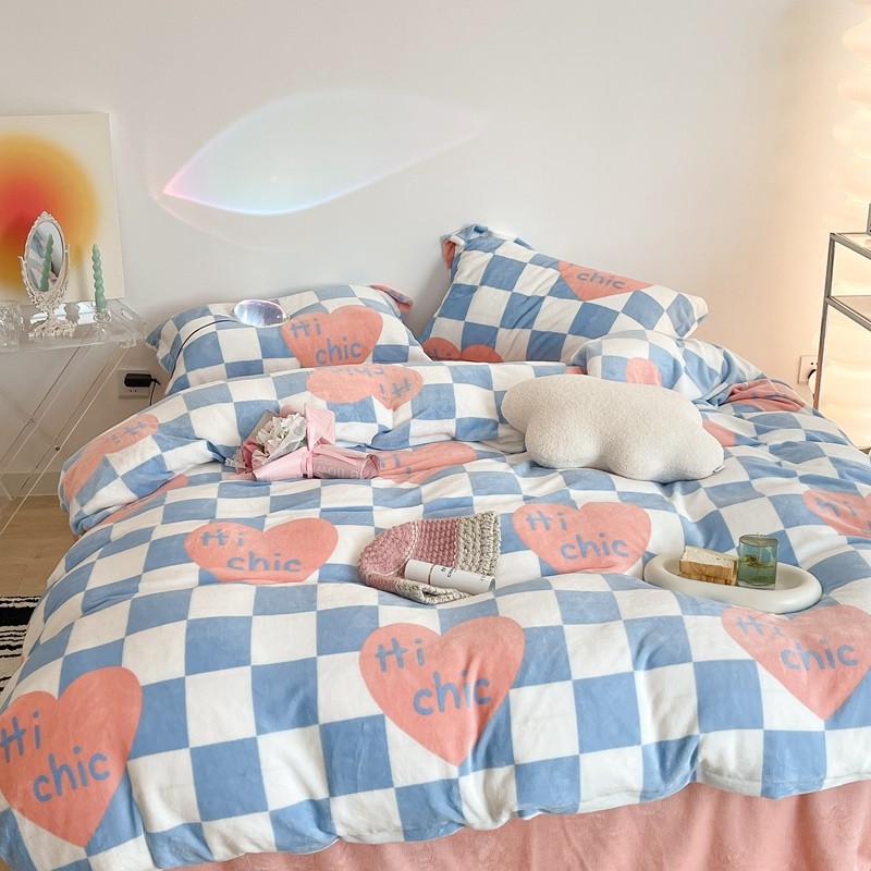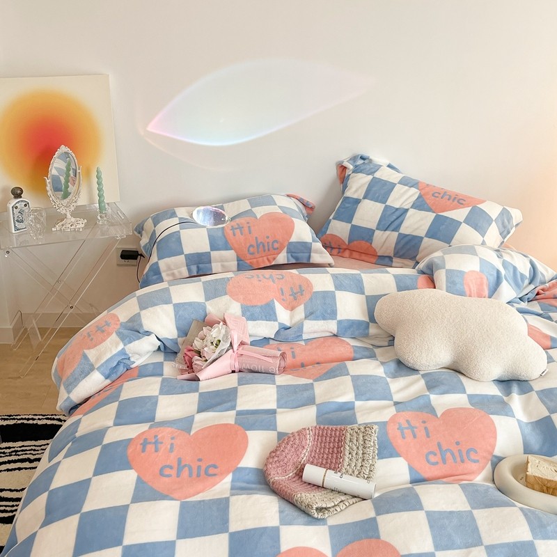 昔可家纺 2021新款牛奶绒四件套-老花色 蓝棋盘爱心