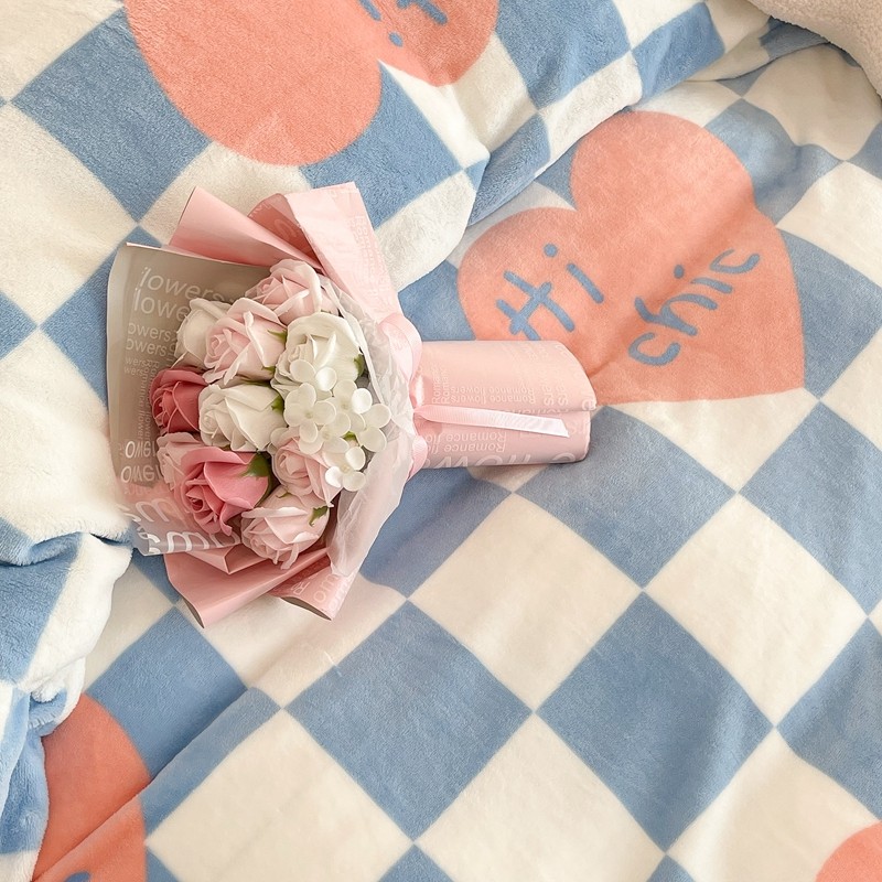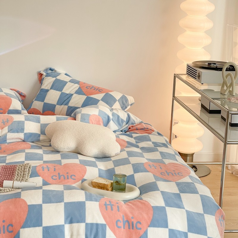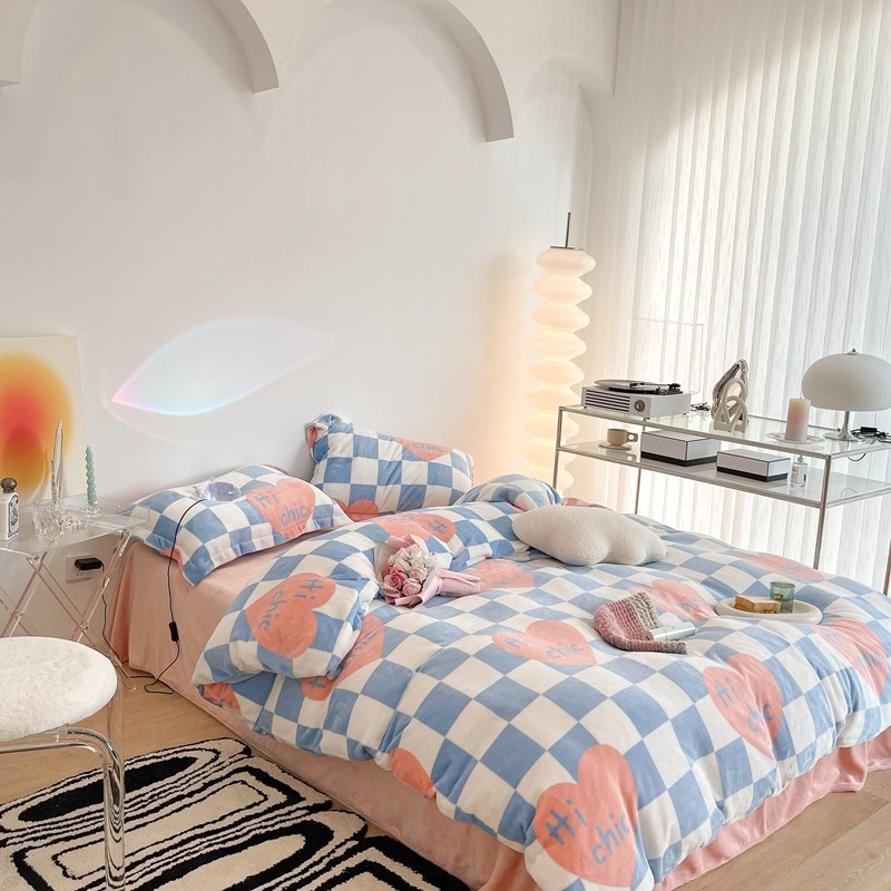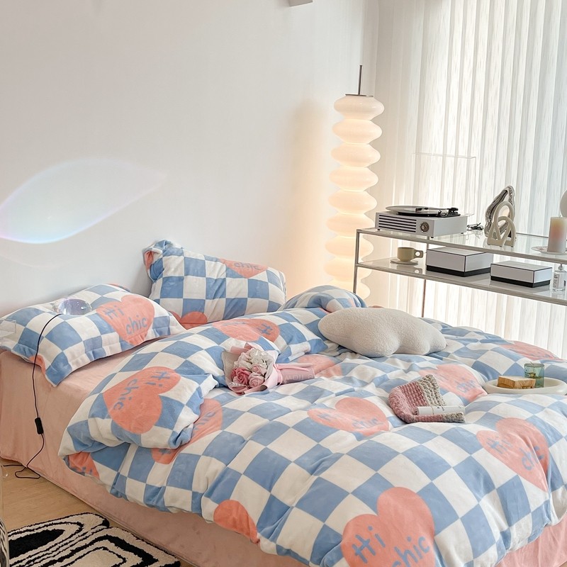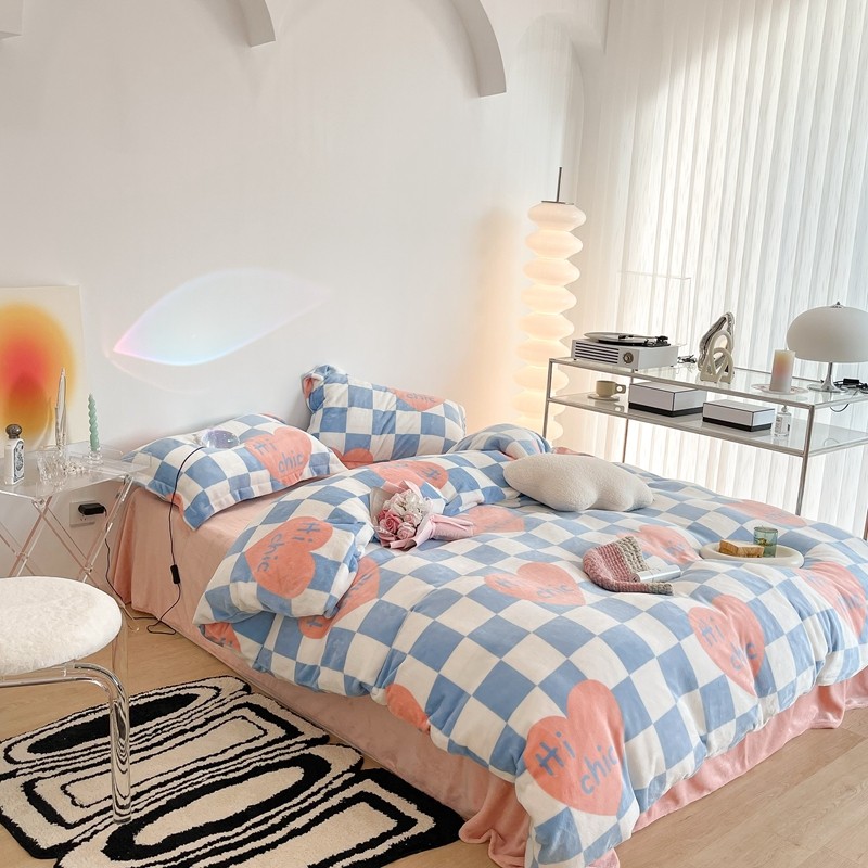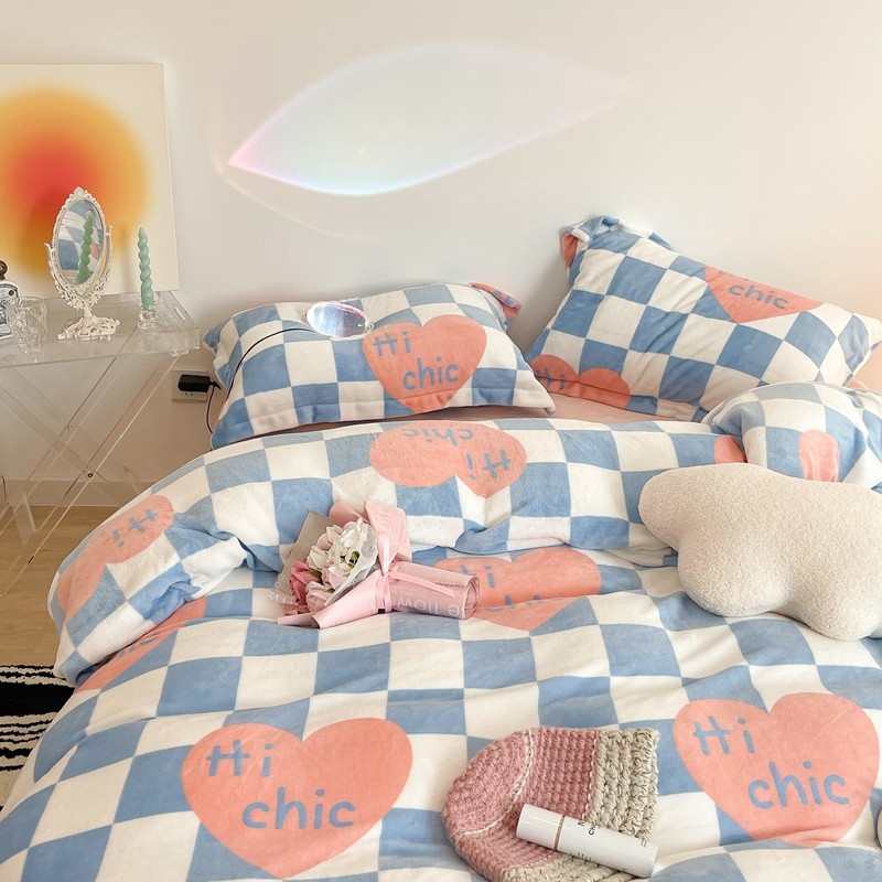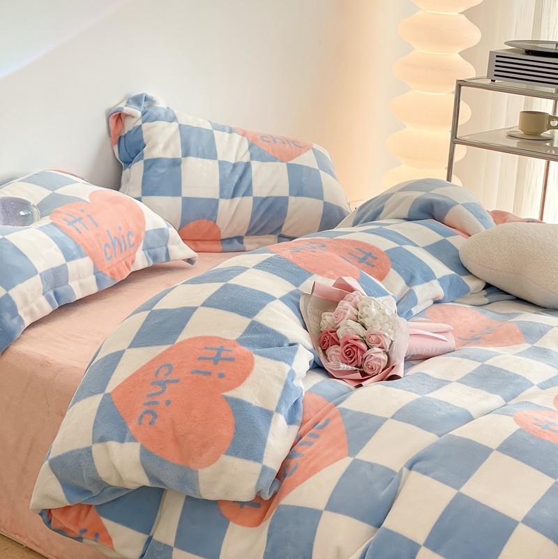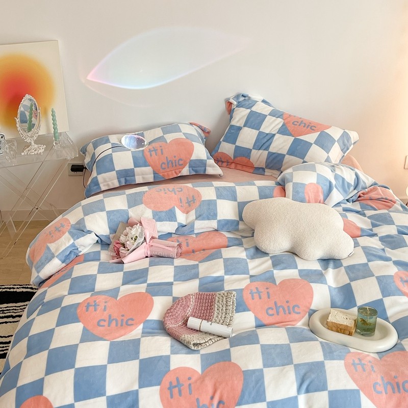 昔可家纺 2021新款牛奶绒四件套-老花色 蓝棋盘爱心