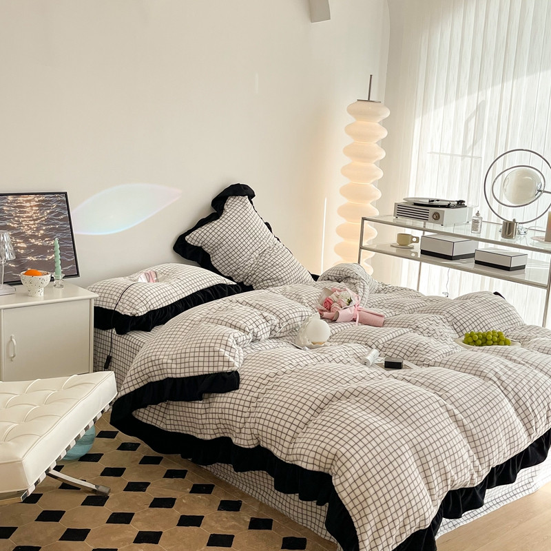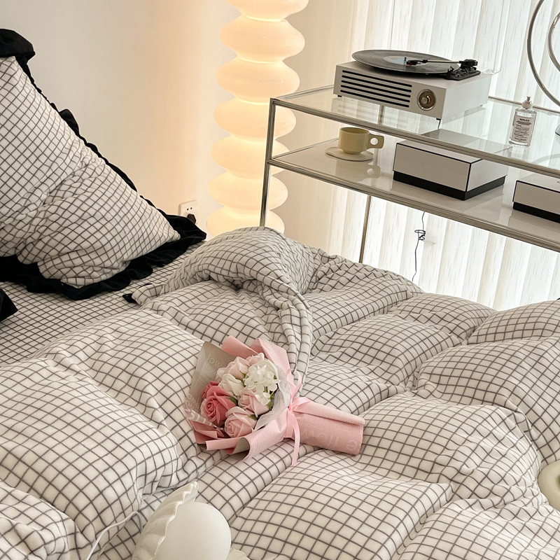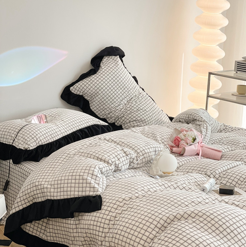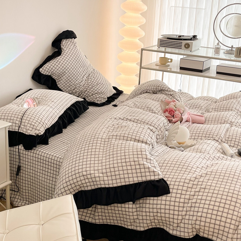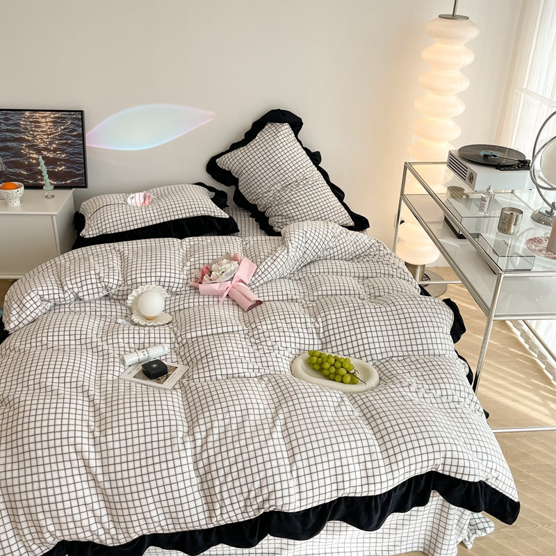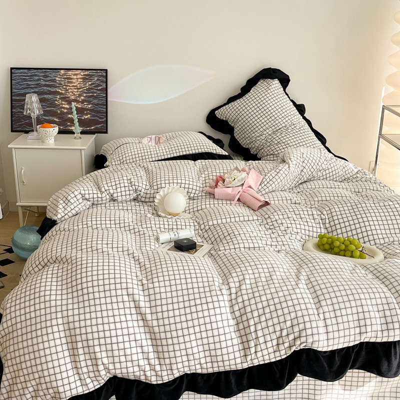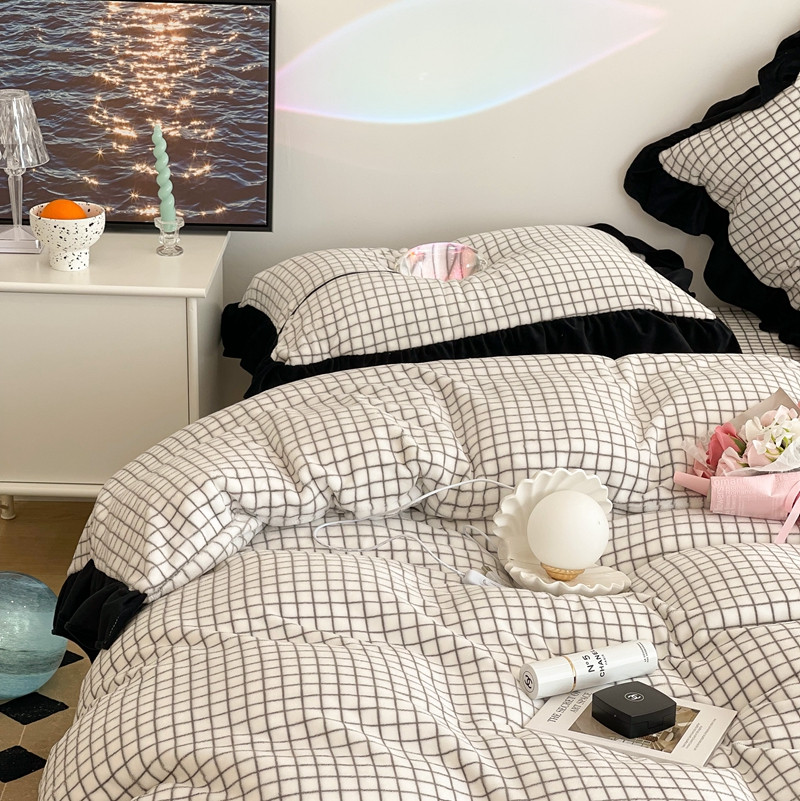昔可 2021新款黑色花边牛奶绒四件套 小小白格