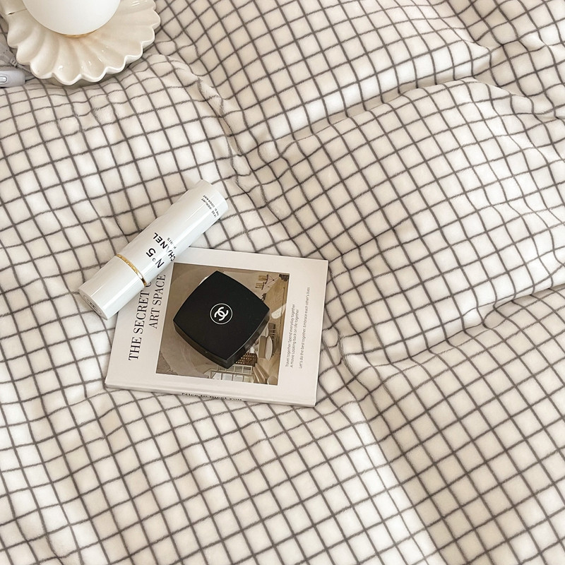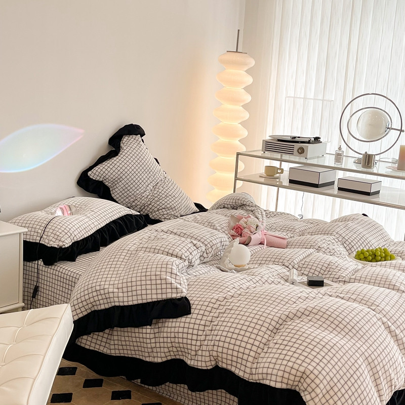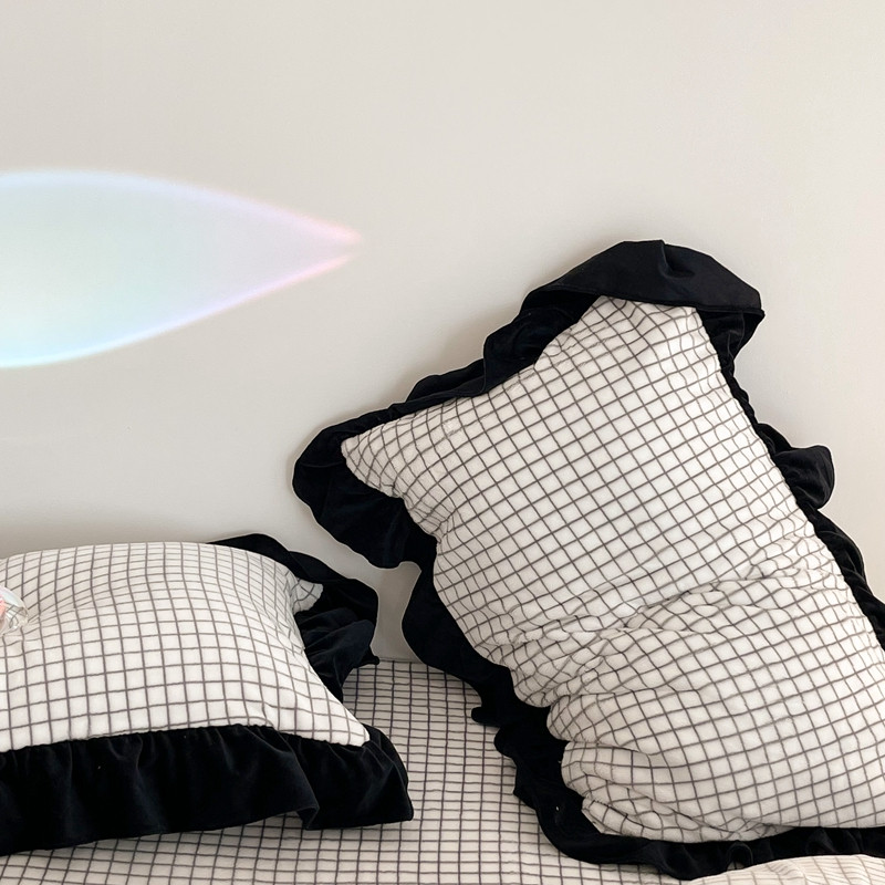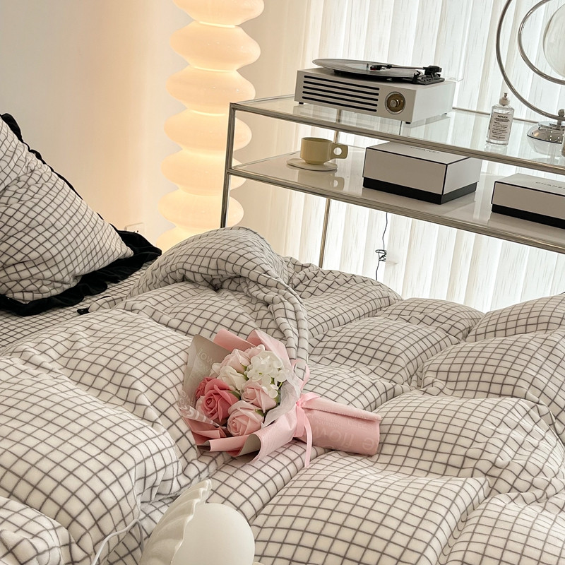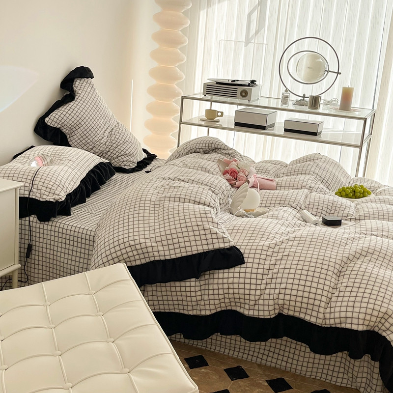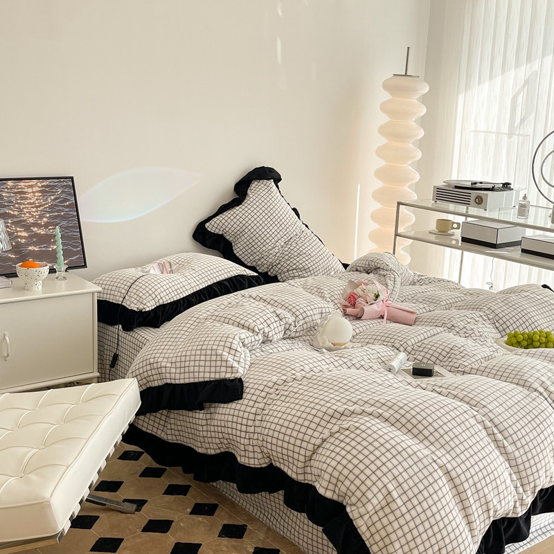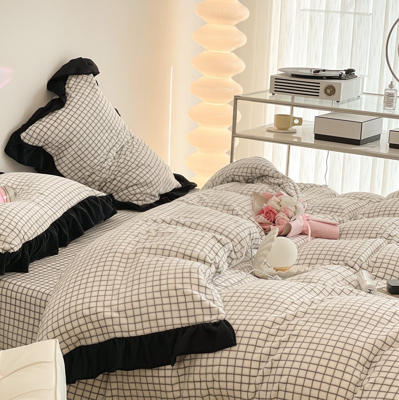昔可 2021新款黑色花边牛奶绒四件套 小小白格