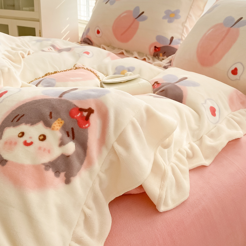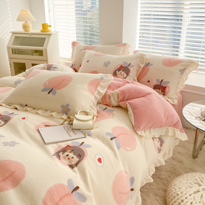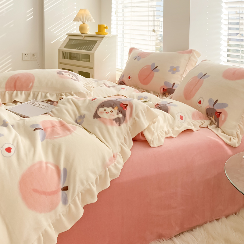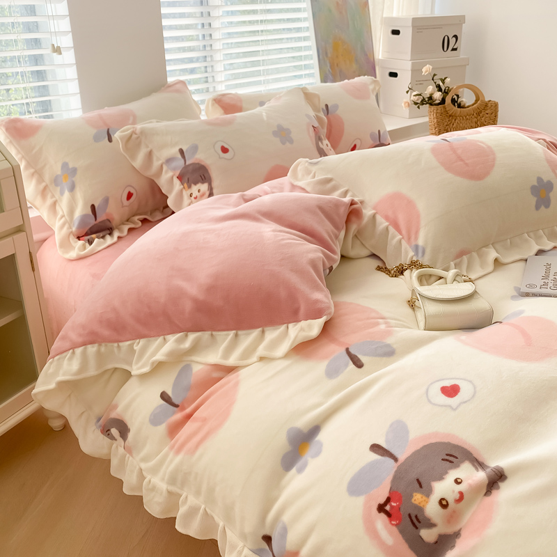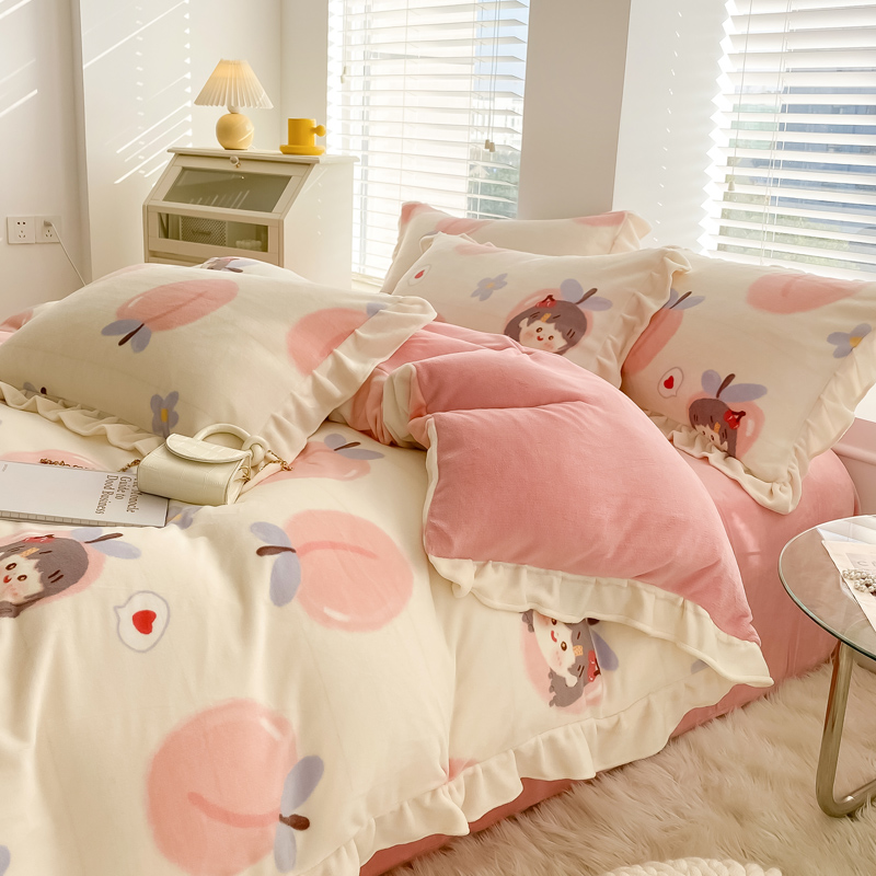 米莱家纺 2021新款韩版牛奶绒花边四件套 蜜桃女孩