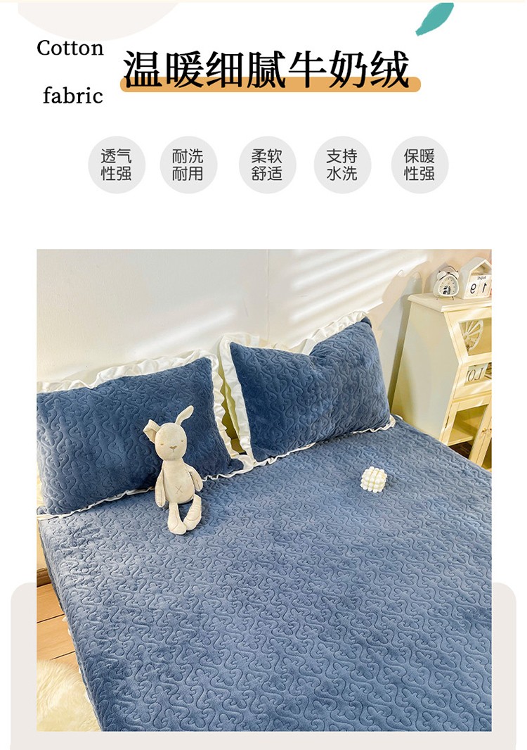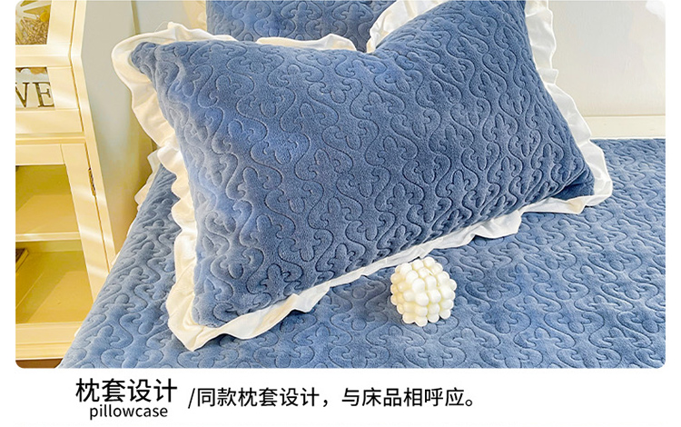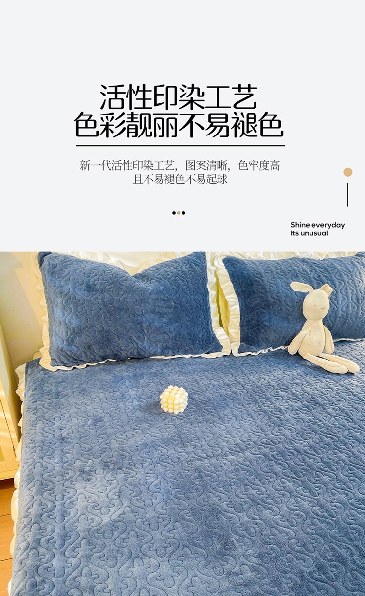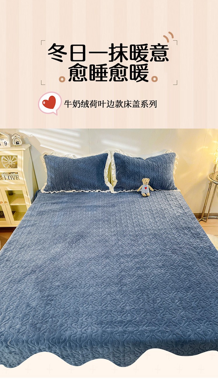 沐辰2021新款加厚牛奶绒荷叶边款床盖 深海蓝