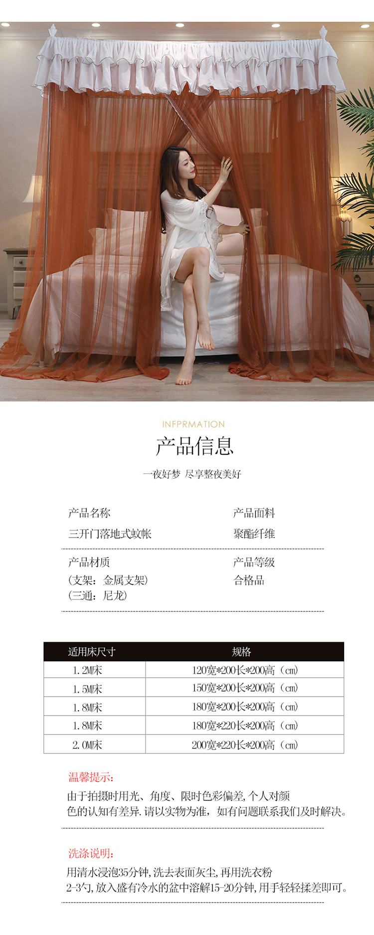 当前位置: 91家纺网 > 商品网购 > 床上用品 > 蚊帐 > 免安装蚊帐 > 迷仙巢 2022新款三开门落地式蚊帐-A10芳华 芳华-咖色