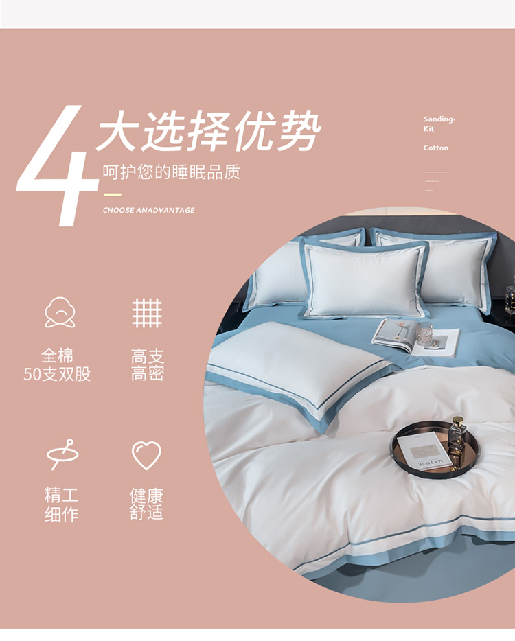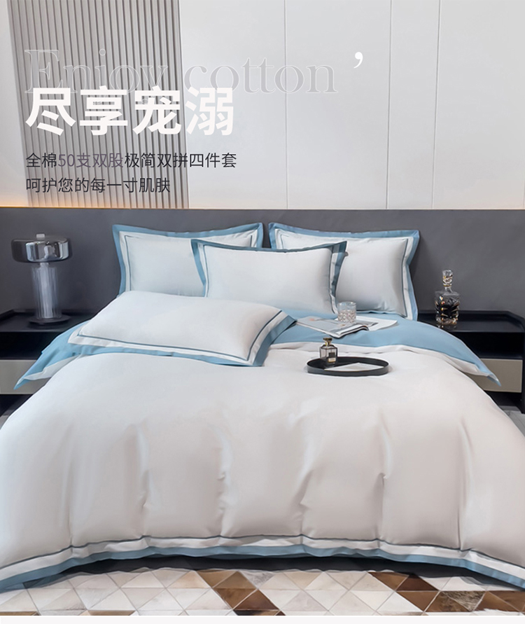 好阁 2023新款100支长绒棉双股全棉极简双拼四件套 白蓝