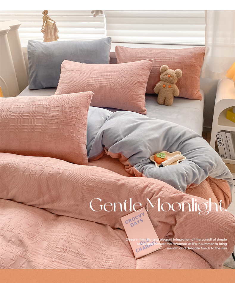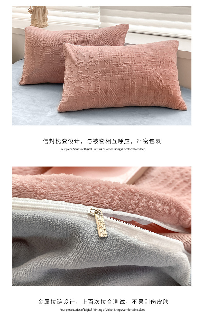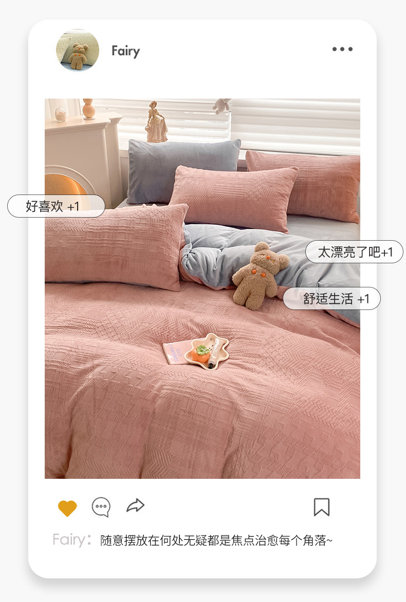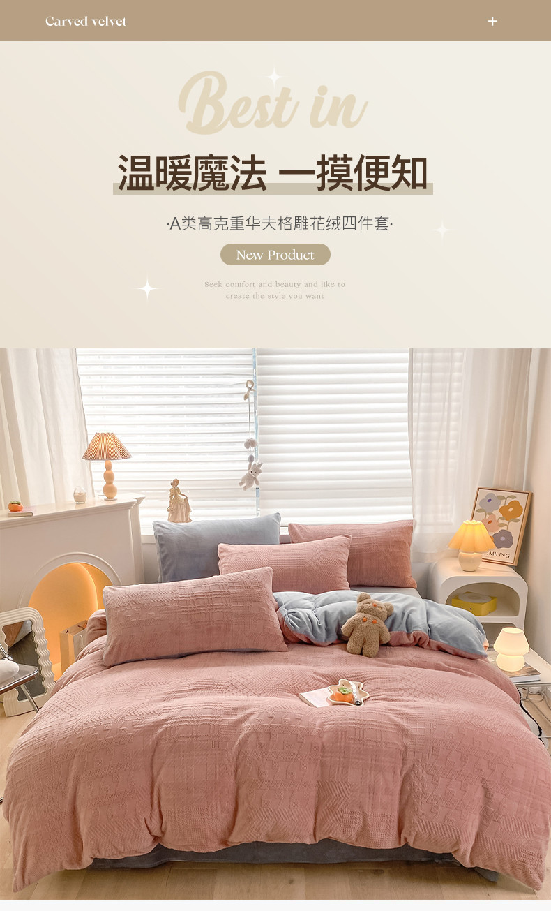 当前位置: 91家纺网 > 商品网购 > 床品套件 > 四件套 > 雕花绒四件套 > 古吉梦 2022新款A类高克重华夫格雕花绒四件套 华夫格-豆沙粉+浅灰