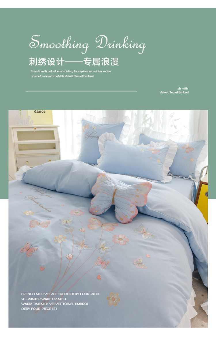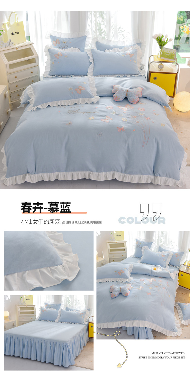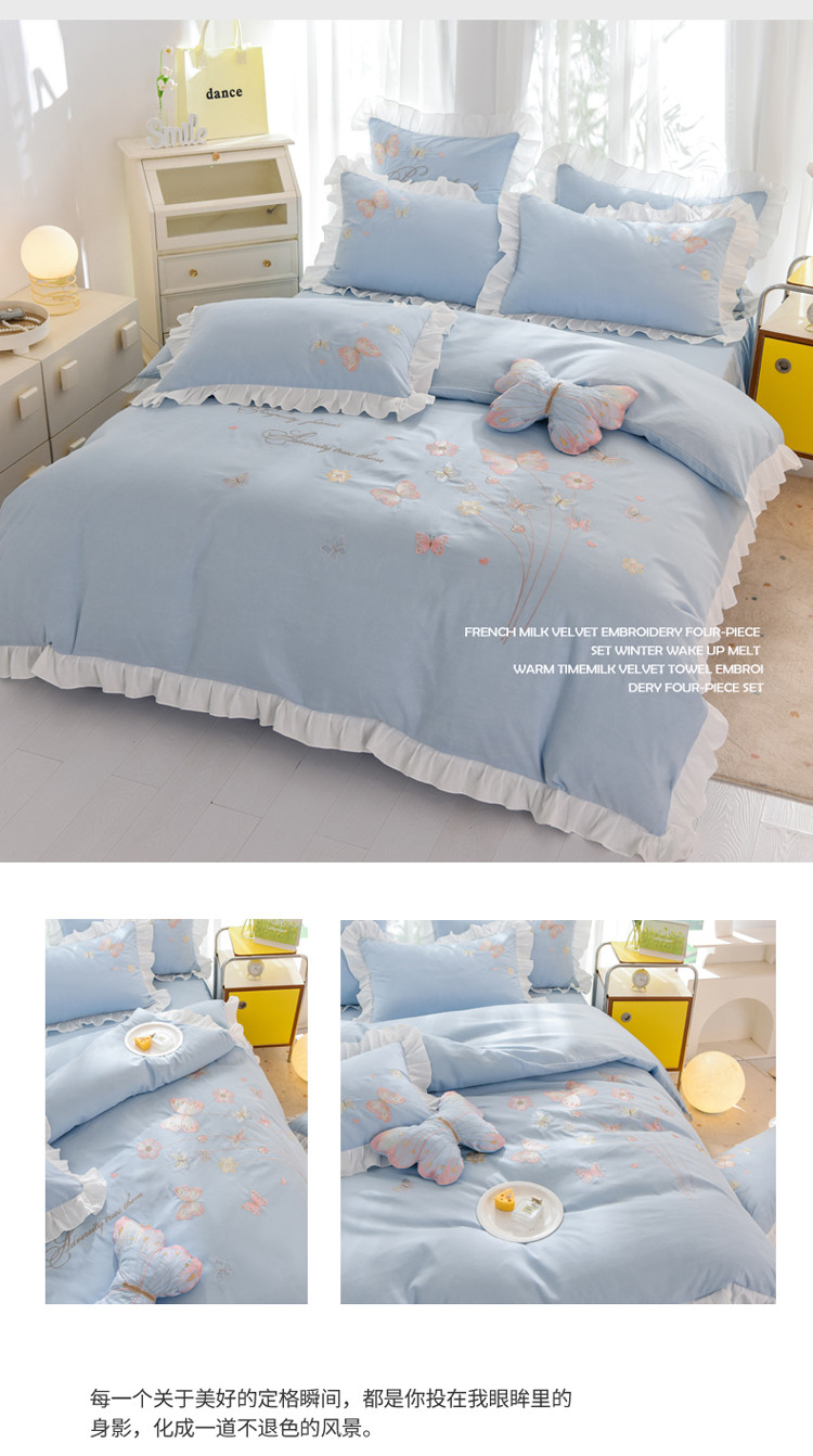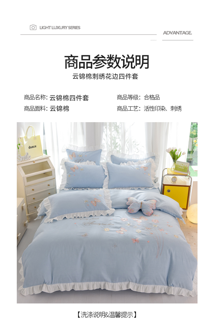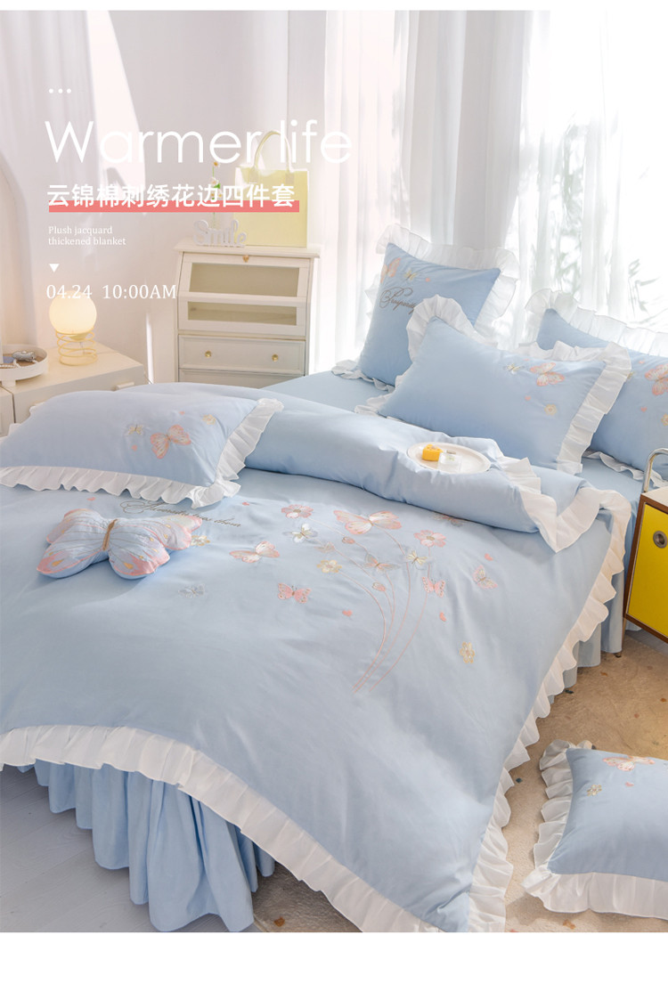 当前位置: 91家纺网 > 商品网购 > 床品套件 > 四件套 > 化纤普通四件套 > 绒世界 2024新款秋冬保暖云锦棉刺绣花边春卉系列四件套 春卉-慕蓝