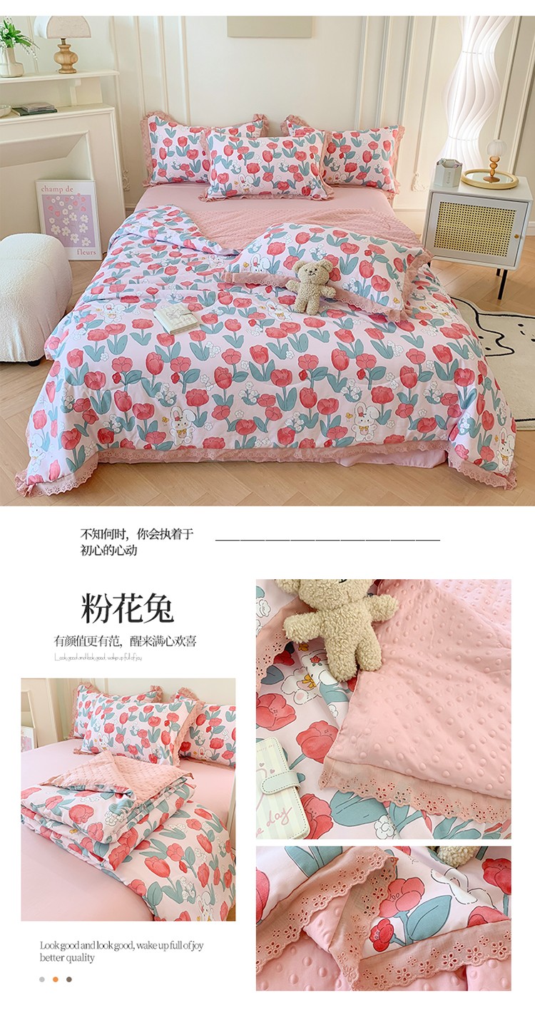 (总)吾欢心 2024新款韩版花边牛奶绒四件套,爱心草莓,爱心小樱桃,彩色郁金香,初恋蔷薇,调皮小兔,花颂,花野迷踪,花园时光,花园小熊,可爱狗狗,可爱小熊,绿爱心,梦境女孩,莫奈花园,奶油草莓,兔子小熊,晚安兔,鲜花萝莉,小雏菊,小柑橘,樱桃小兔,郁金香女孩,郁金香小兔,元气桃桃