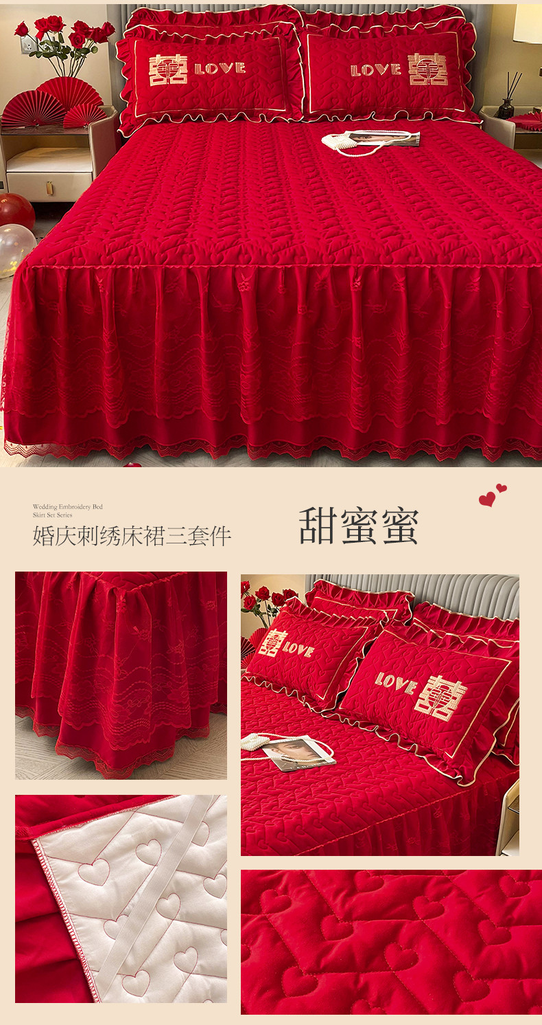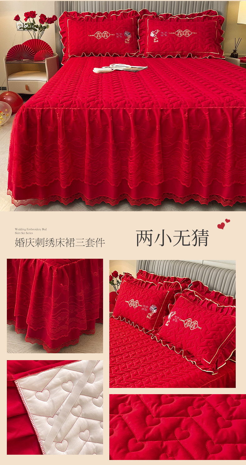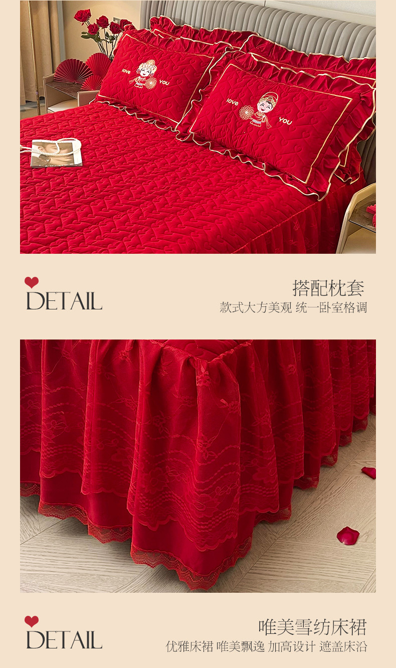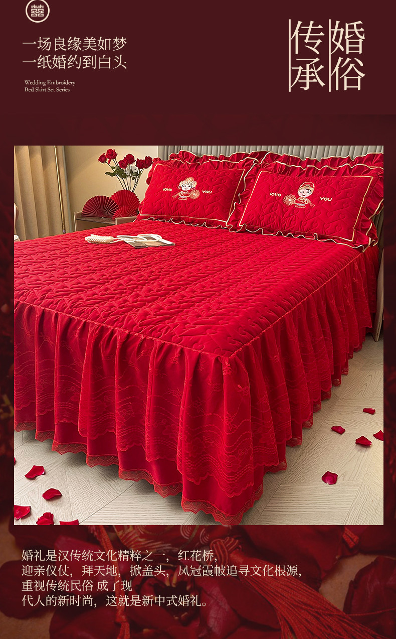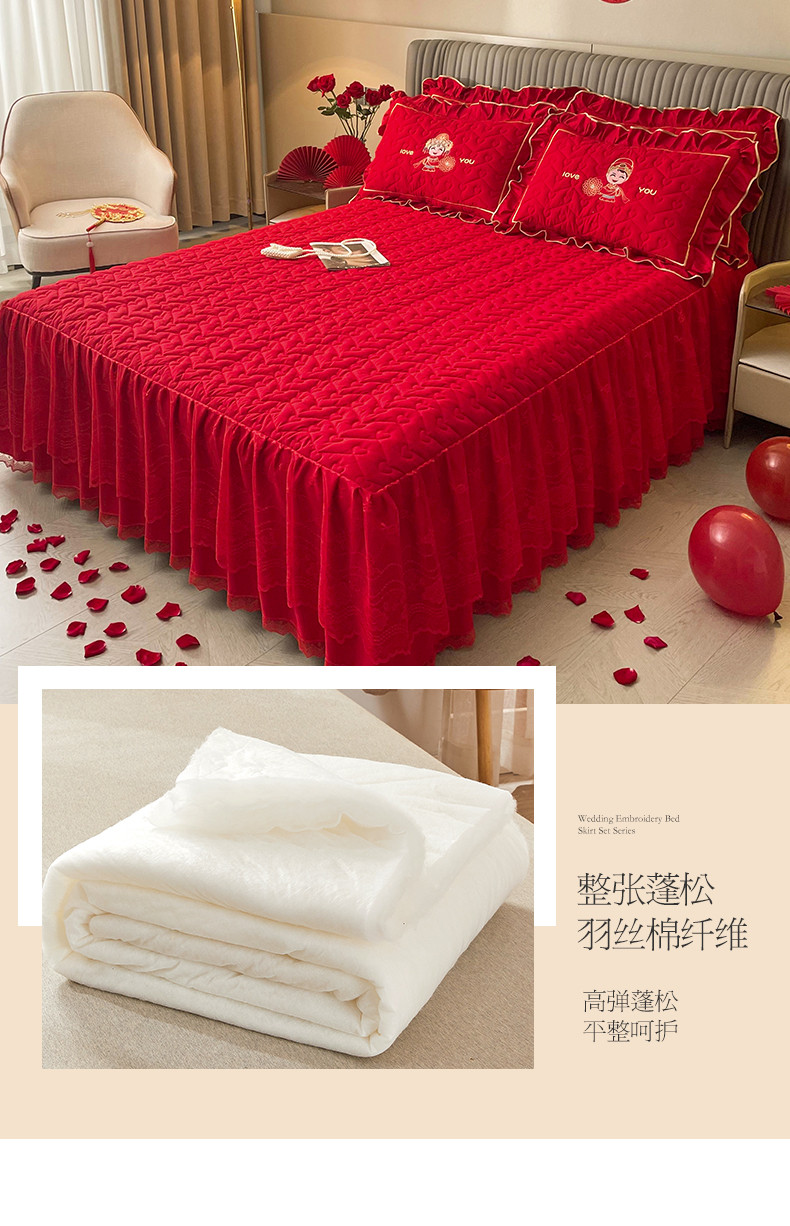 (总)宜凡家纺 2023新款亲肤磨毛婚庆夹棉床裙三件套