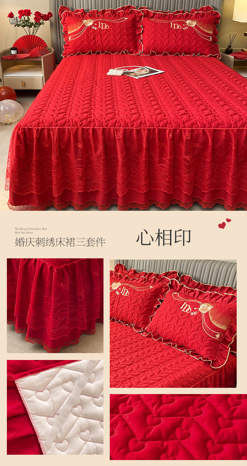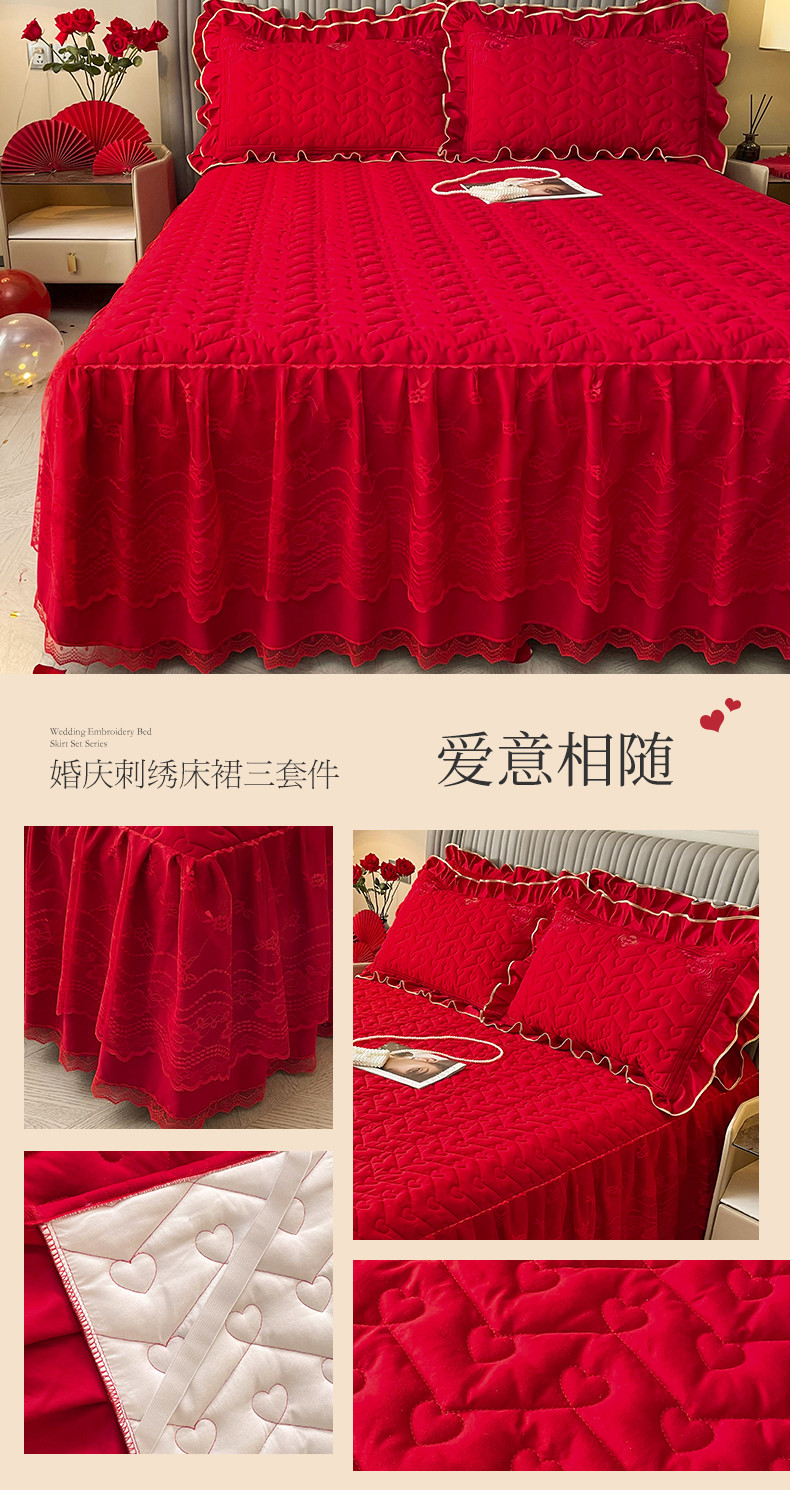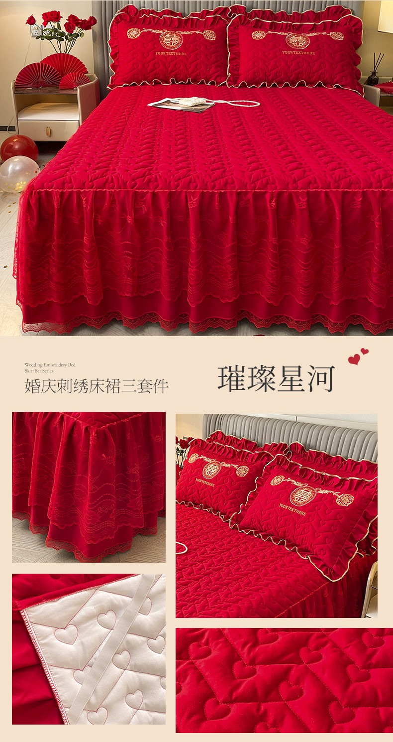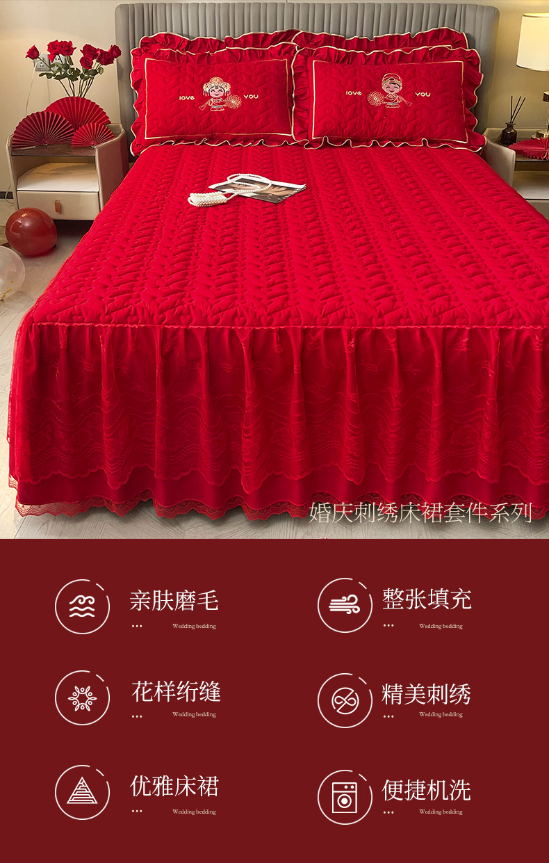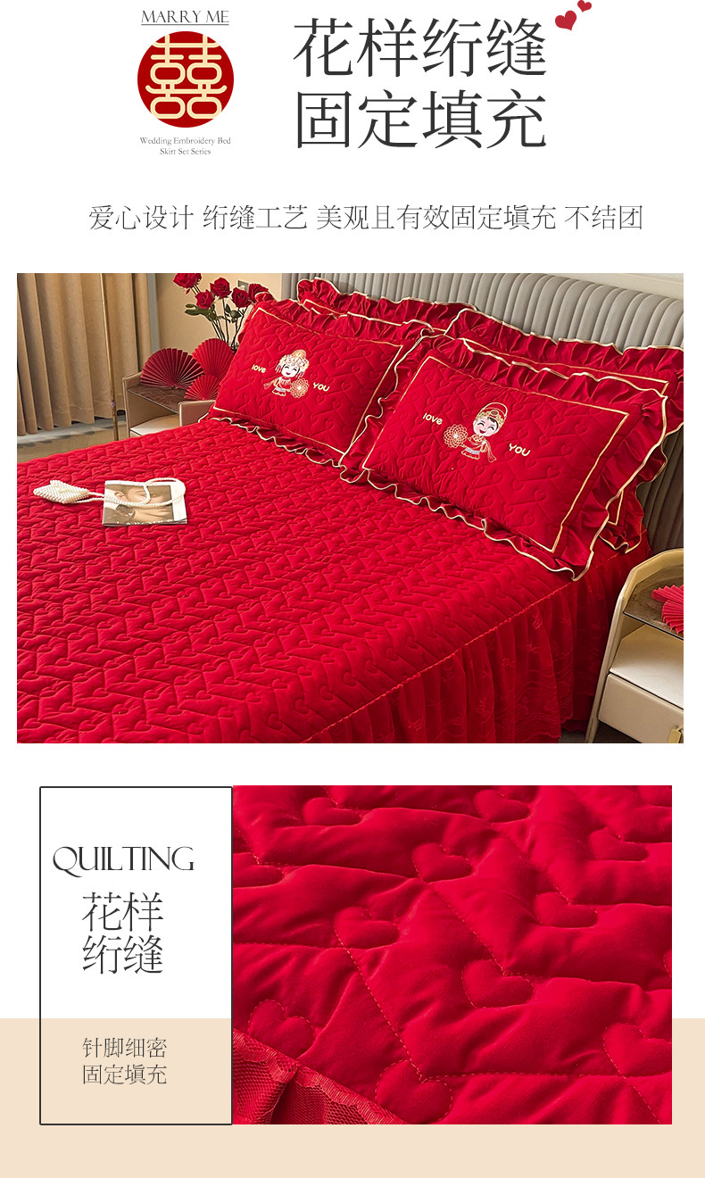 (总)宜凡家纺 2023新款亲肤磨毛婚庆夹棉床裙三件套