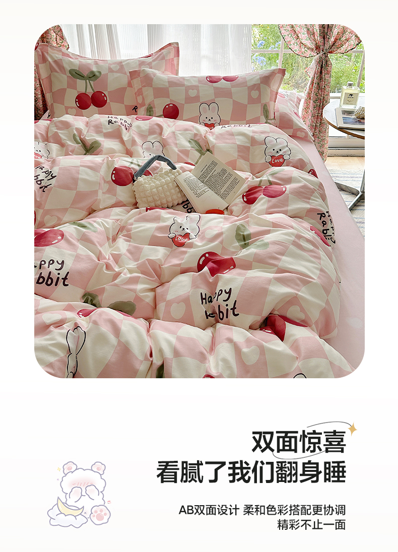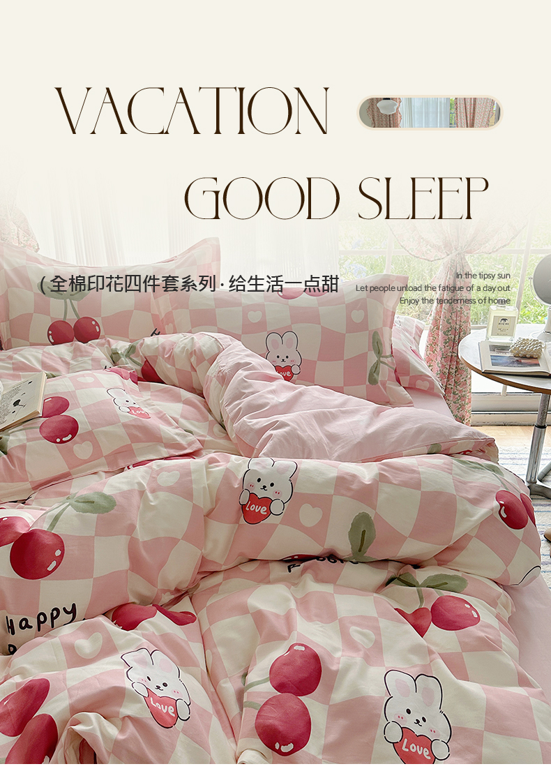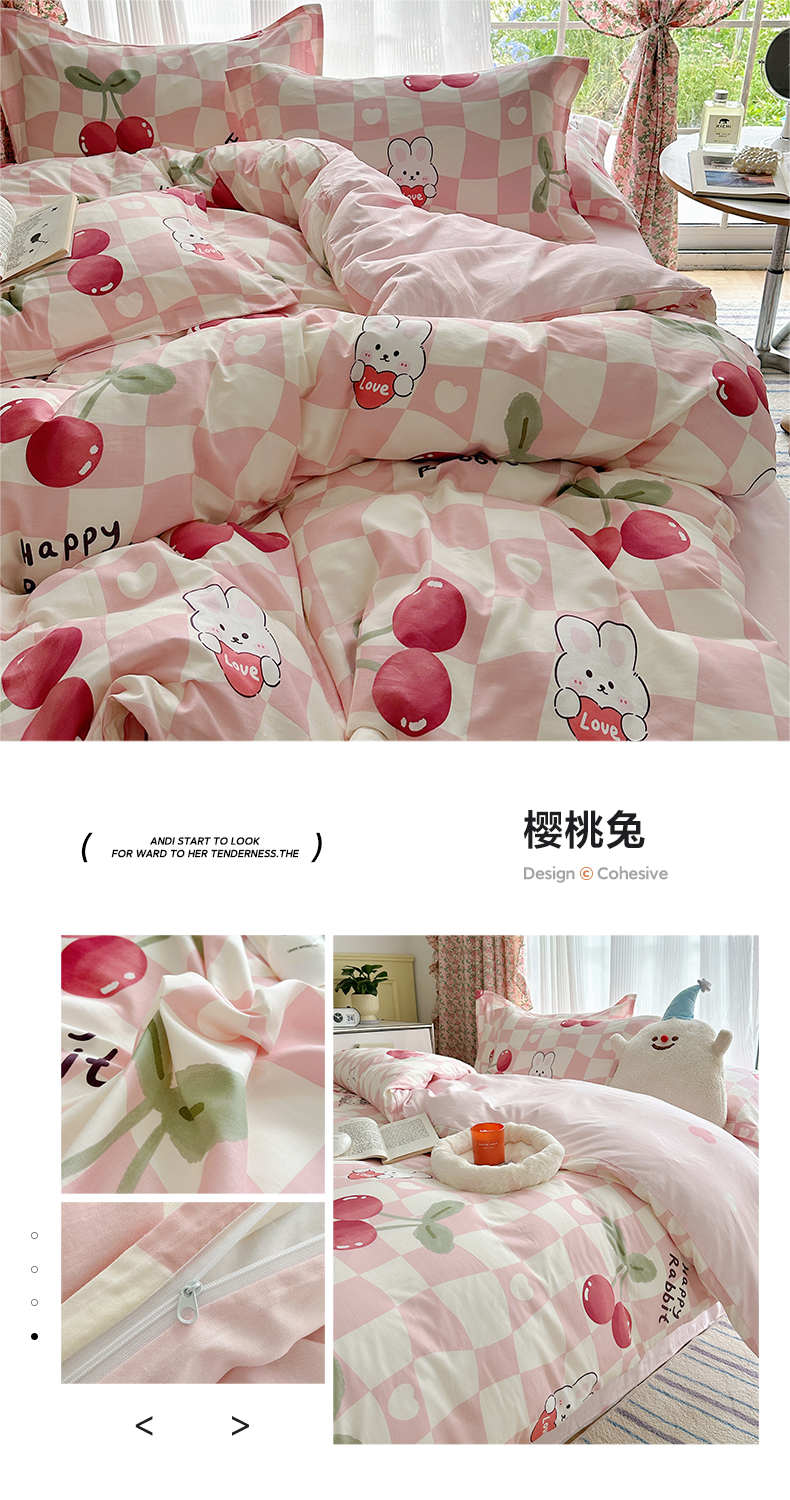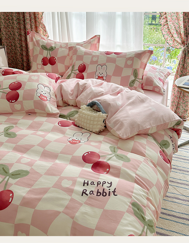 盛馨家纺 全棉喷气纯棉床笠印花简约田园风三件套四件套 樱桃兔