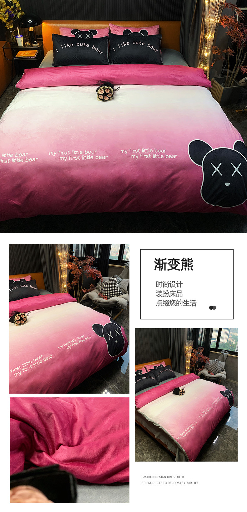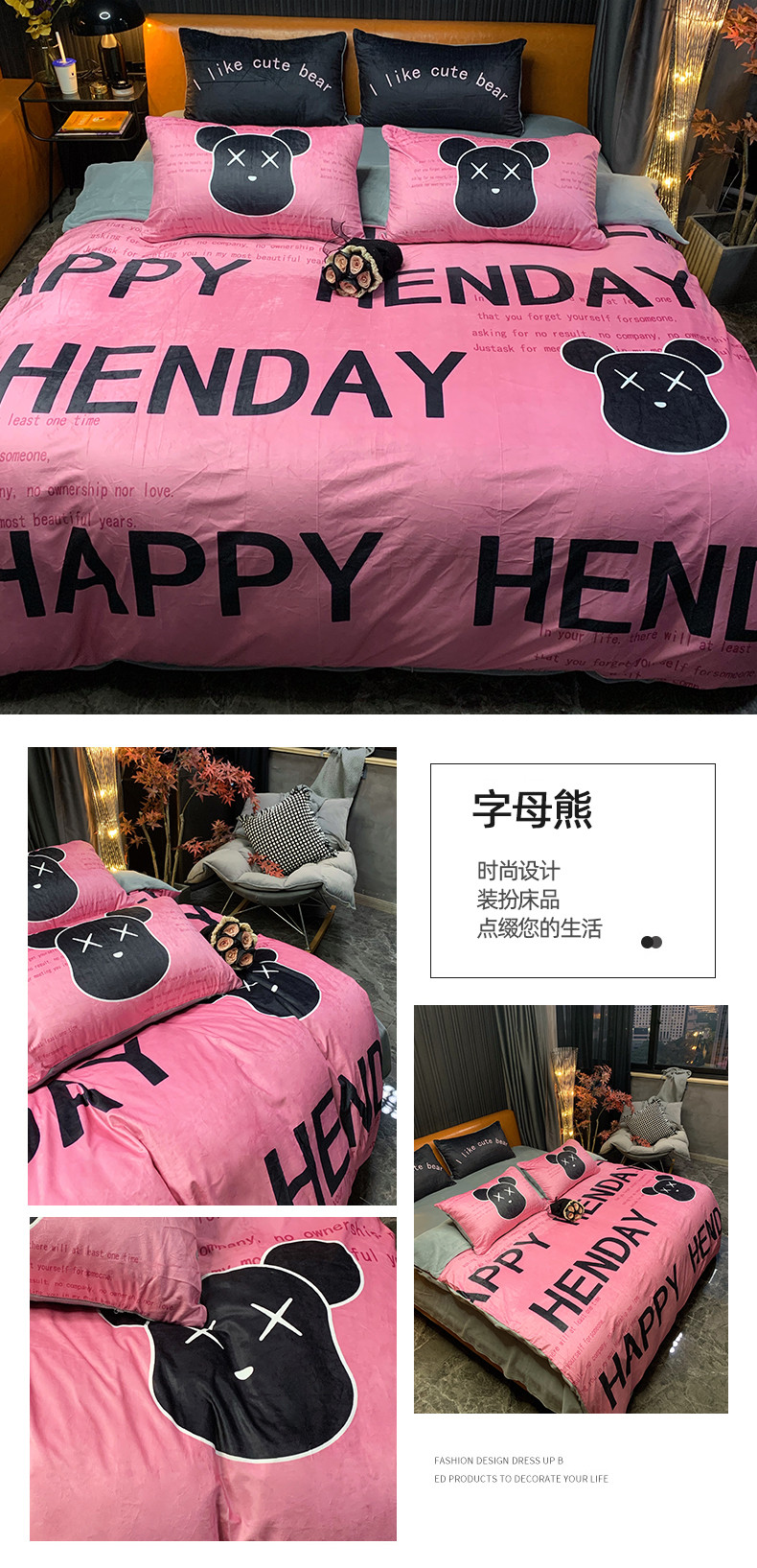 (总)花沐家居 2023新款活性数码印花牛奶绒四件套-场景1,白色字母熊,黑白金范,黑白熊,黑色花朵,渐变熊,条纹,小白熊,小粉熊,小古黑花,小黑熊,小香风字母,字母熊
