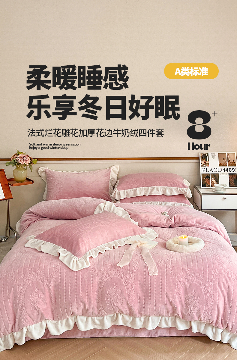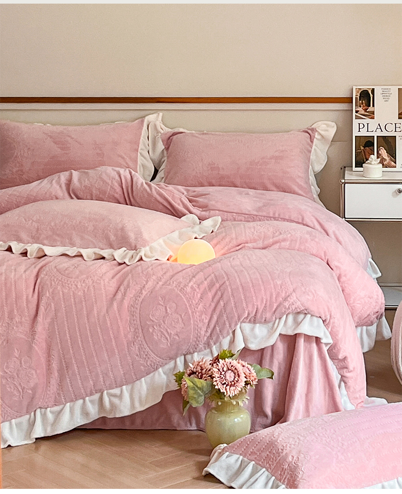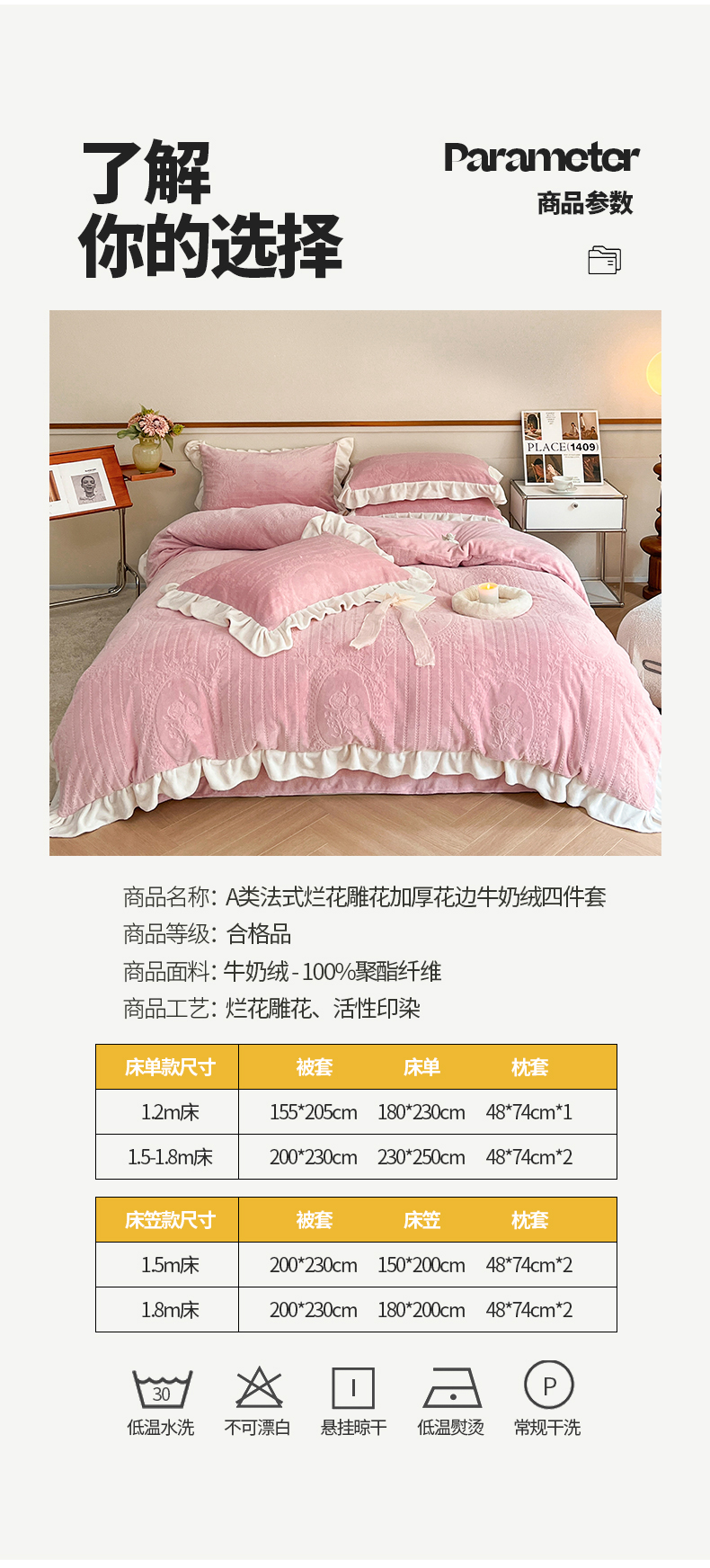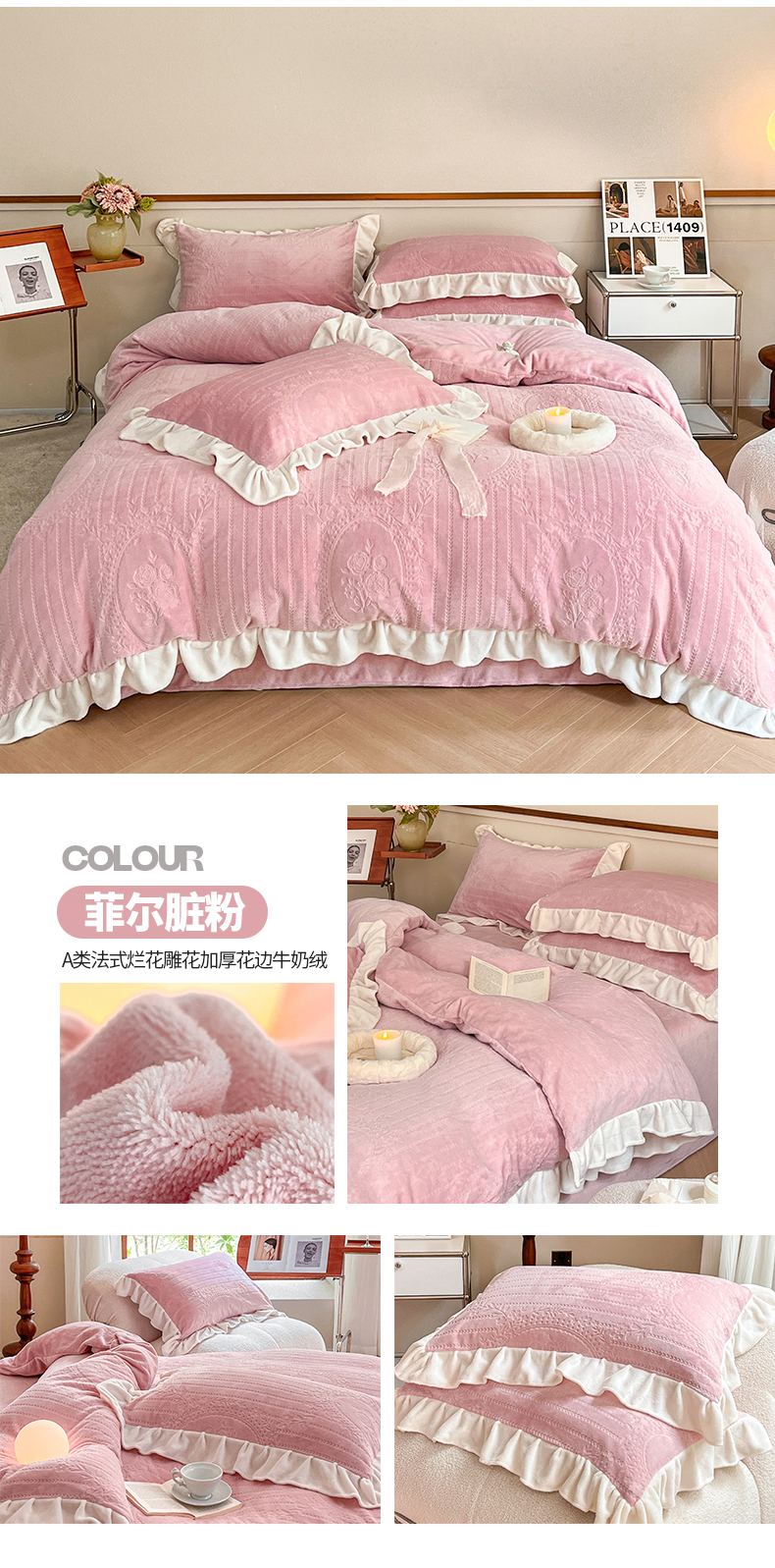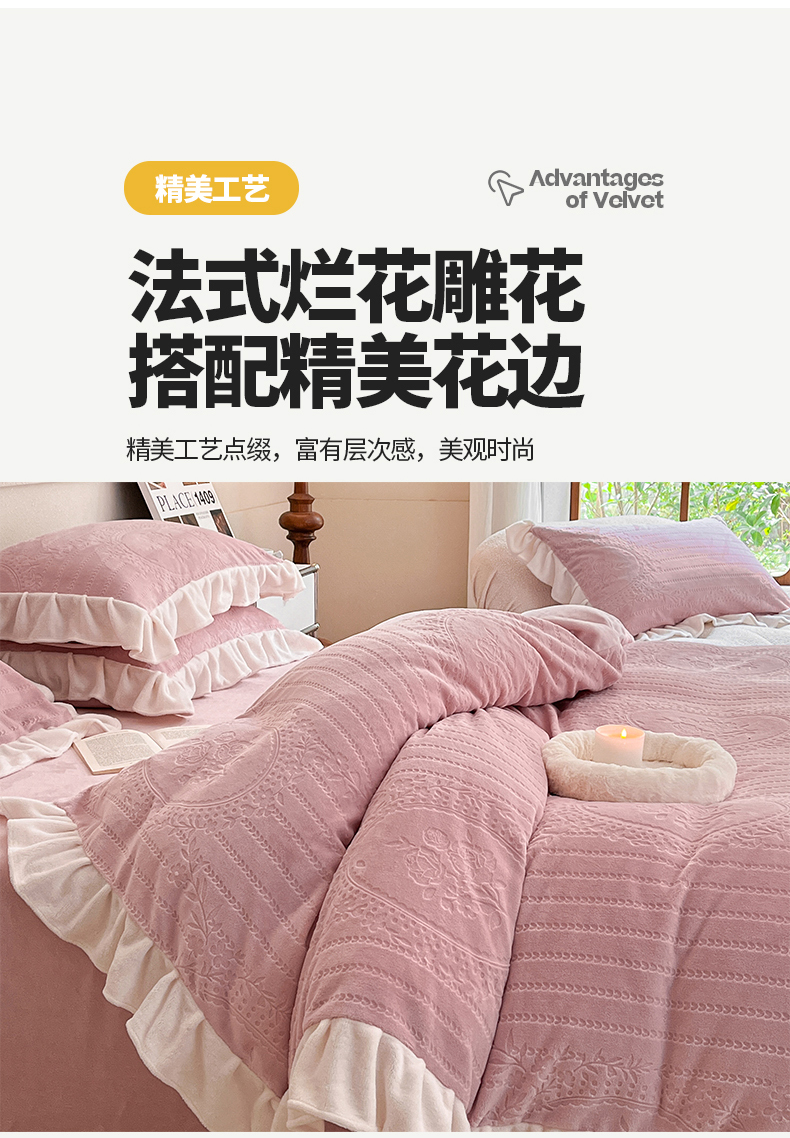 商品名称:桃子家居 2023新款A类高克重230克法式烂花雕花提花加厚韩版花边牛奶绒四件套 绒烂花-菲尔脏粉