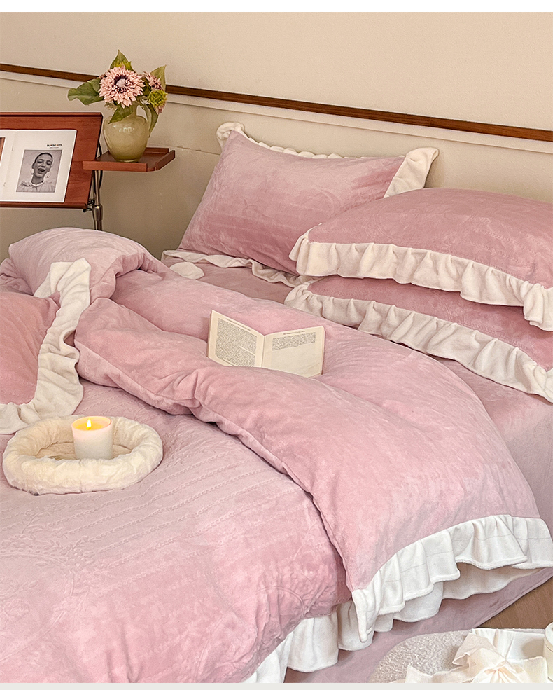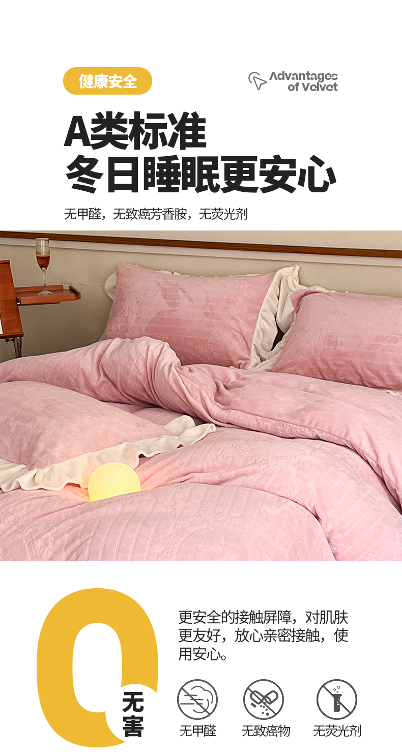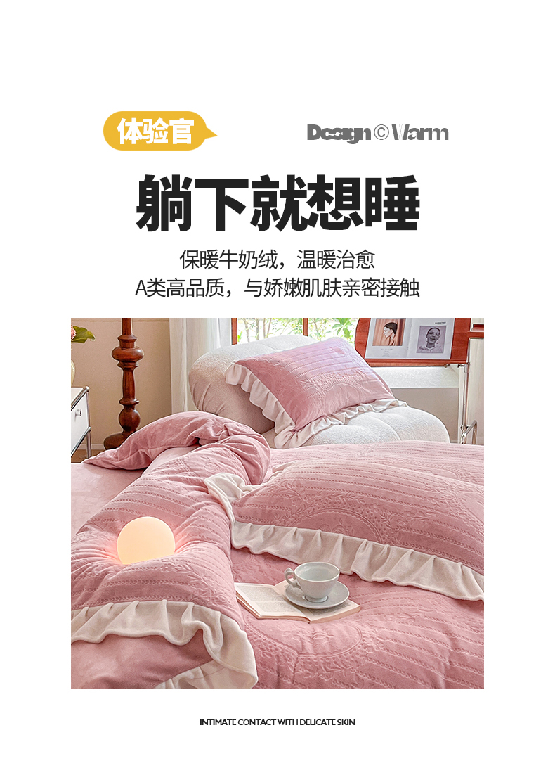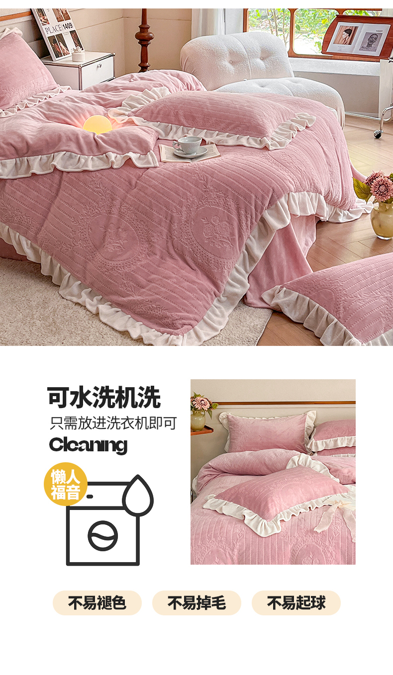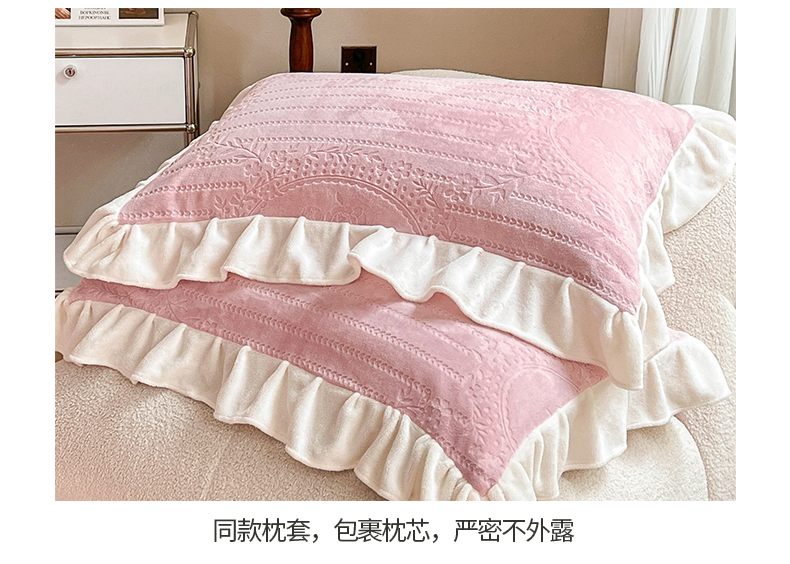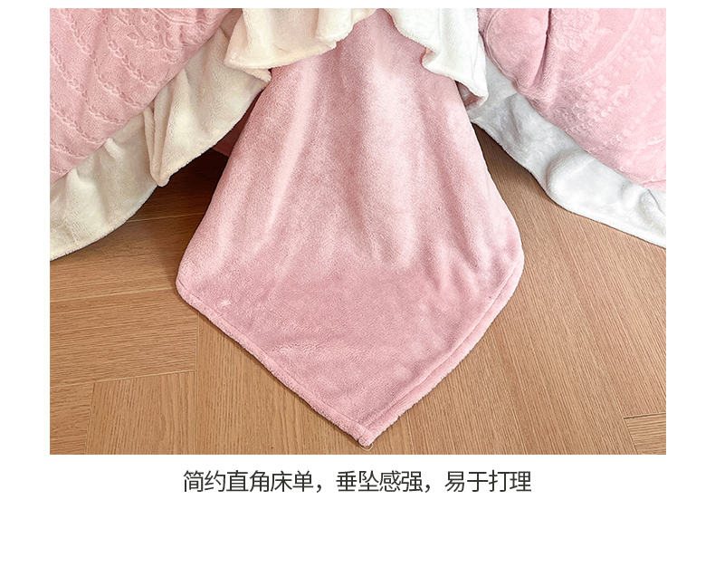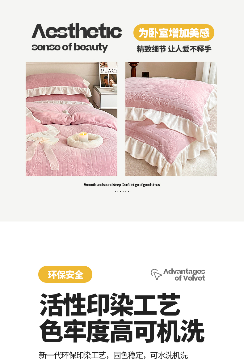 商品名称:桃子家居 2023新款A类高克重230克法式烂花雕花提花加厚韩版花边牛奶绒四件套 绒烂花-菲尔脏粉