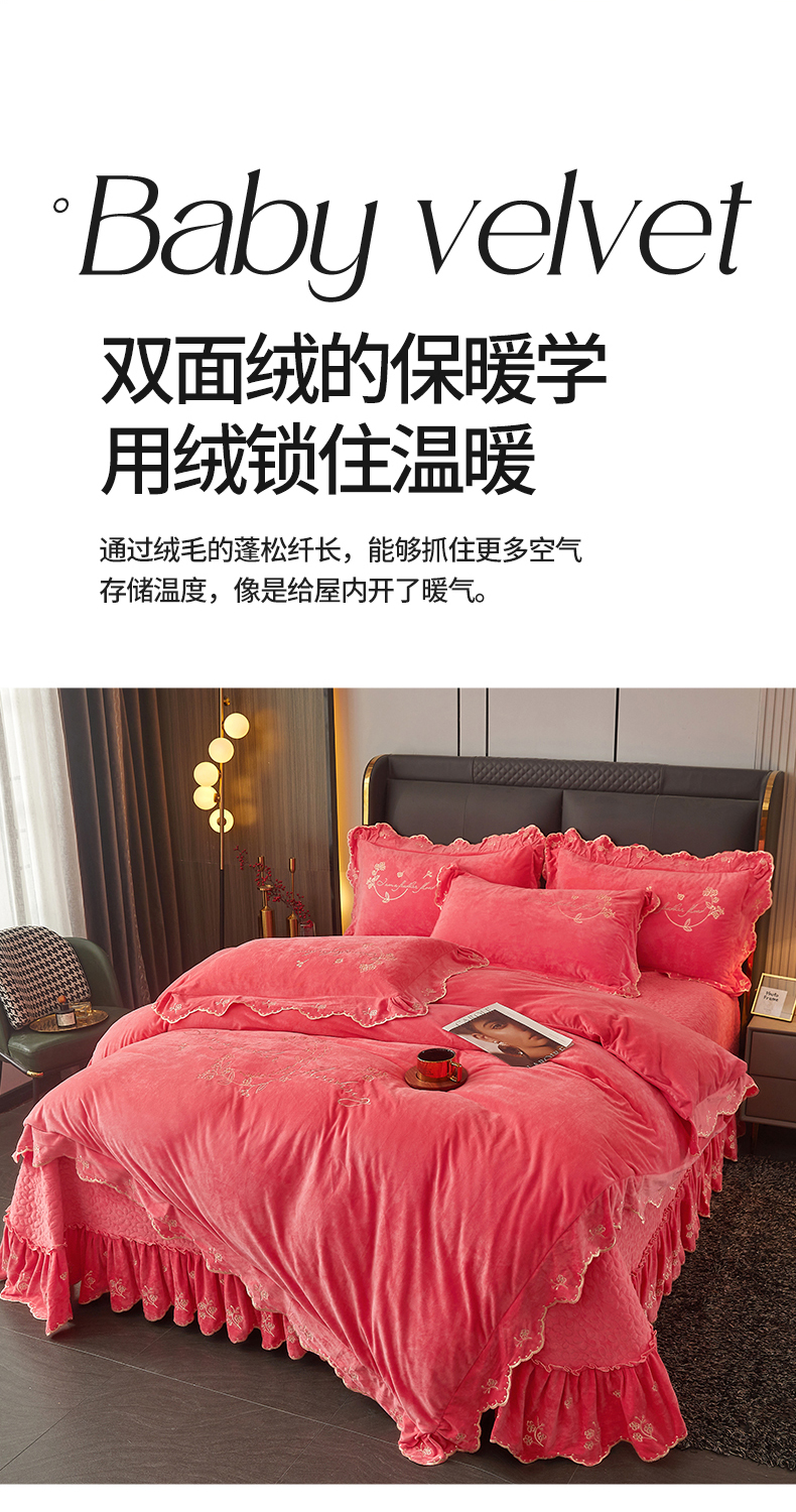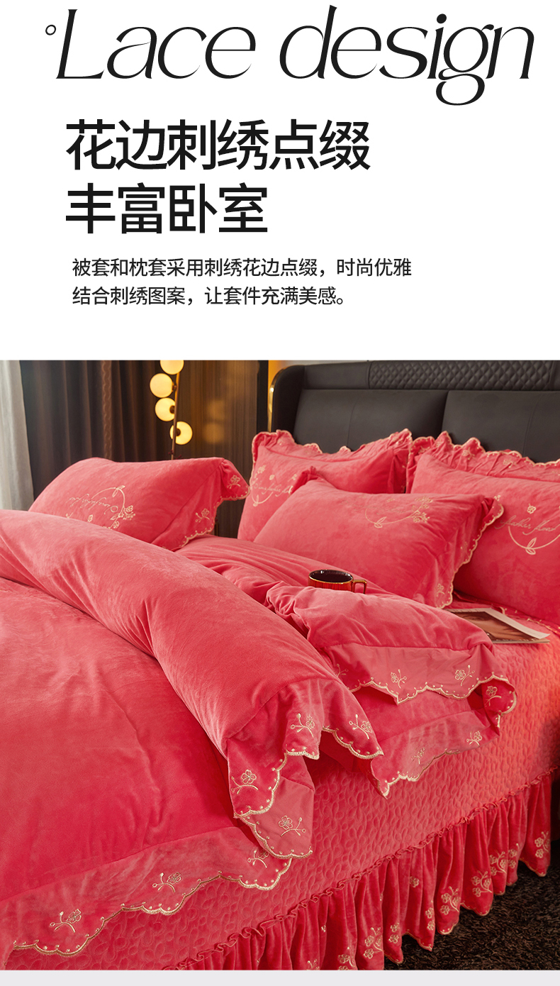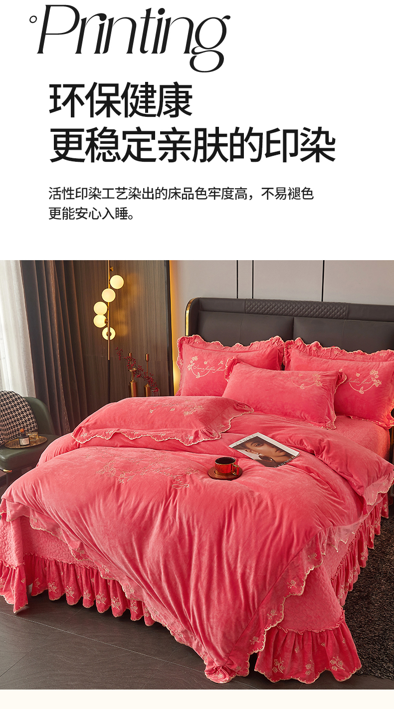(总)恒爱 2022秋冬水晶绒翩翩花舞夹棉床裙四件套,大红色,豆沙红,橄榄绿,公主粉,桔色,咖啡色,孔雀绿,拉菲红,罗兰紫,玫红色,美人玉,米白色,米驼色,抹茶绿,浅灰色,紫色