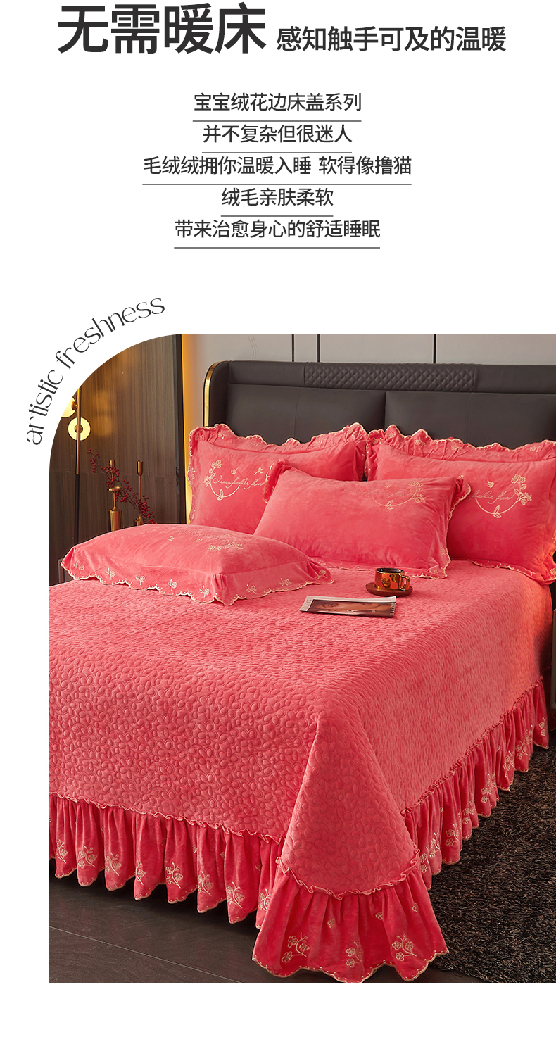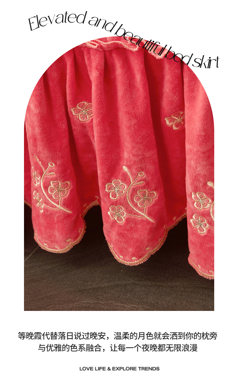 (总)恒爱 2022秋冬水晶绒翩翩花舞夹棉单床裙,大红色,豆沙红,橄榄绿,公主粉,桔色,咖啡色,孔雀绿,拉菲红,罗兰紫,玫红色,美人玉,米白色,米驼色,抹茶绿,浅灰色,紫色