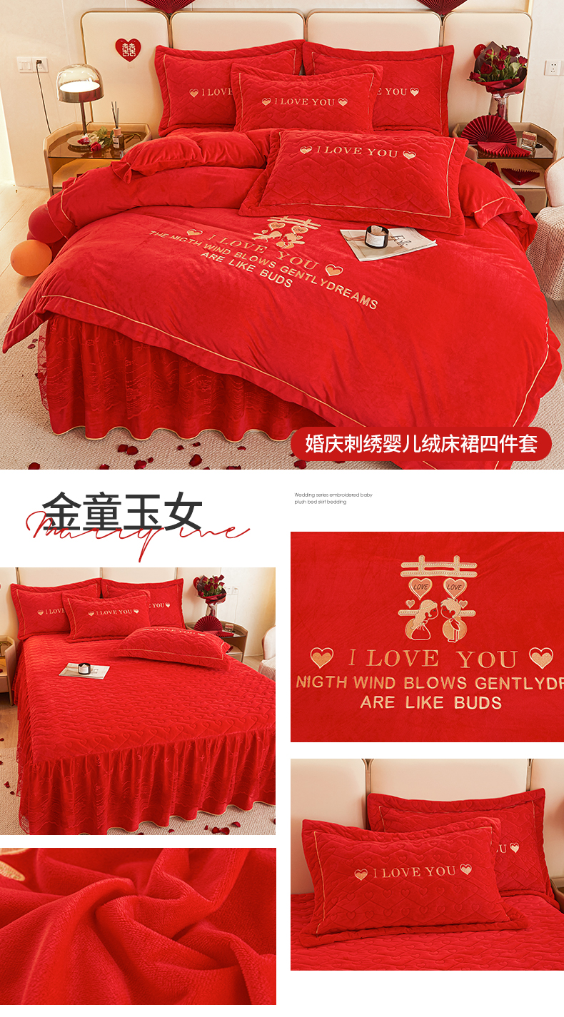 当前位置: 91家纺网 > 商品网购 > 床品套件 > 四件套 > 宜凡家纺 2023秋冬新品新品婴儿绒婚庆床裙四件套 金童玉女