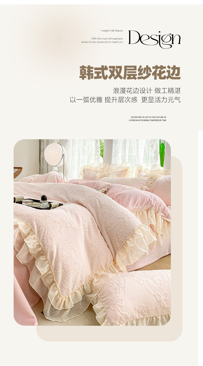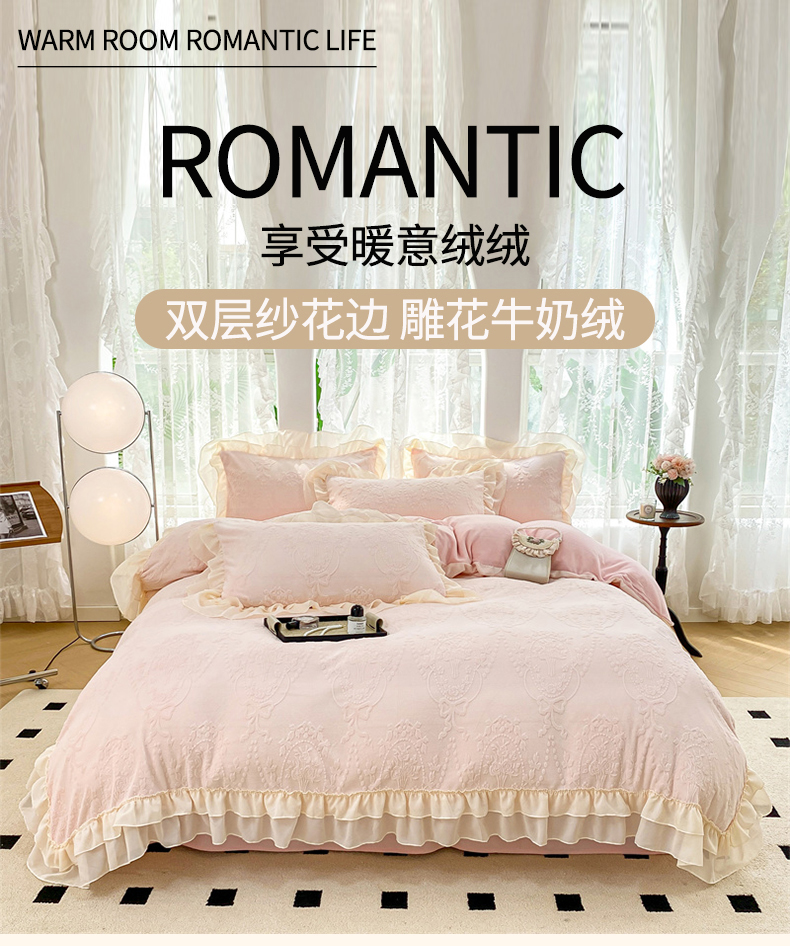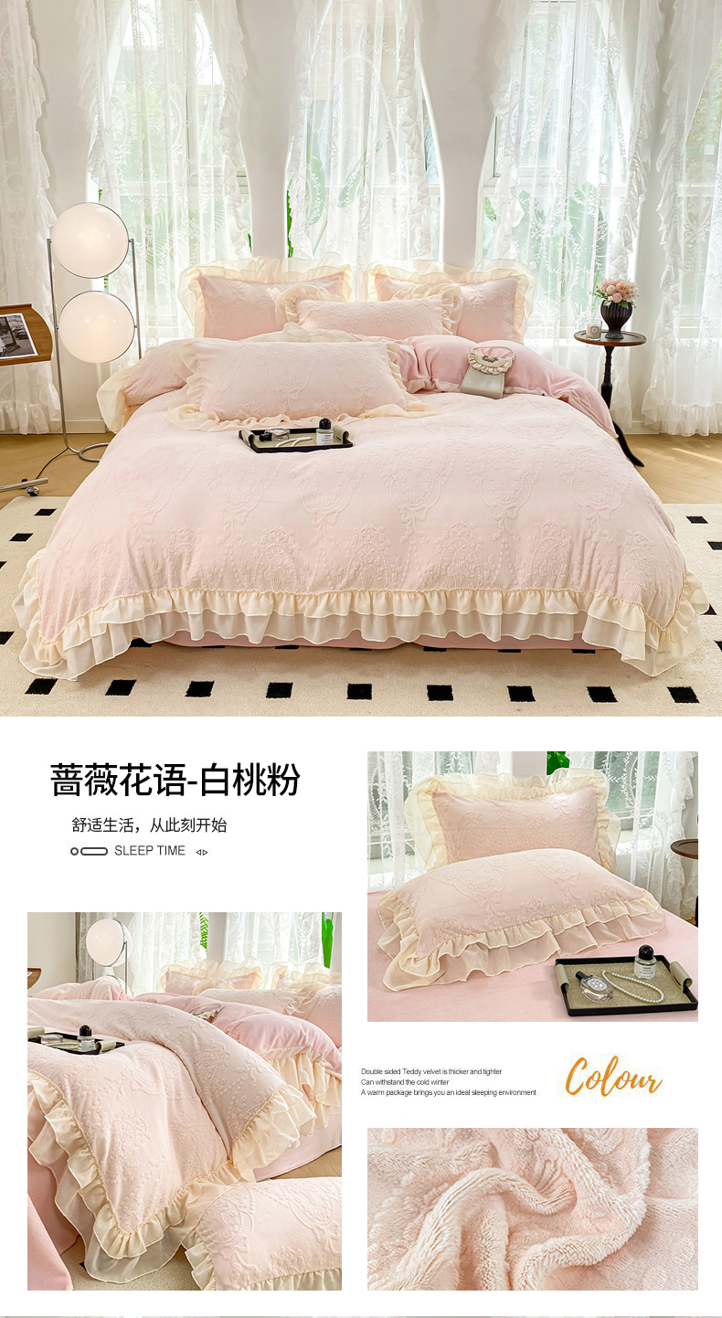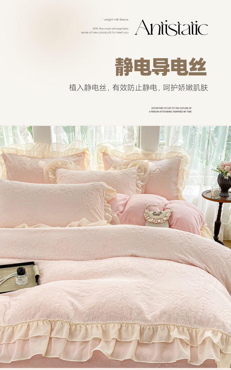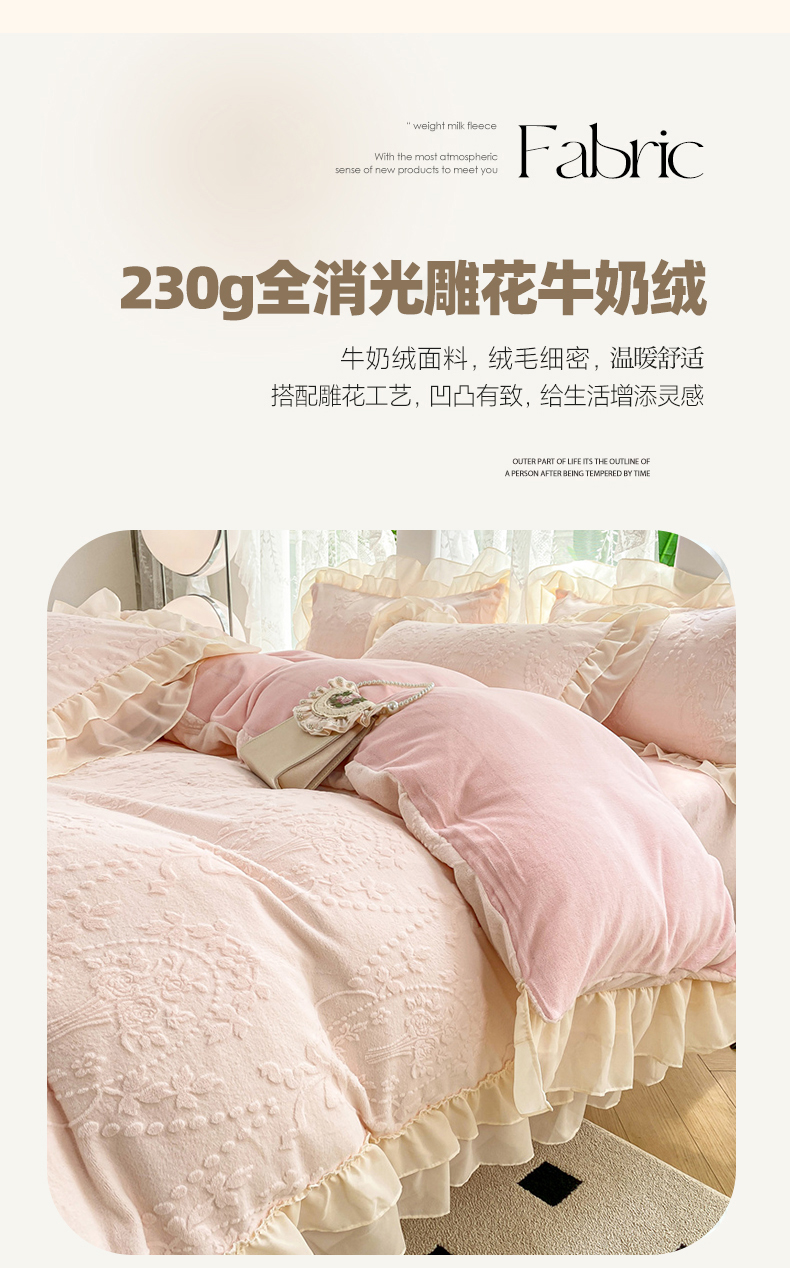 商品名称:大米家居 2023新款法式双层边230克雕花牛奶绒蔷薇花语系列四件套 蔷薇花语-白桃粉