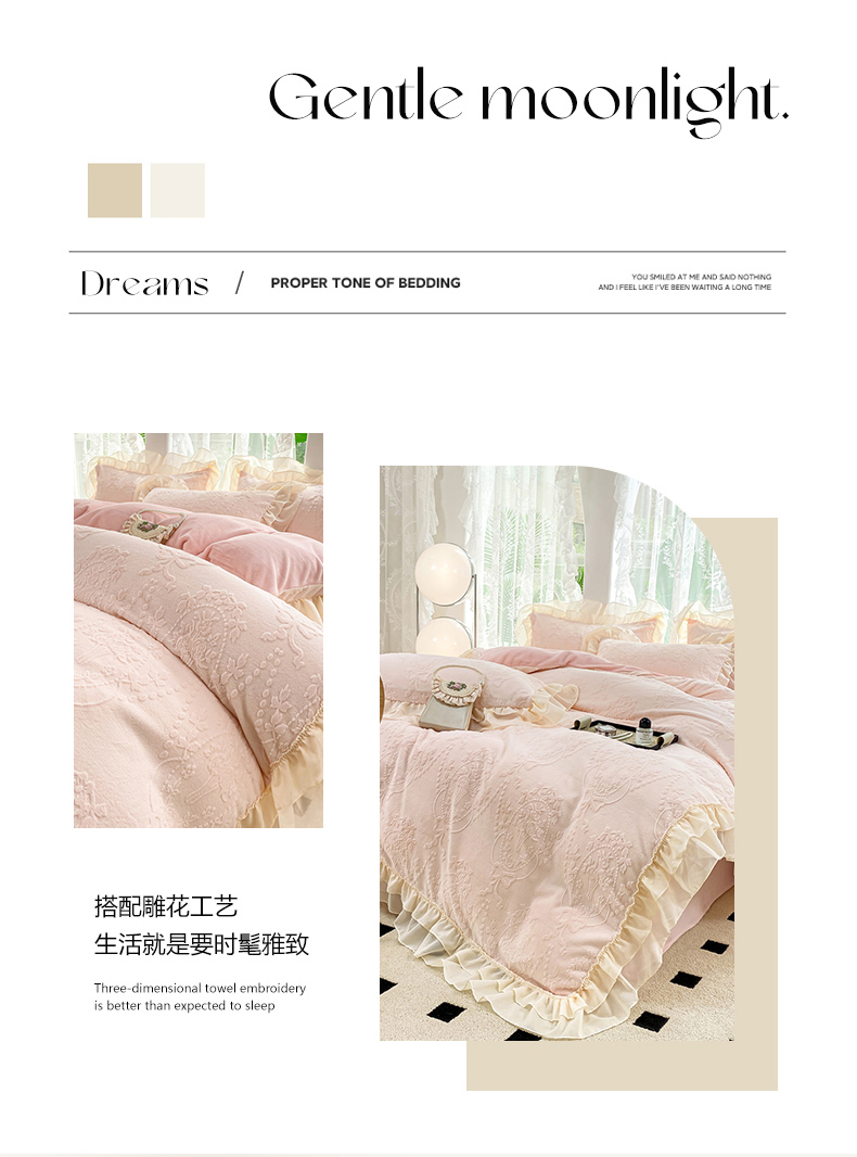 大米家居 2023新款法式双层边230克雕花牛奶绒蔷薇花语系列四件套 蔷薇花语-白桃粉