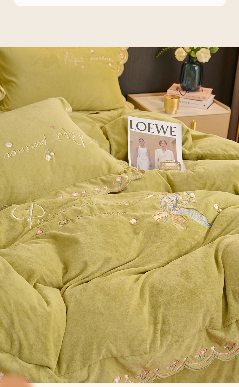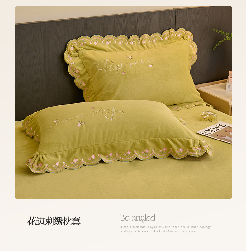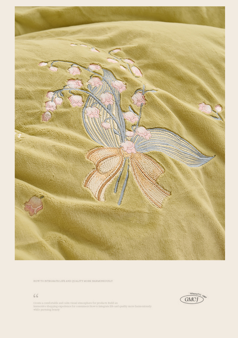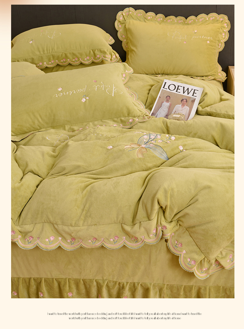 商品名称:恒爱2023新款加厚双面牛奶绒绣花花边款四件套-铃兰花 芥末黄