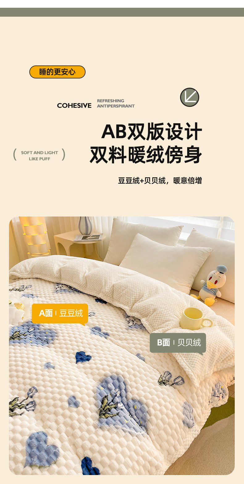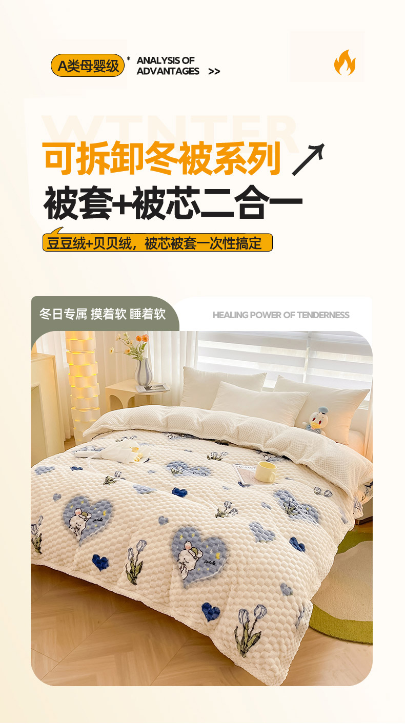 (总)熙宴家纺 2025新款可拆卸冬被被套+被芯二合一可拆洗豆豆绒棉花被子被芯,爱心兔,草绿,大脚熊,粉朵朵花,粉色,欢乐兔,卡其,奶昔白,幸运花,紫花瓣