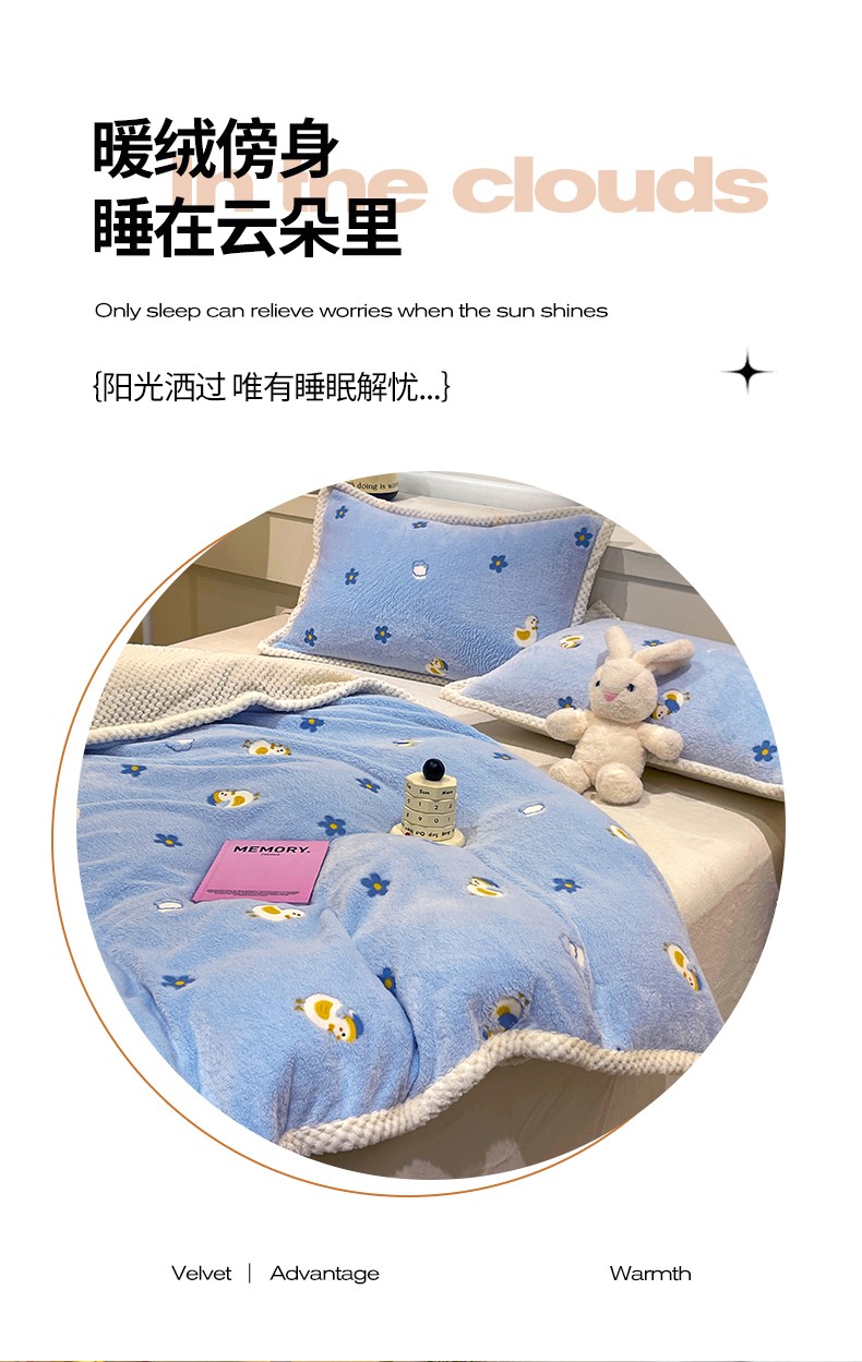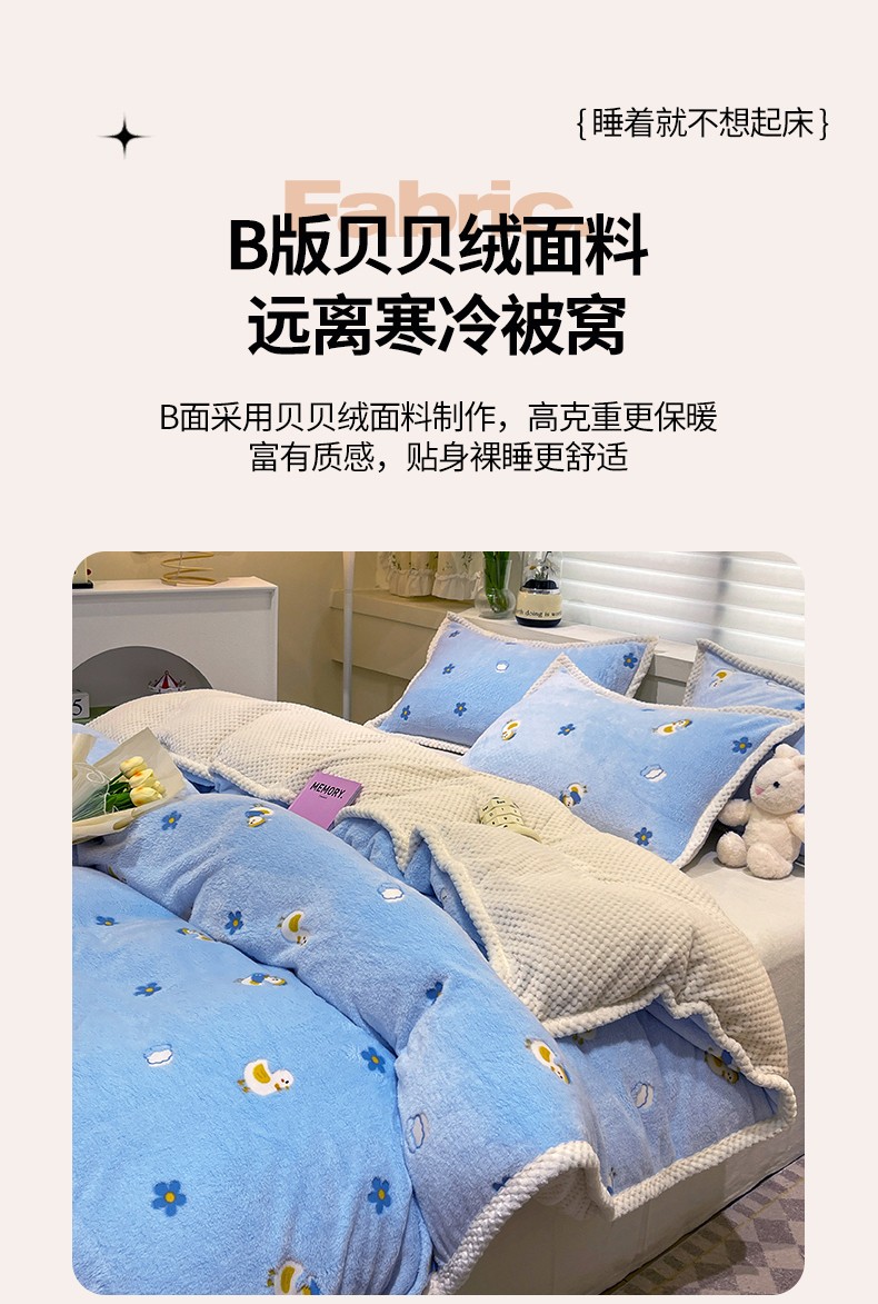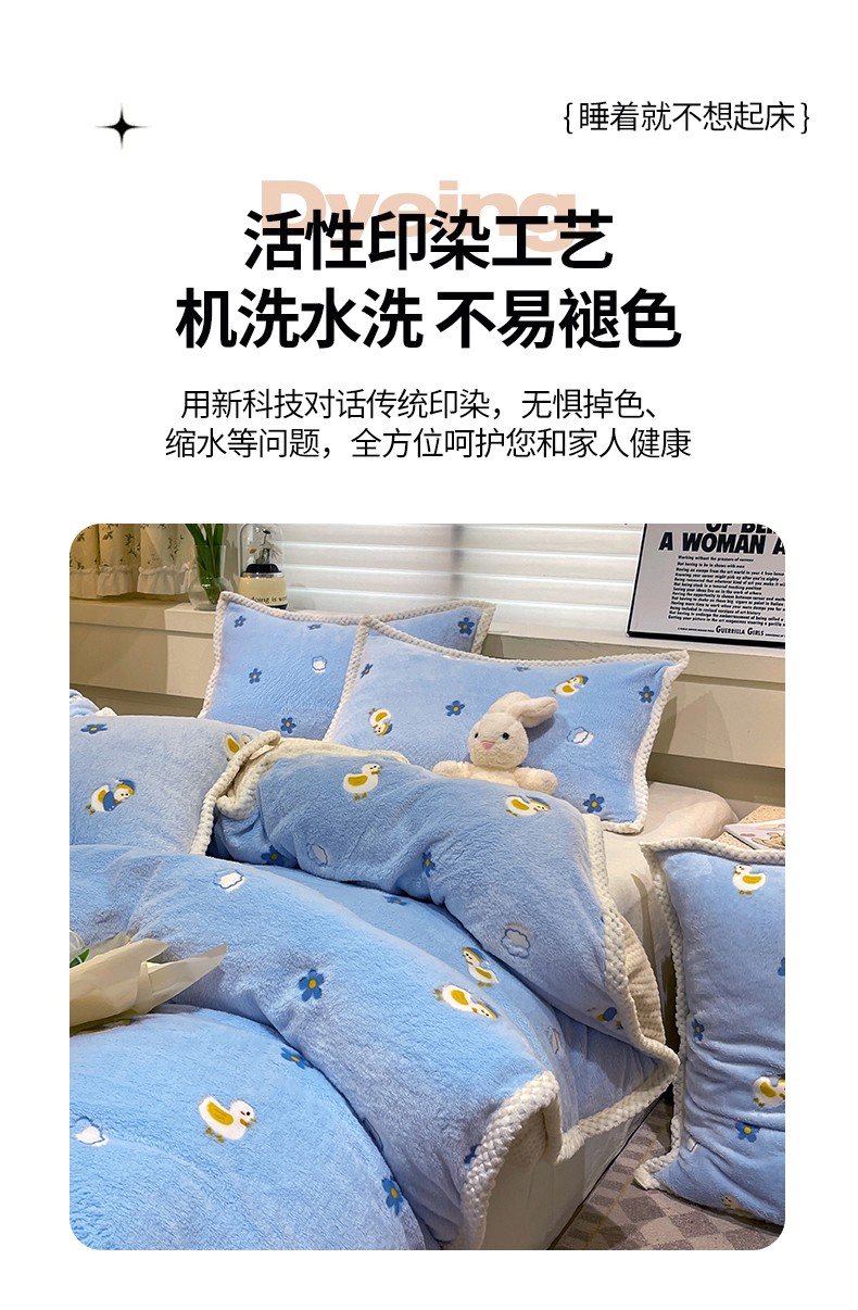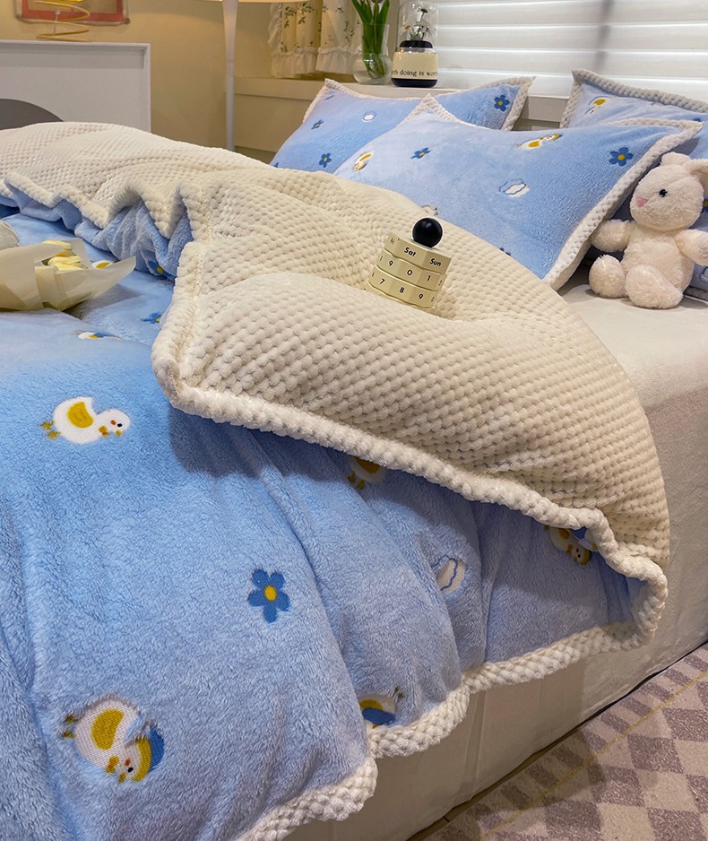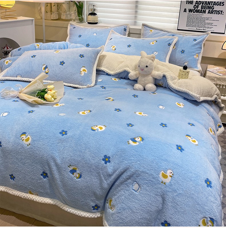当前位置: 91家纺网 > 商品网购 > 床品套件 > 四件套 > 牛奶绒四件套 > 锦威郎 2023新款云朵绒保暖牛奶绒毛毯绒单被套加绒加厚法莱绒四件套 鸭子蓝