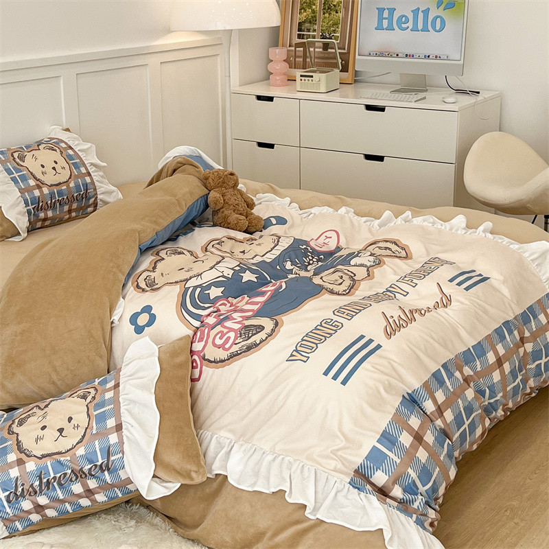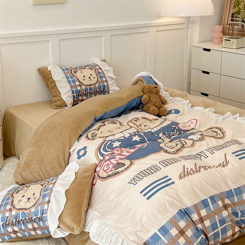 昔可家纺 2023新款花边数码宝宝绒四件套 冬日熊宝