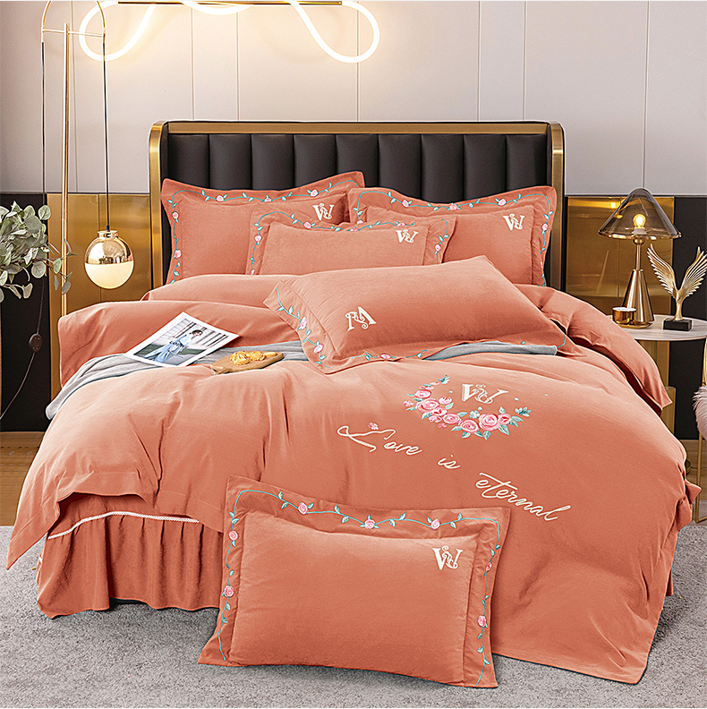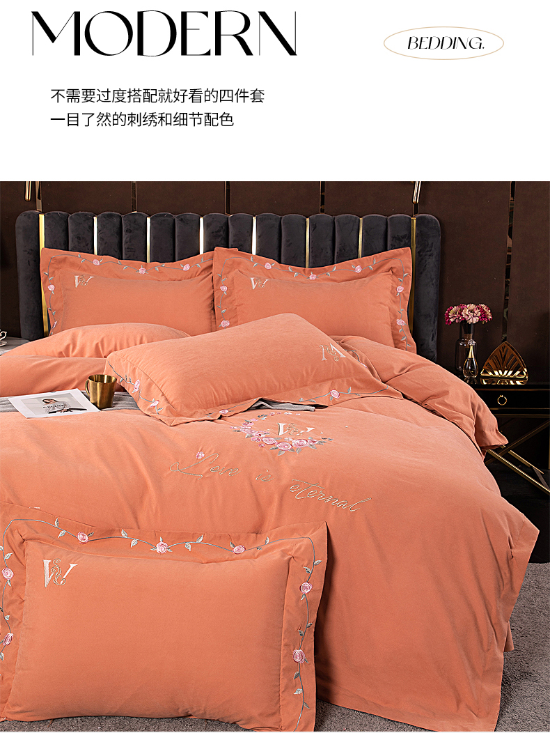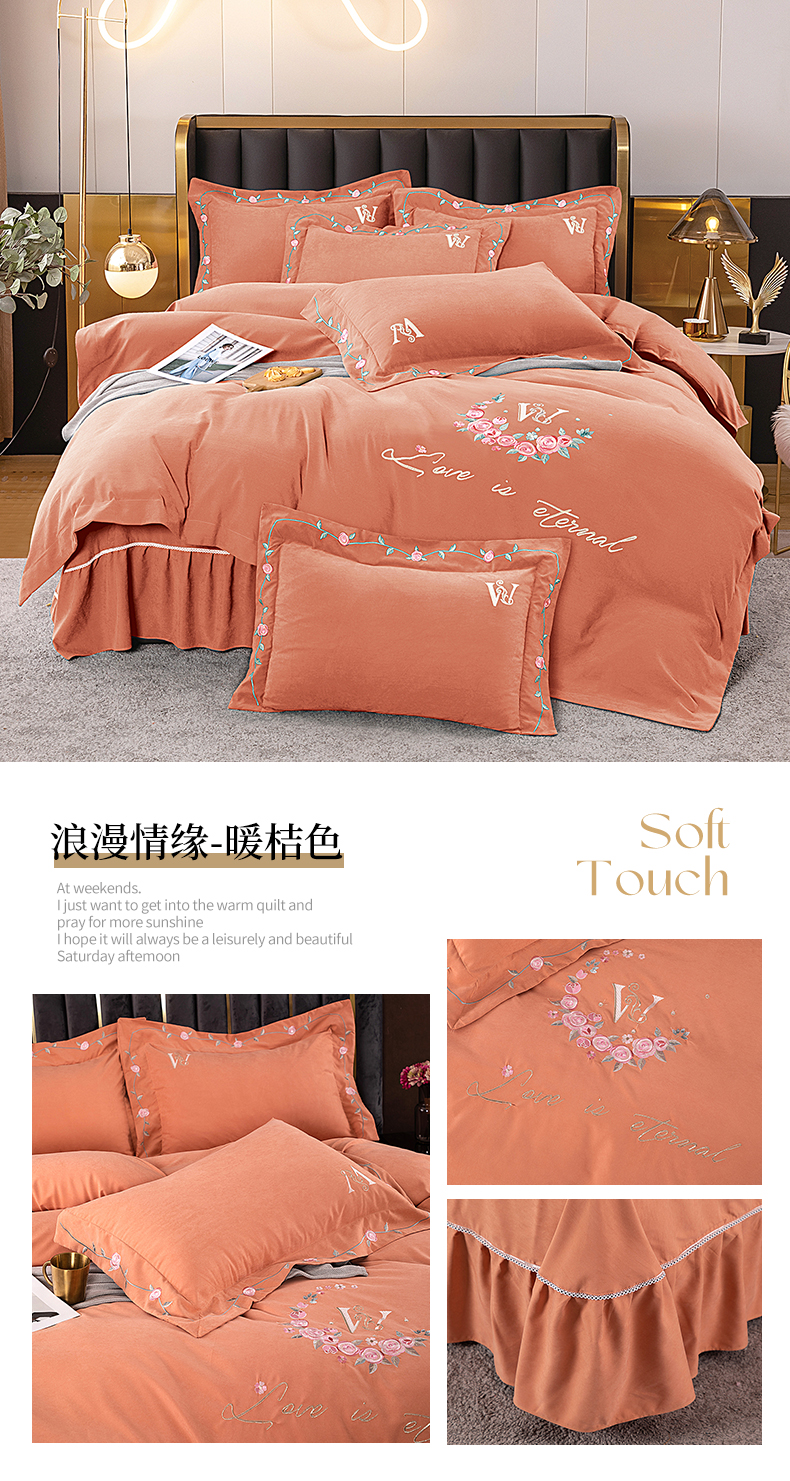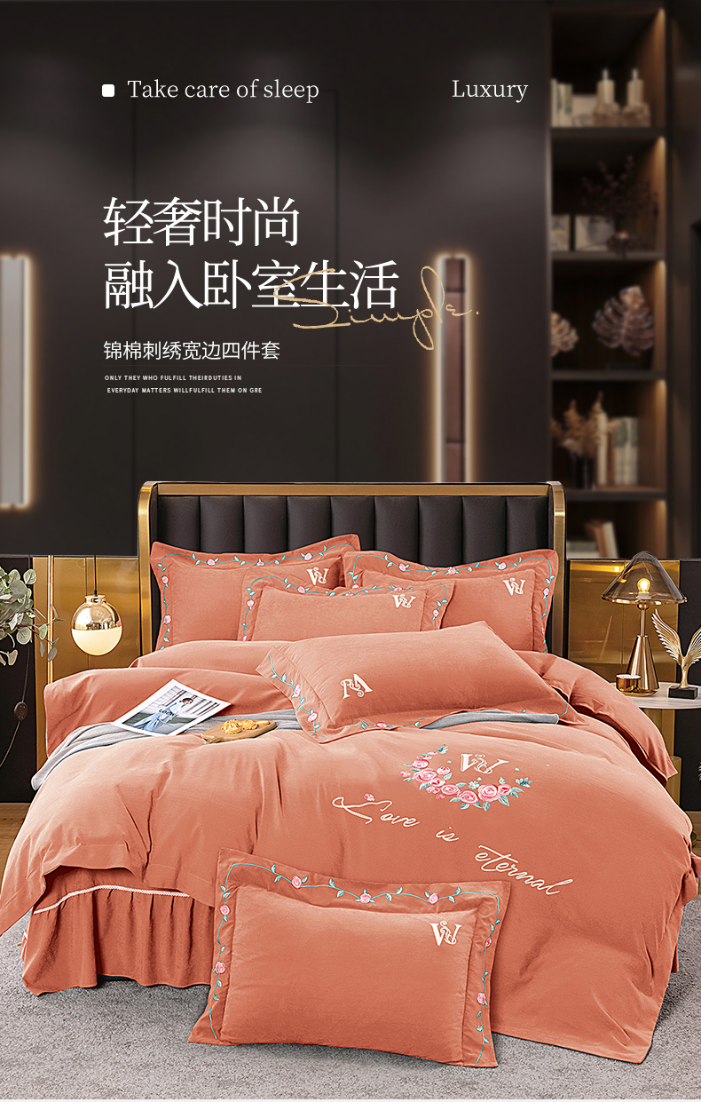 商品名称:伊而梦 2023新款锦棉宽边绣花四件套--浪漫情缘 浪漫情缘-暖桔色