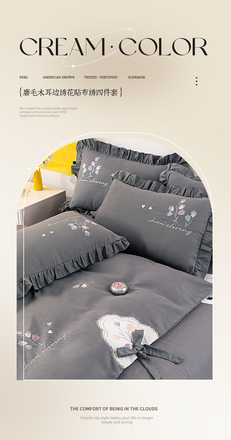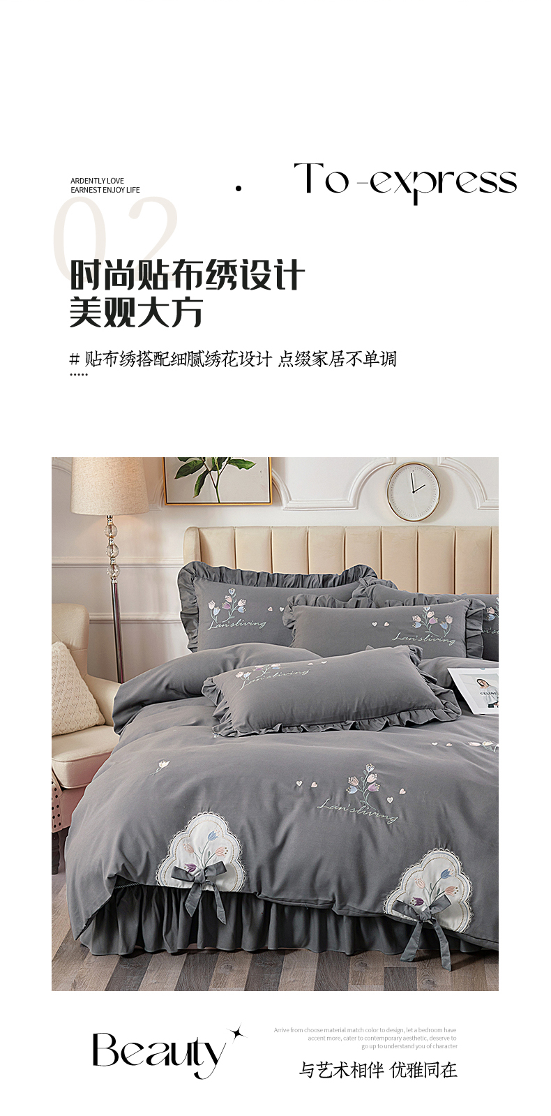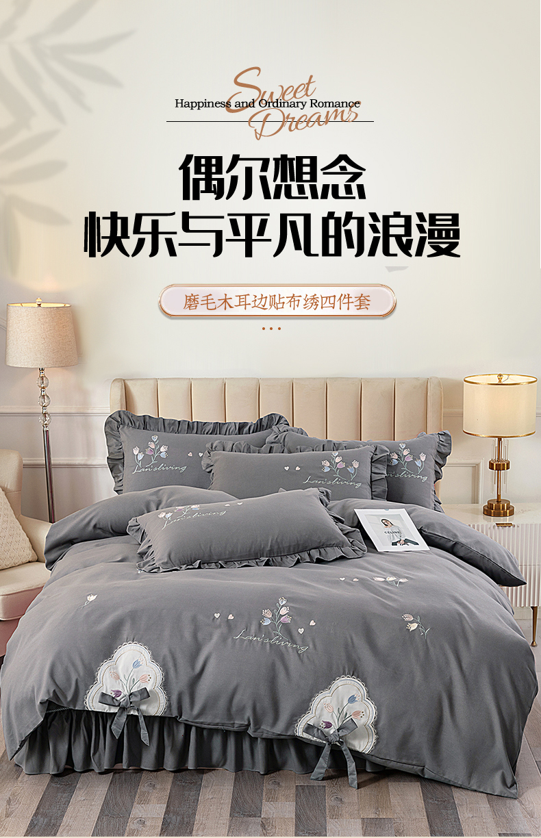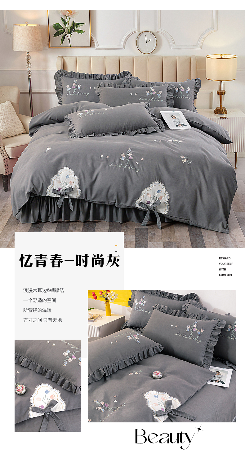 伊而梦蚊帐 2023新款磨毛木耳边绣花贴布绣四件套--忆青春 忆青春-时尚灰