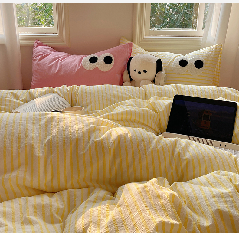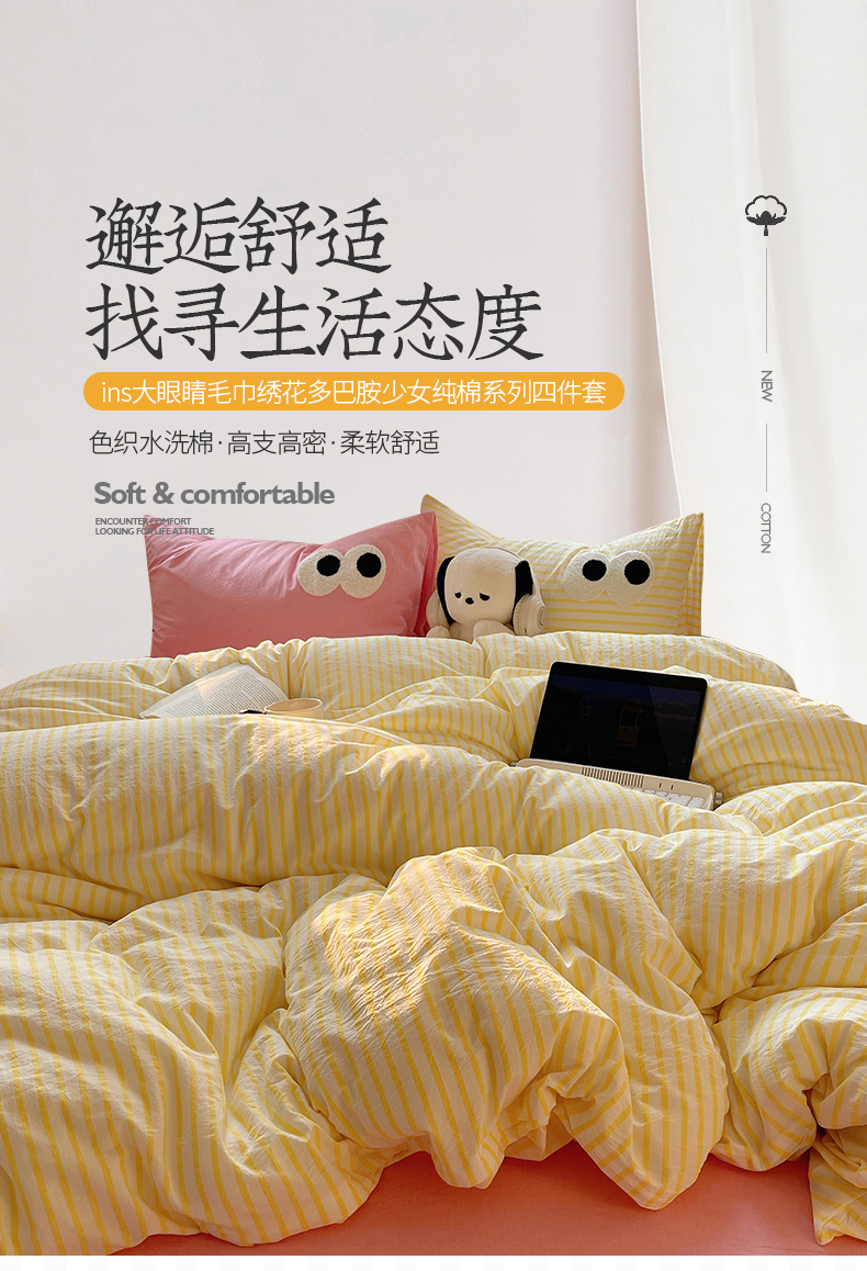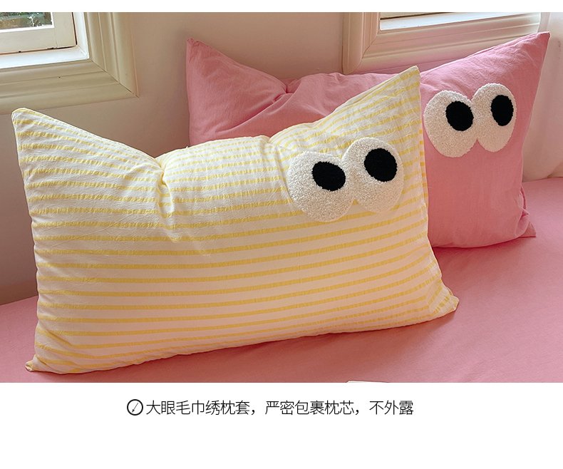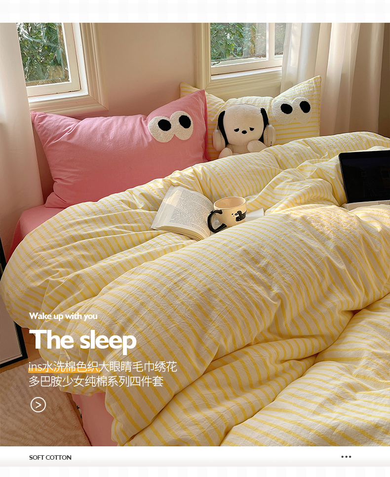商品名称:2023新款ins水洗棉色织大眼睛毛巾绣花多巴胺少女纯棉系列四件套 水洗棉-大眼黄条粉