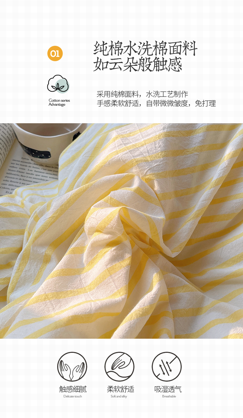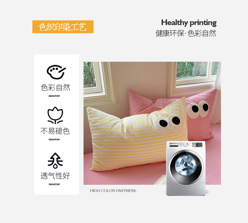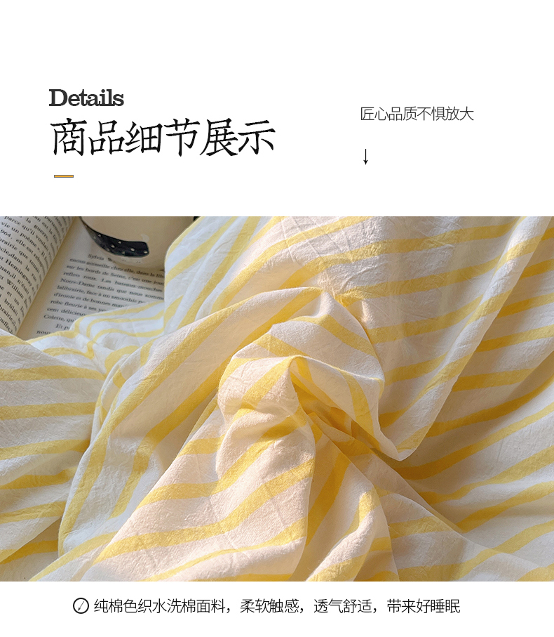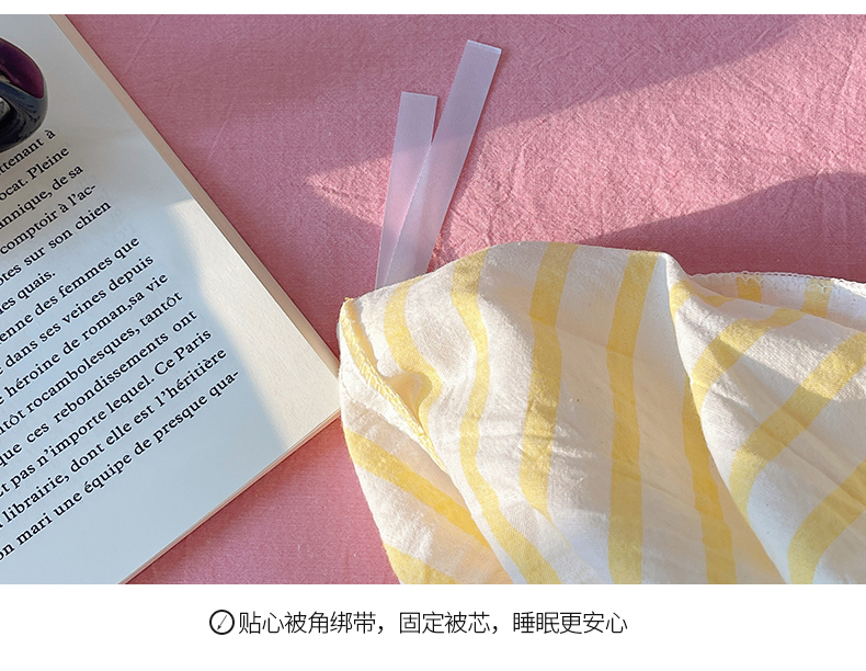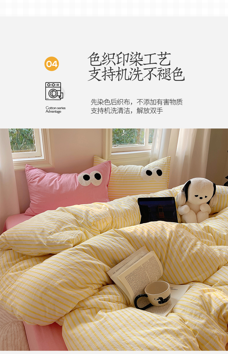 商品名称:2023新款ins水洗棉色织大眼睛毛巾绣花多巴胺少女纯棉系列四件套 水洗棉-大眼黄条粉