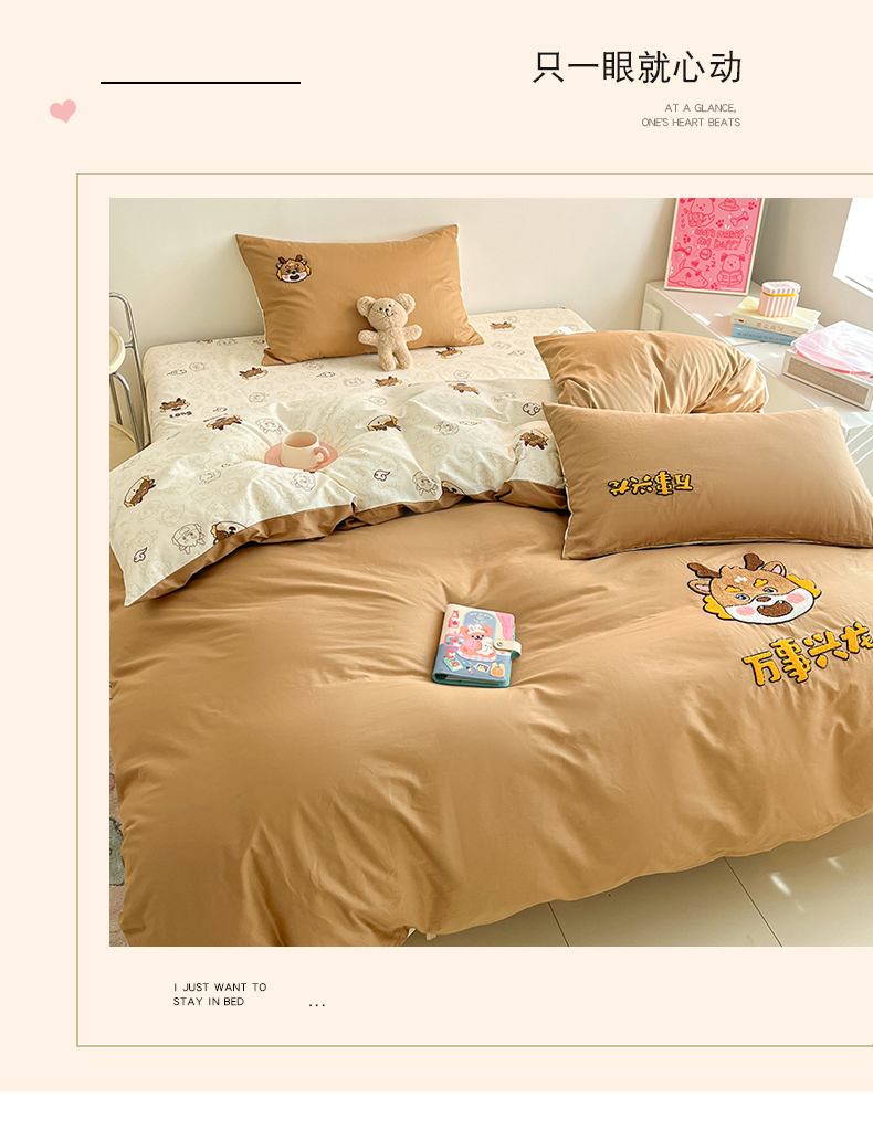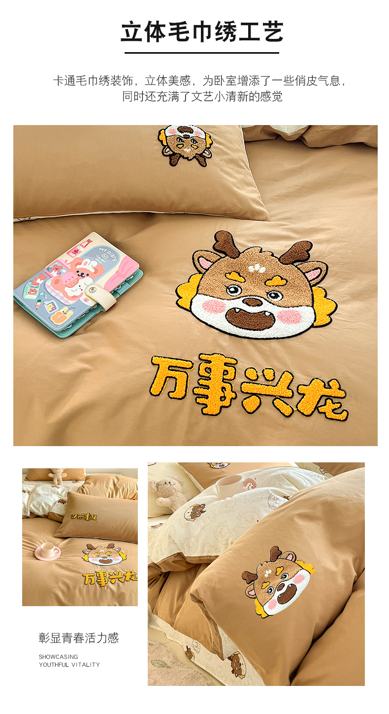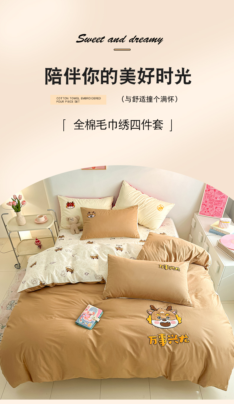 金丝鸟家纺 2024新款全棉混搭毛巾绣四件套可爱卡通库洛米系列 咖色小龙