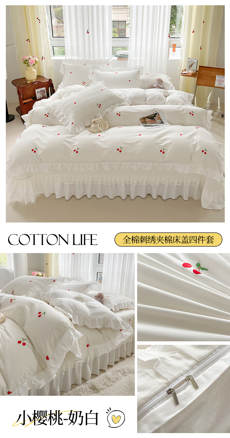 宜凡家纺 2024新款全棉夹棉绣花花边系列床盖四件套 小樱桃-奶白
