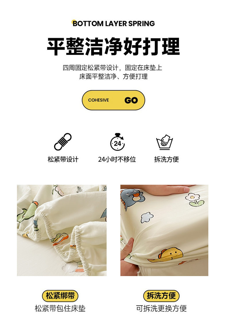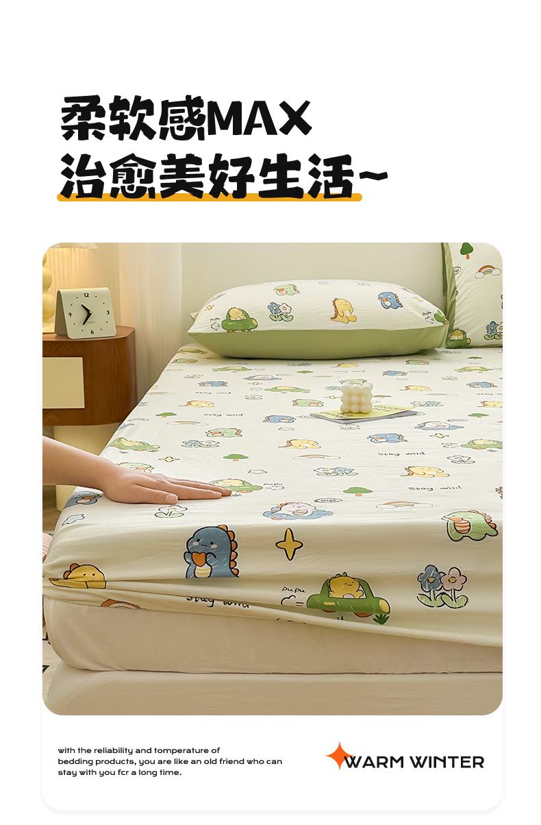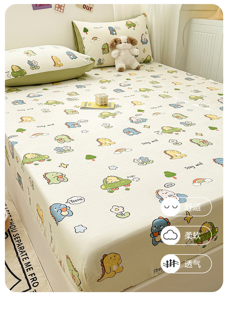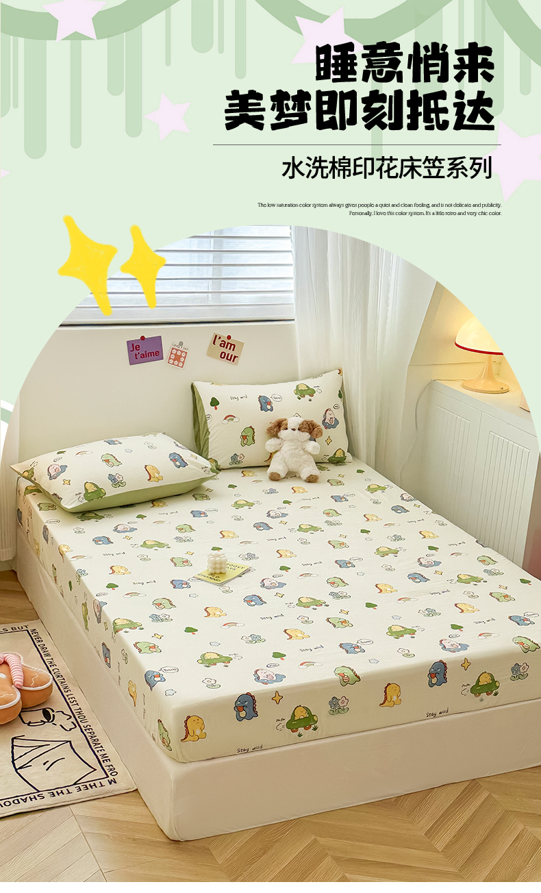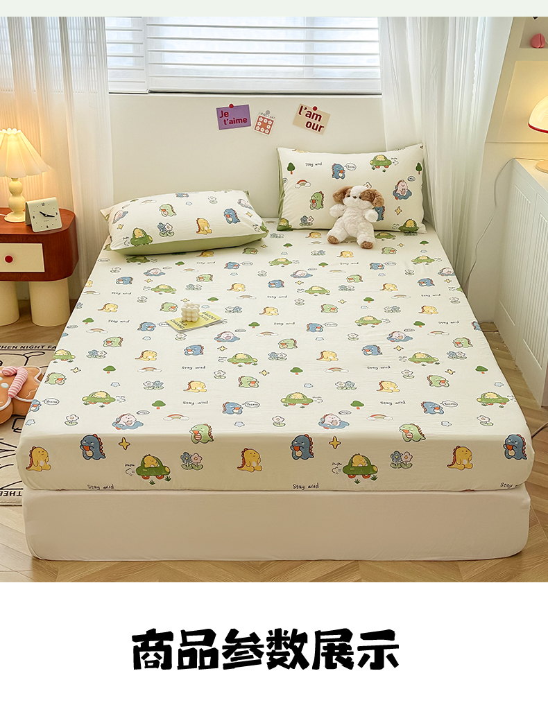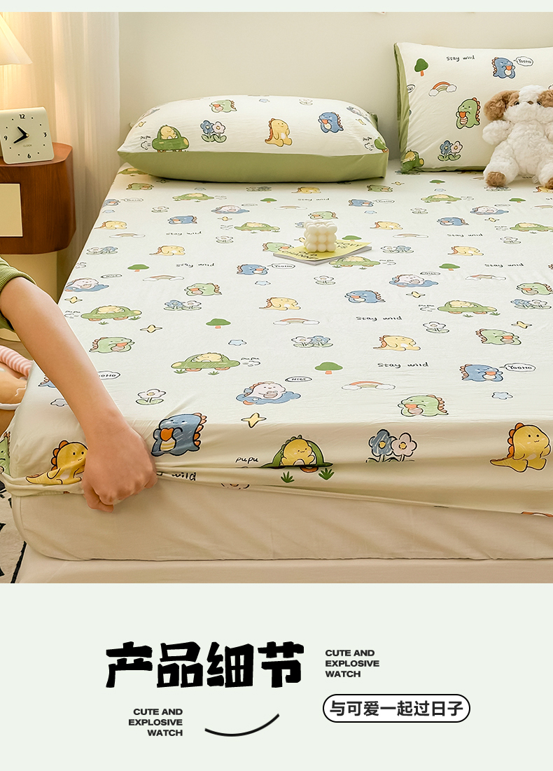 • 91家纺网 家纺一手货源 找家纺 古吉梦 2024新款水洗棉小清新印花床笠 恐龙乐园