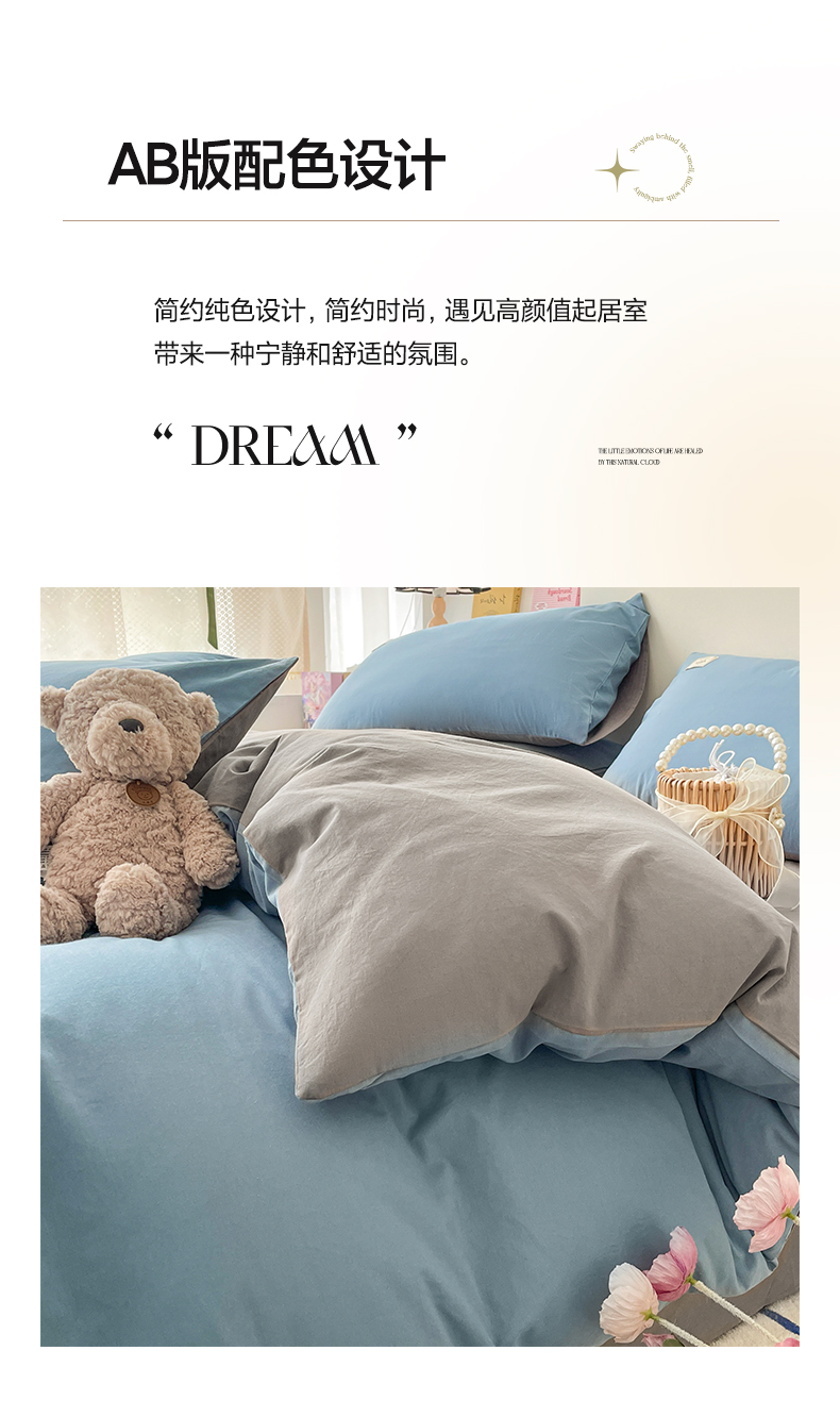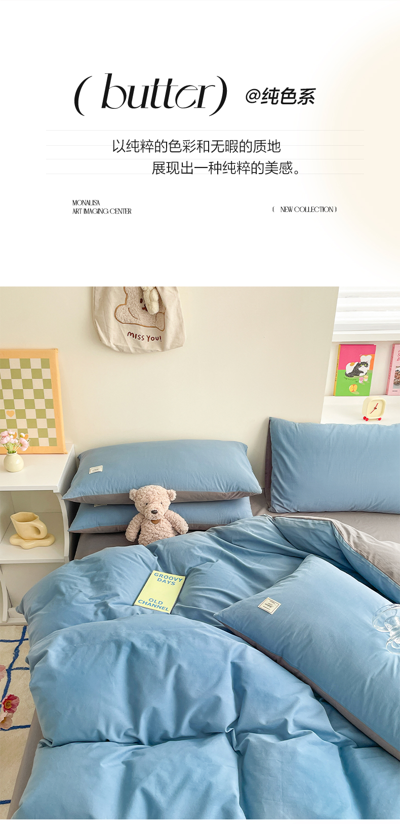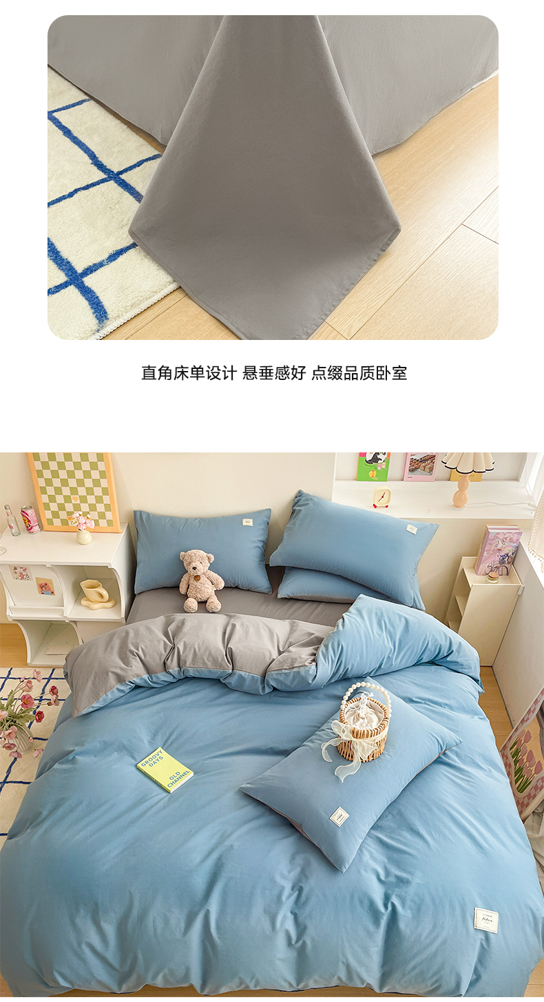 雅居纺家纺 2024新款全棉素色水洗棉四件套 清雅蓝绅士灰