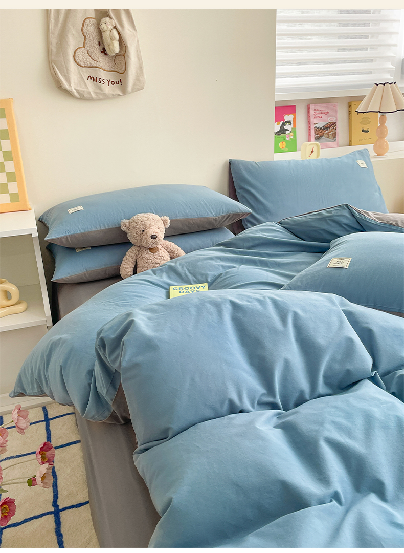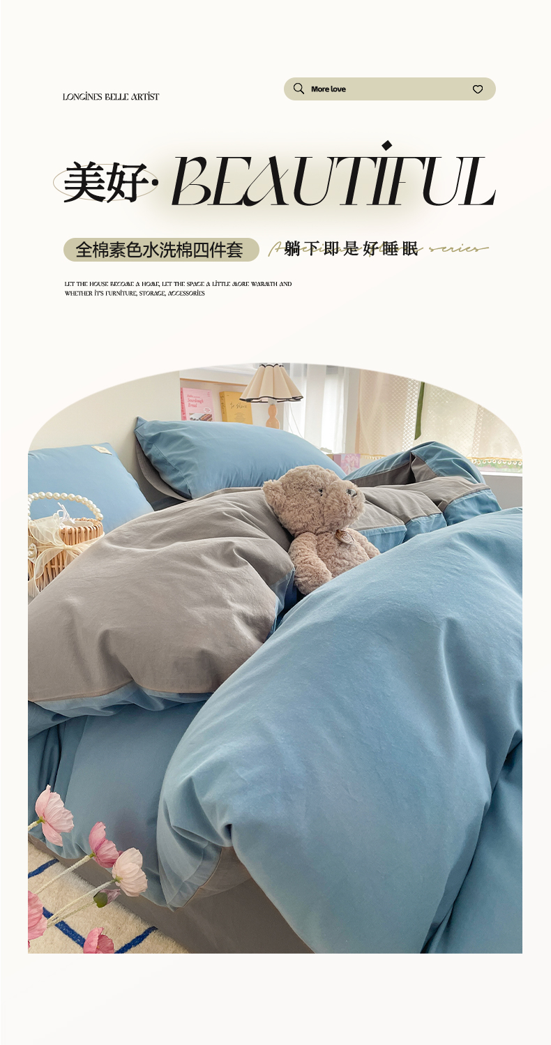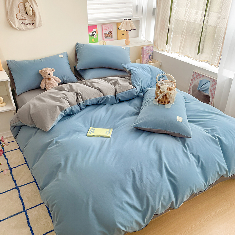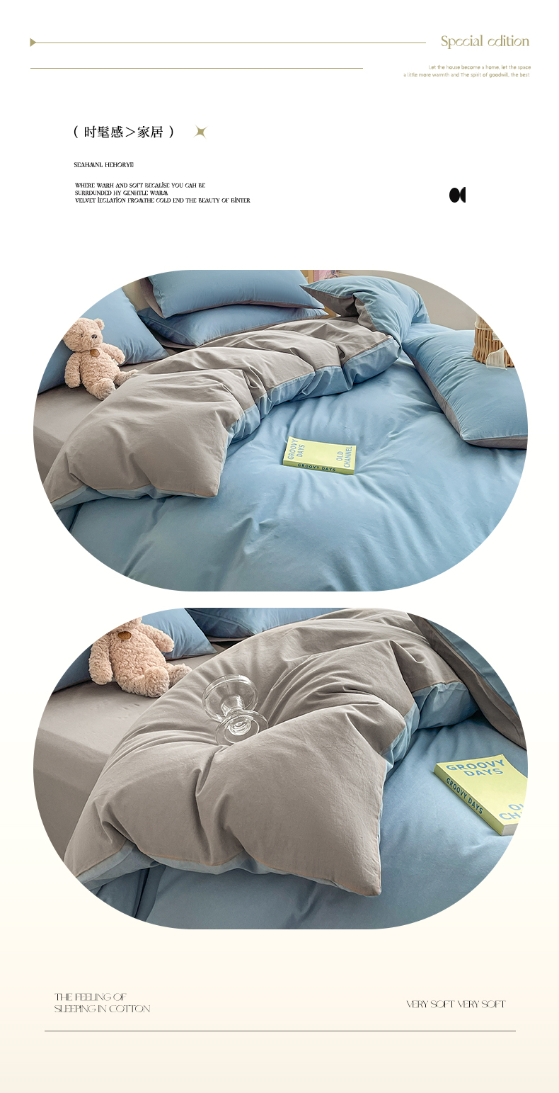 雅居纺家纺 2024新款全棉素色水洗棉四件套 清雅蓝绅士灰